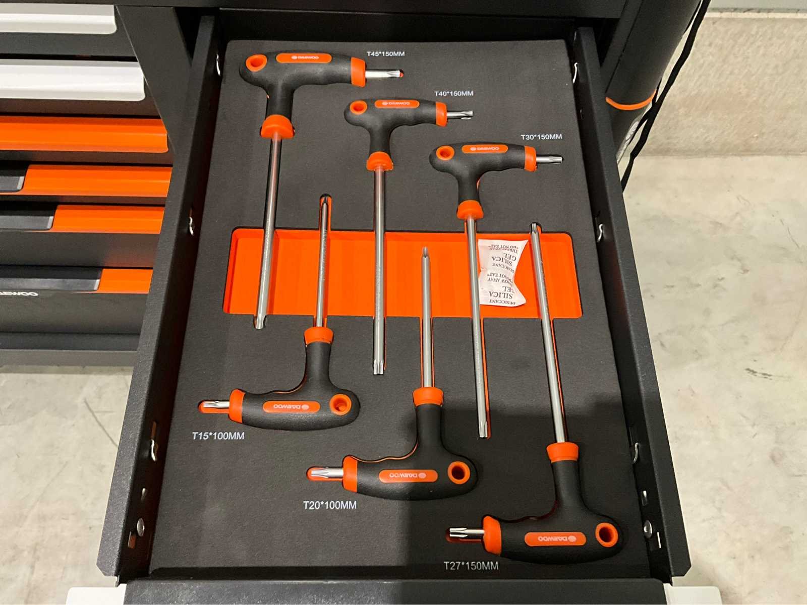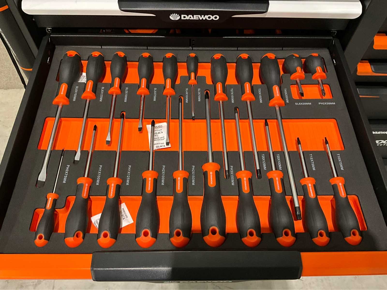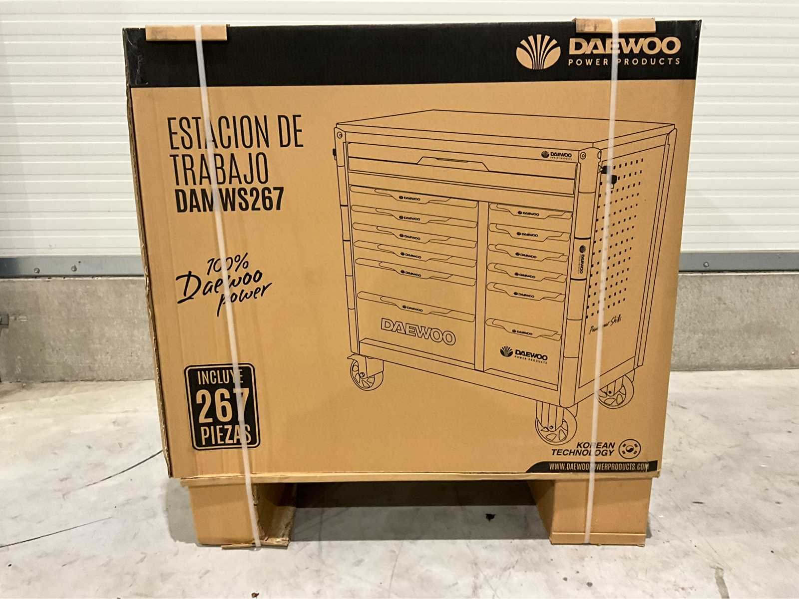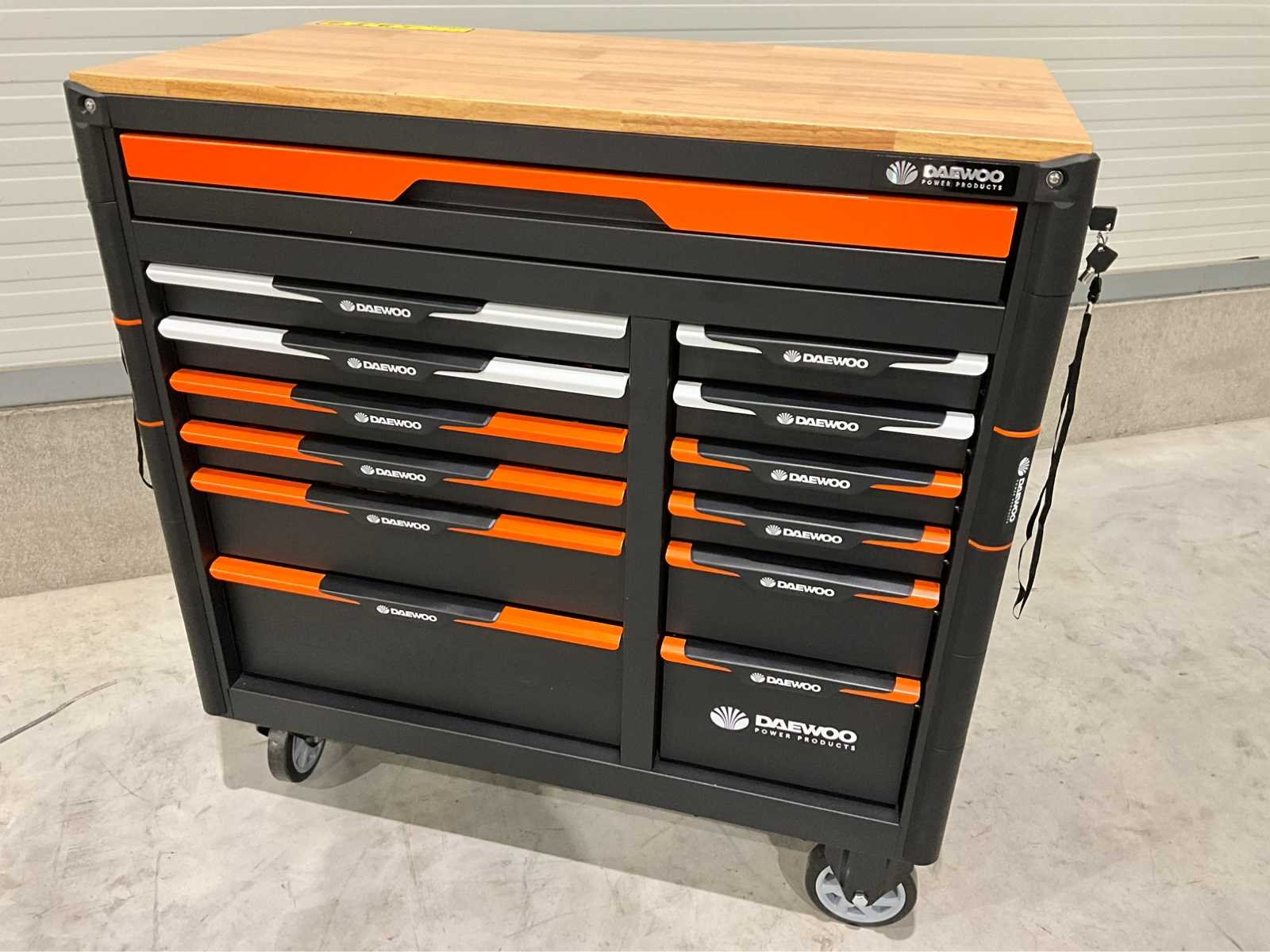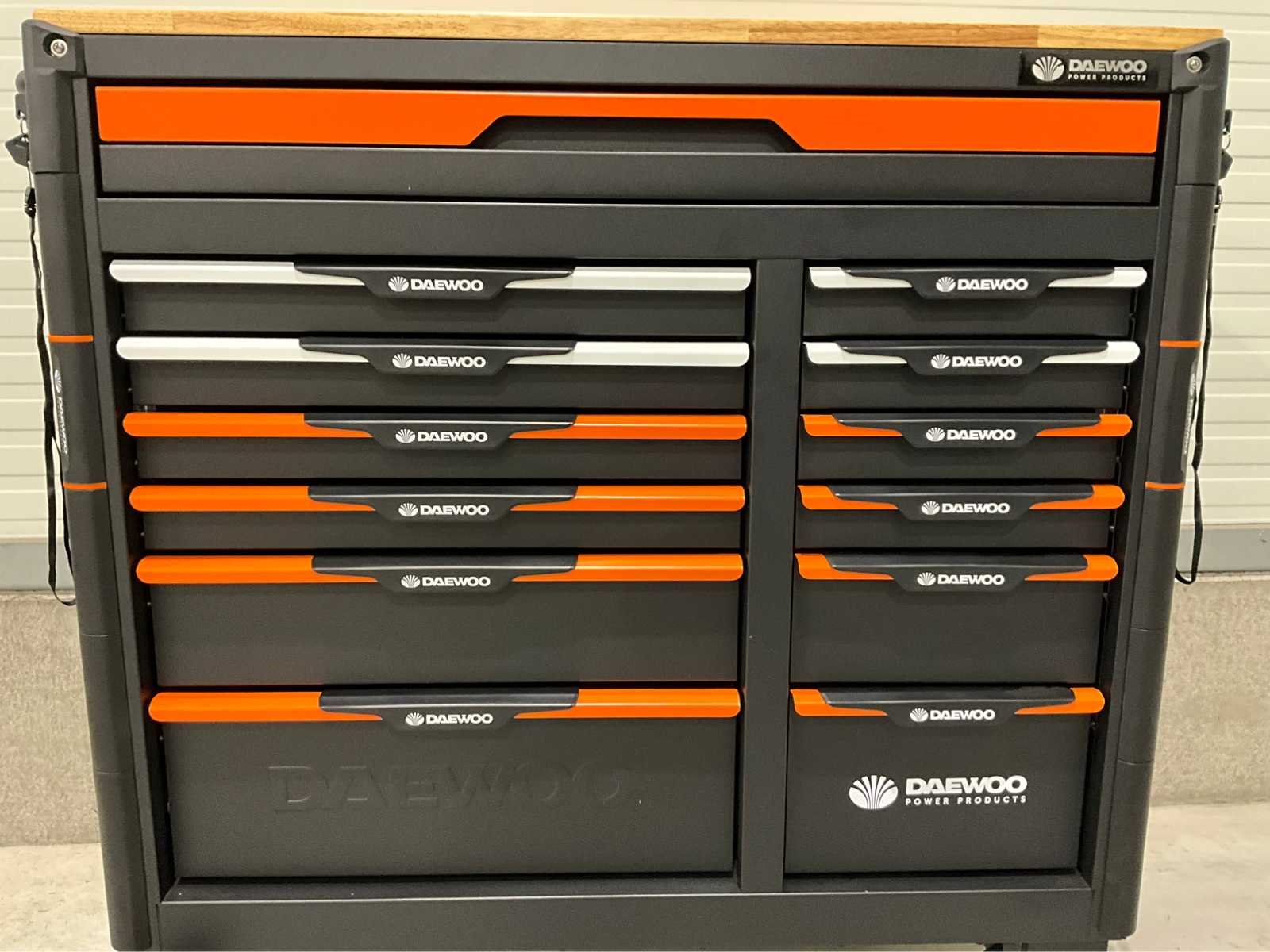 Ongebruikt , 267 delige gereedschapswagen , met zwenkwielen Merk: Daewoo Type: DAMWS267 Bouwjaar: 2026 Aantal laden: 13 Met inhoud: true Eigen gewicht: 154kg Totale afmeting L: 1160mm Totale afmeting Breedte: 550mm Totale afmeting Hoogte: 1100mm