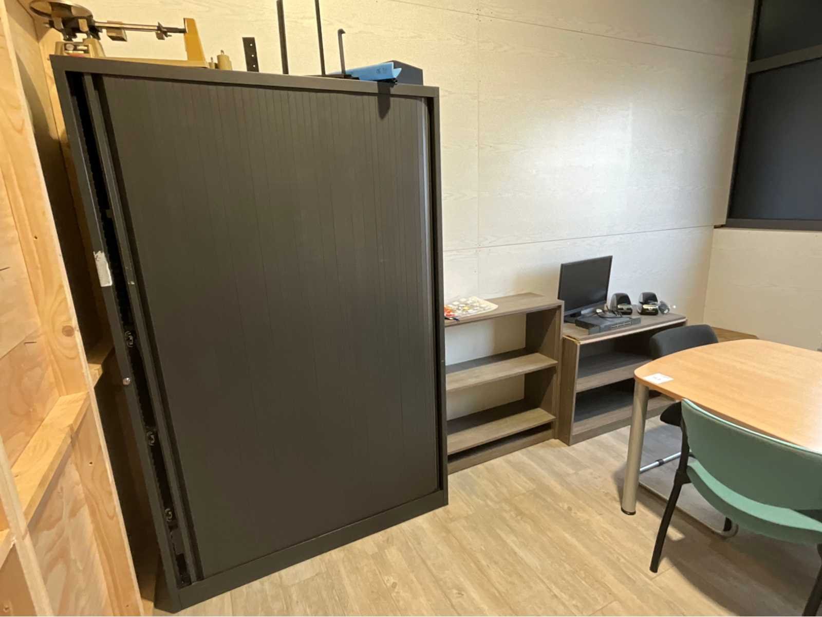 Tafel met stoelen 254x110 cm, roldeurkast 125x50x195 cm, diverse kasten