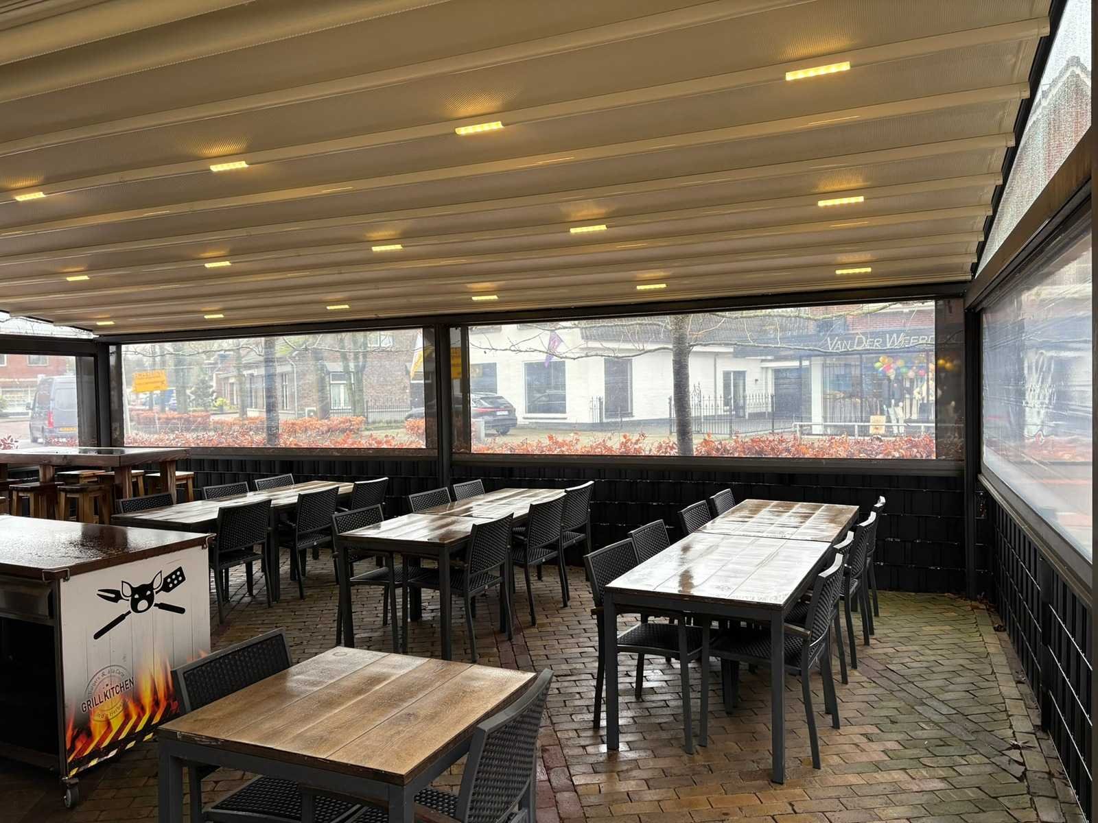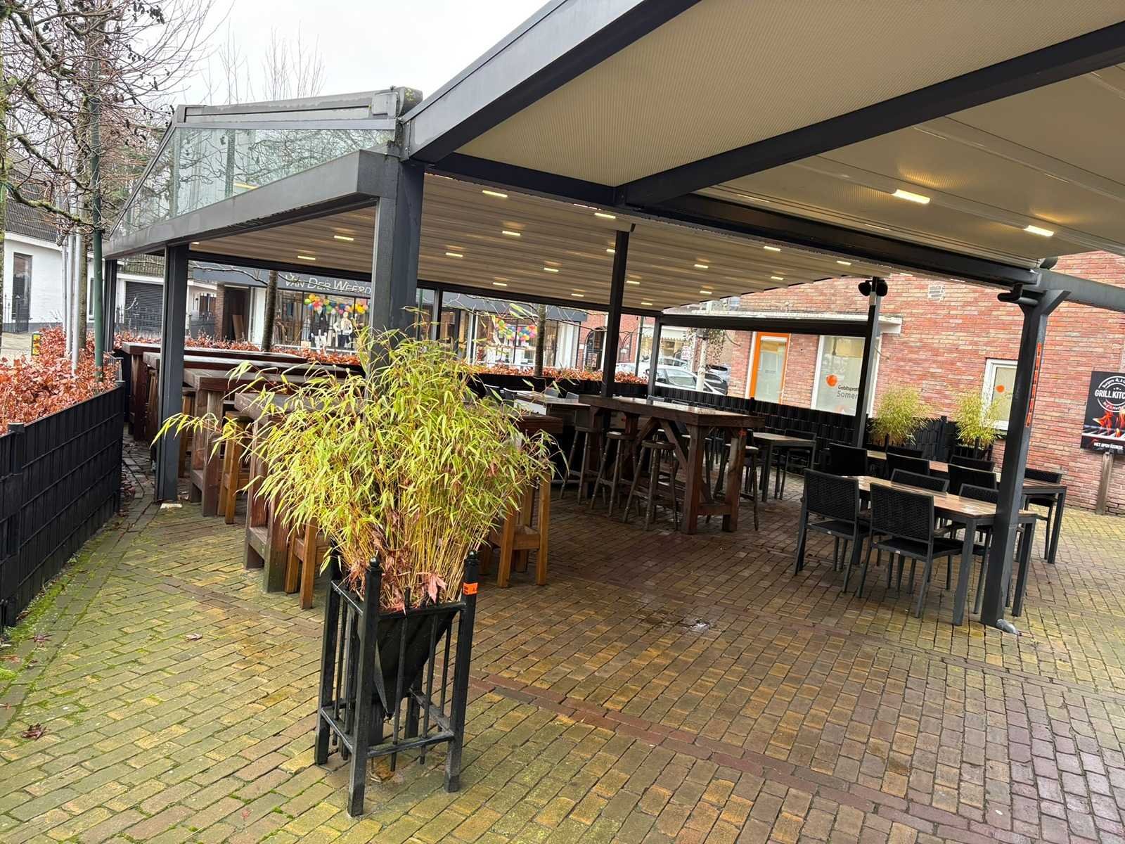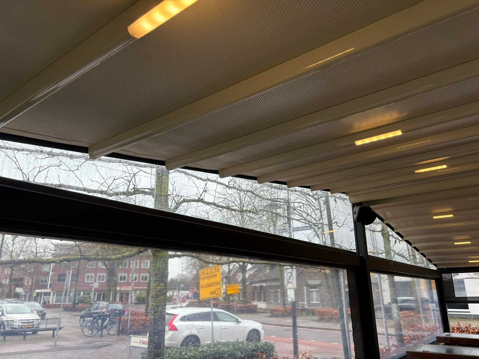 Elektrisch verstelbare screens inclusief aanloop overkapping van 500x420x300cm Lengte: 900cm Breedte: 900cm Hoogte: 300-246cm
