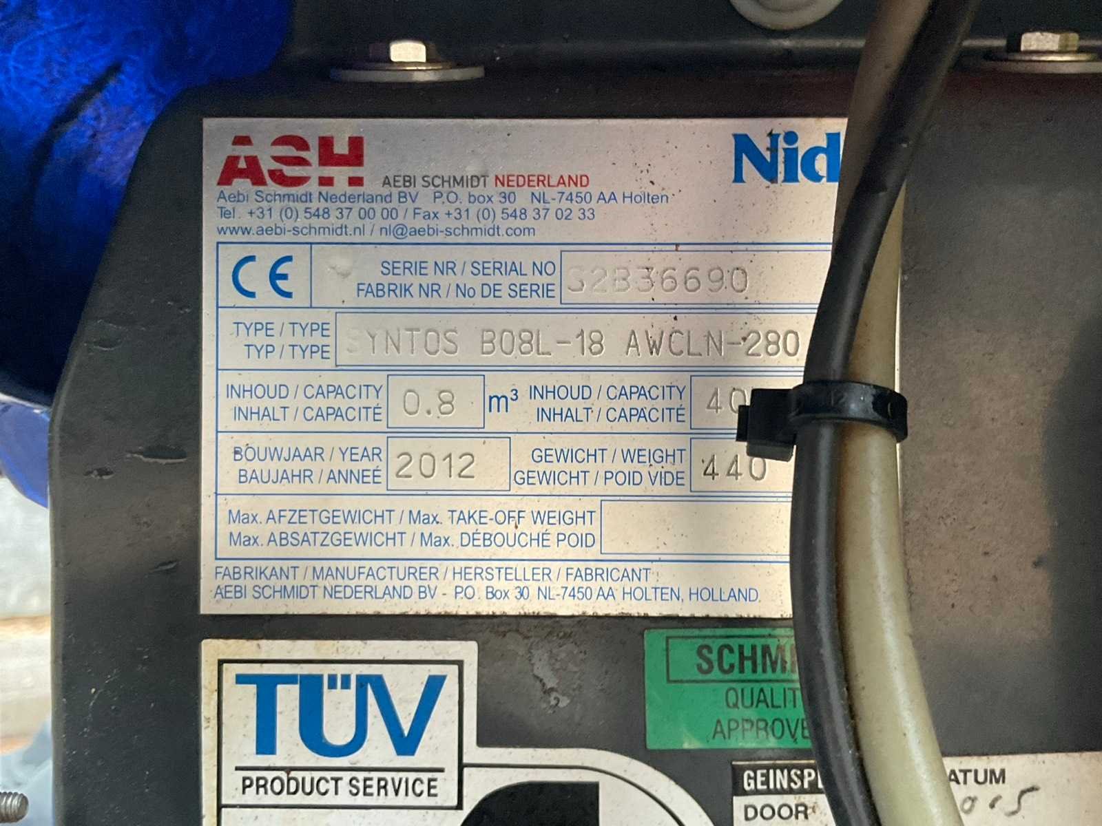 Type Syntos B08L-18 AWCLN-280; inhoud 0.8 m3; cap. 400 liter Merk: Nido Type: Syntos B08L-18 Bouwjaar: 2012 Eigen gewicht: 440kg Totale afmeting L: 4200mm Totale afmeting Breedte: 1600mm Totale afmeting Hoogte: 1600mm