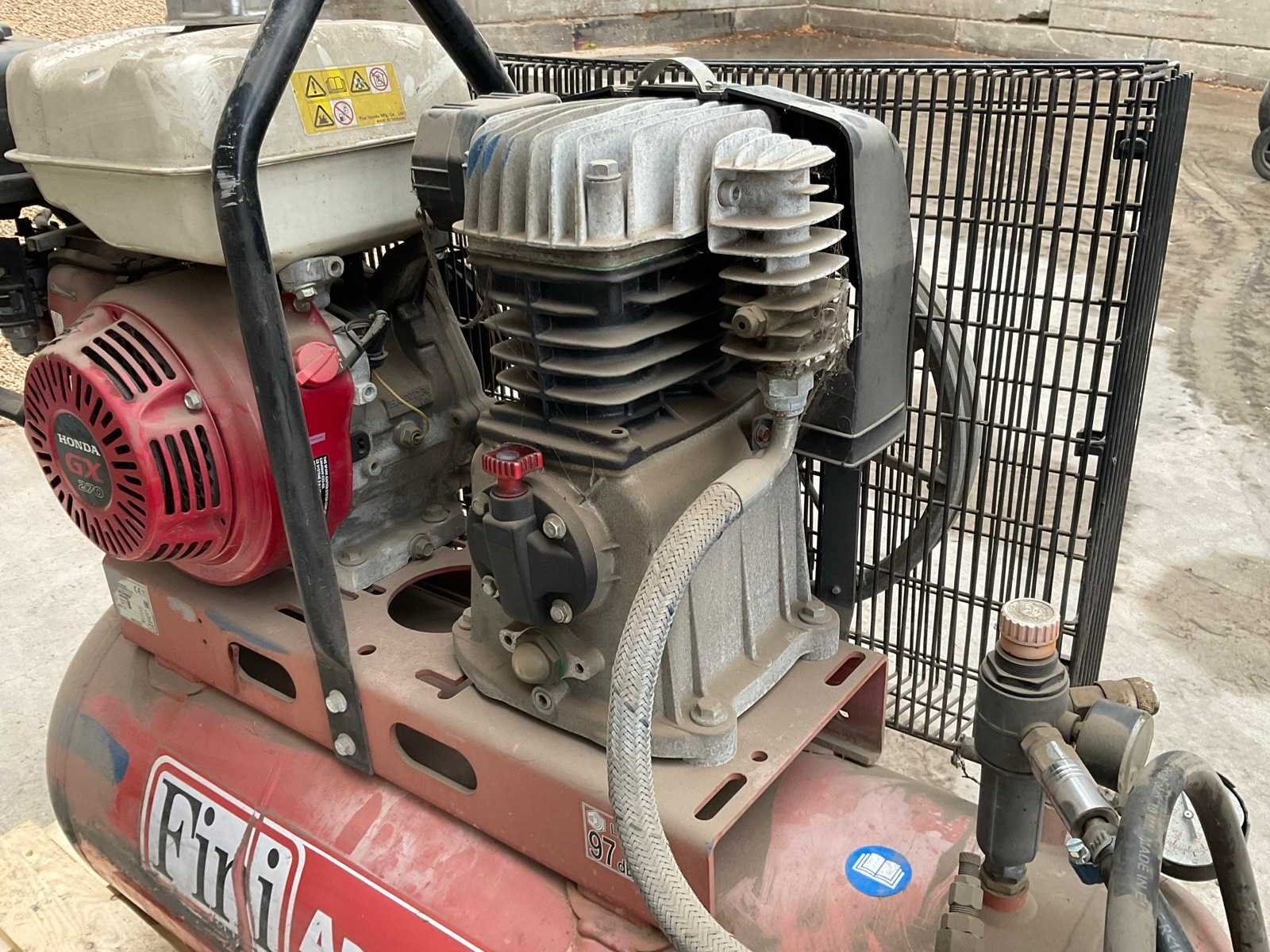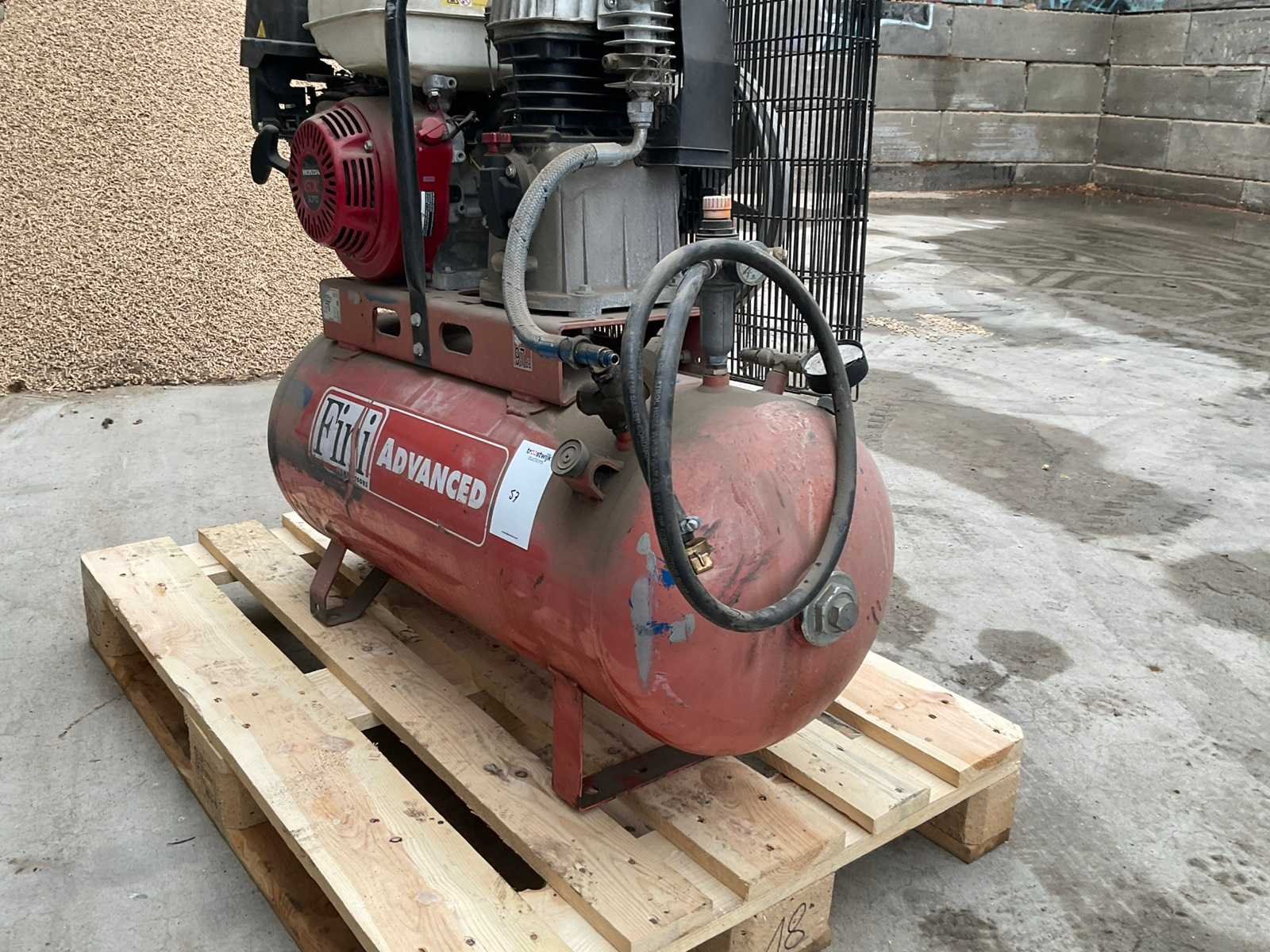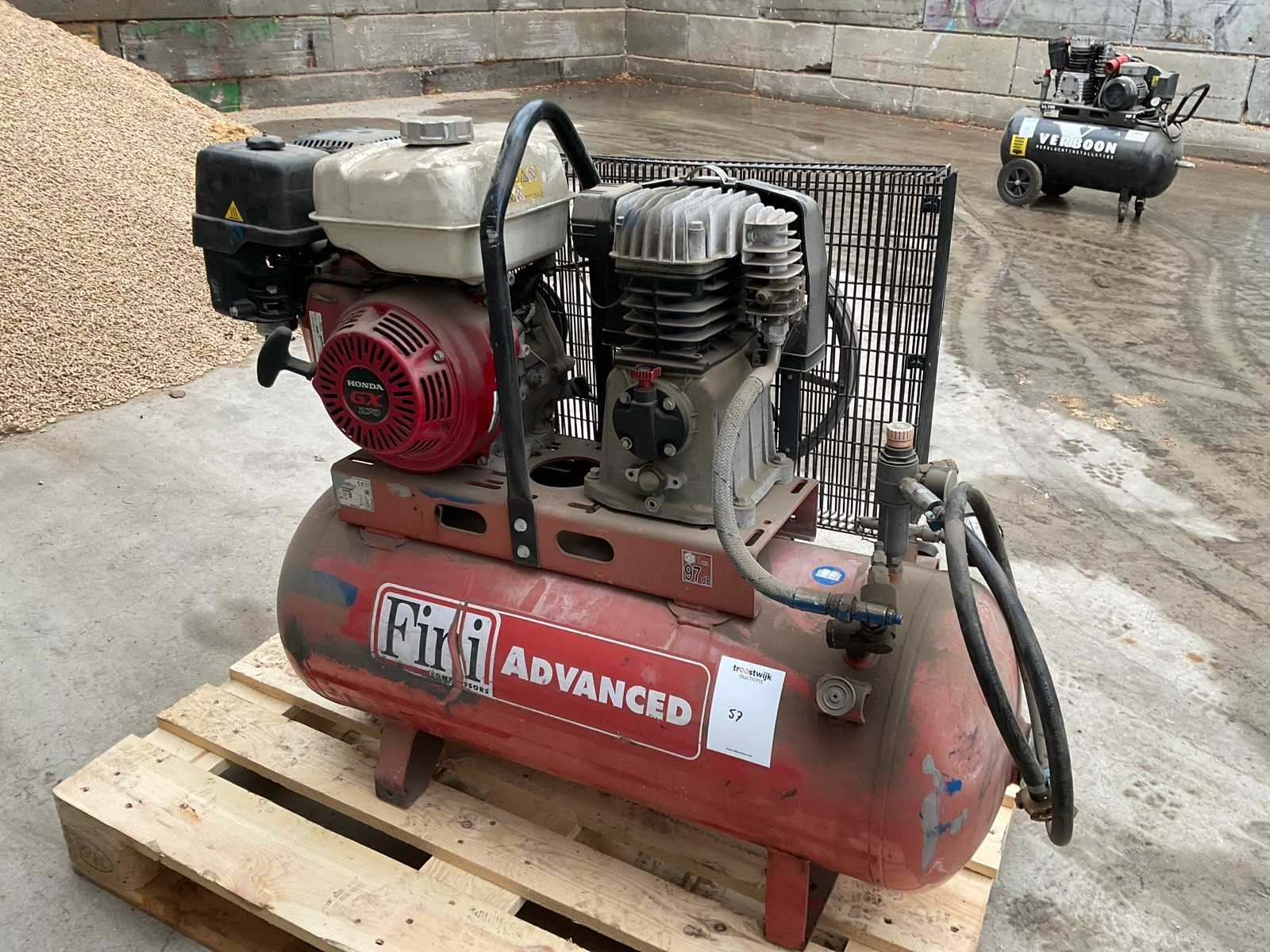 V.v. “Honda” benzinemotor; type GX270 Merk: Fini Type: MK113-100-9S Mobiel: true Capaciteit.: 10bar Luchtstroom: 556l/min Vermogen: 7kW Buffertank inhoud: 100l