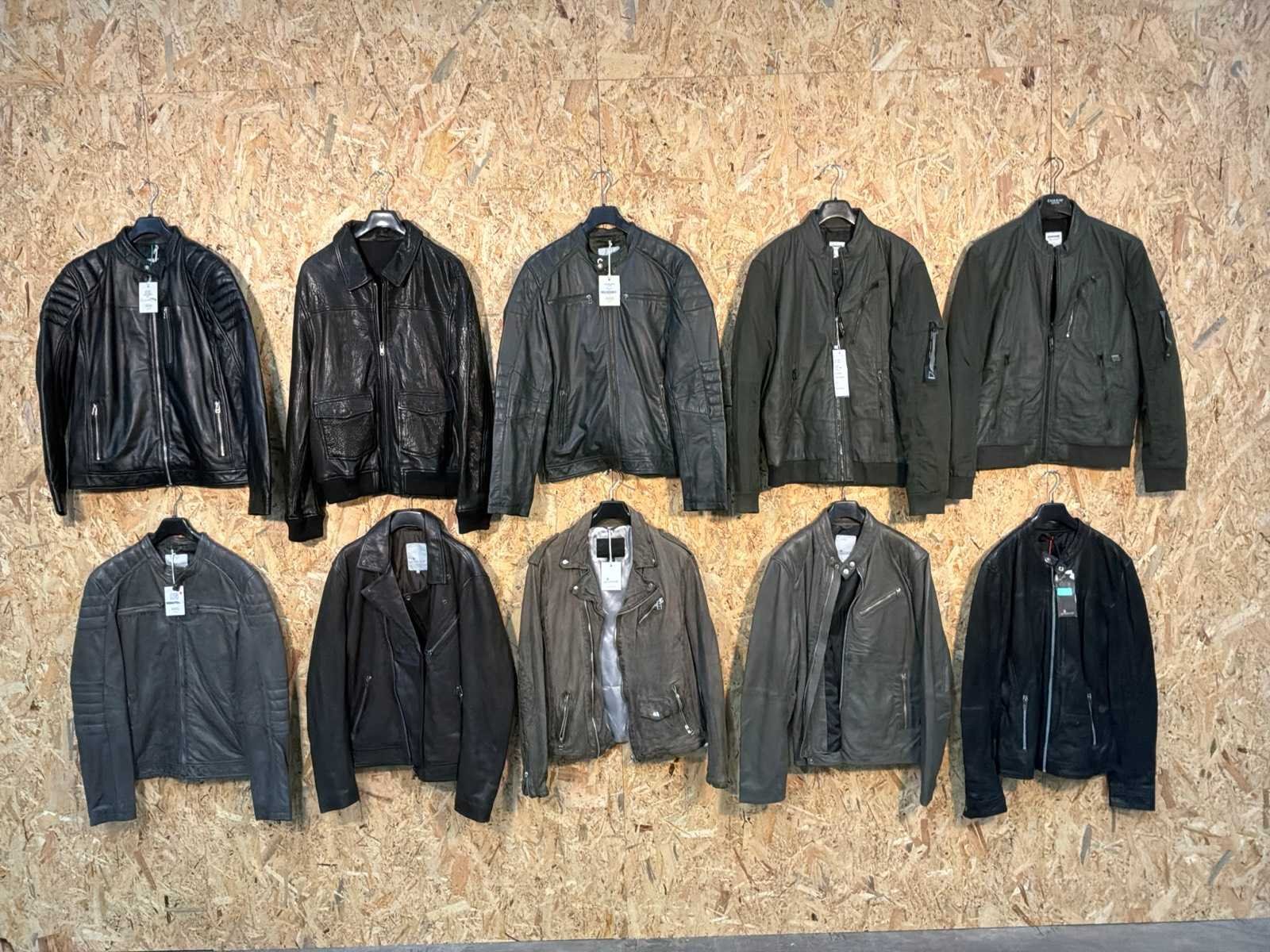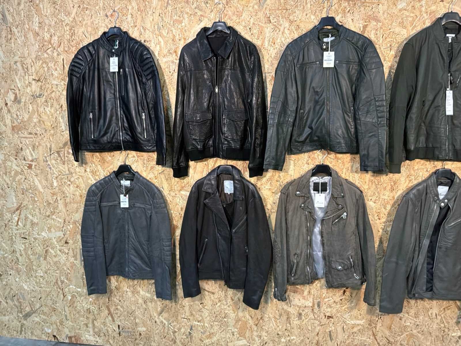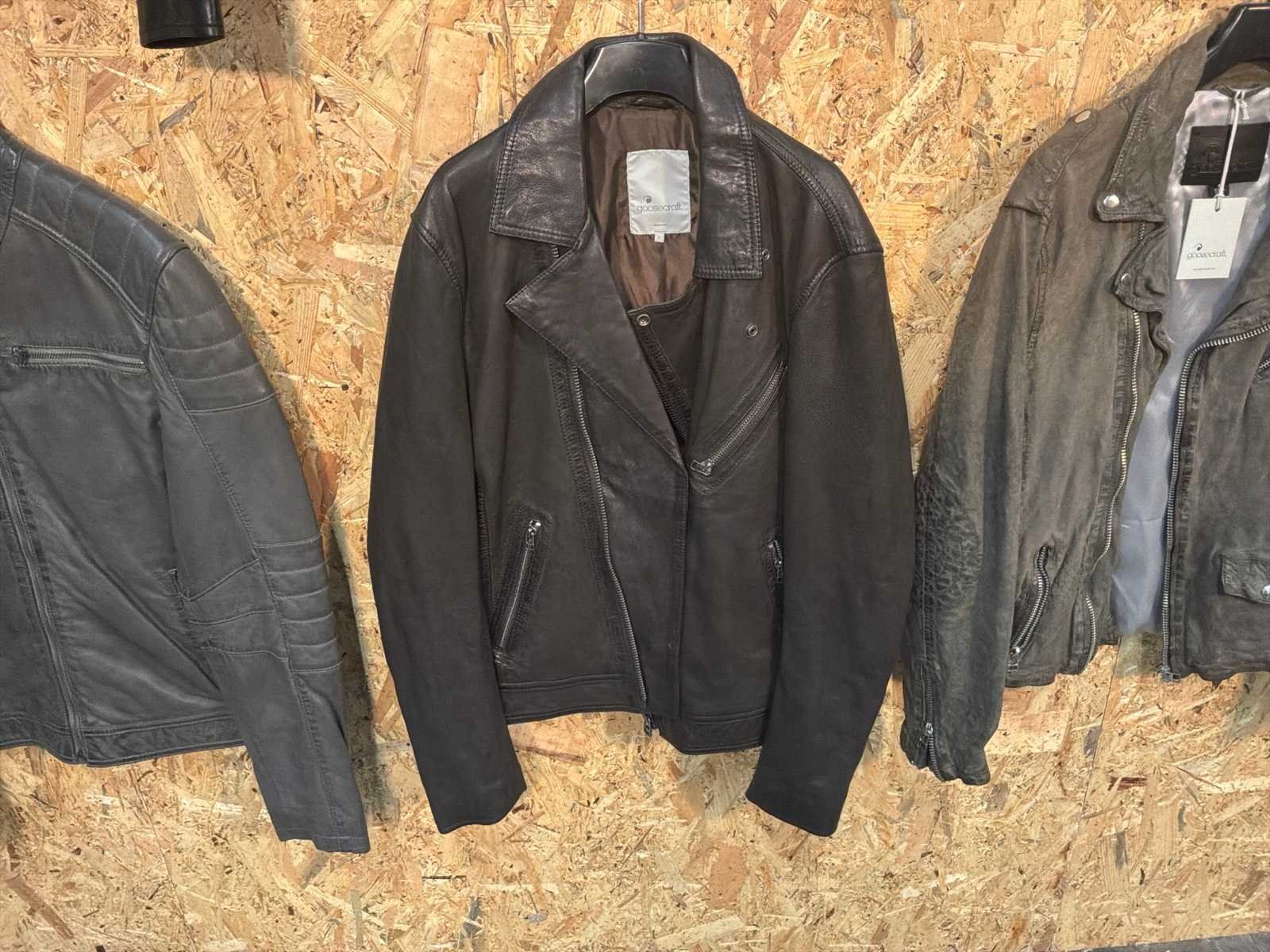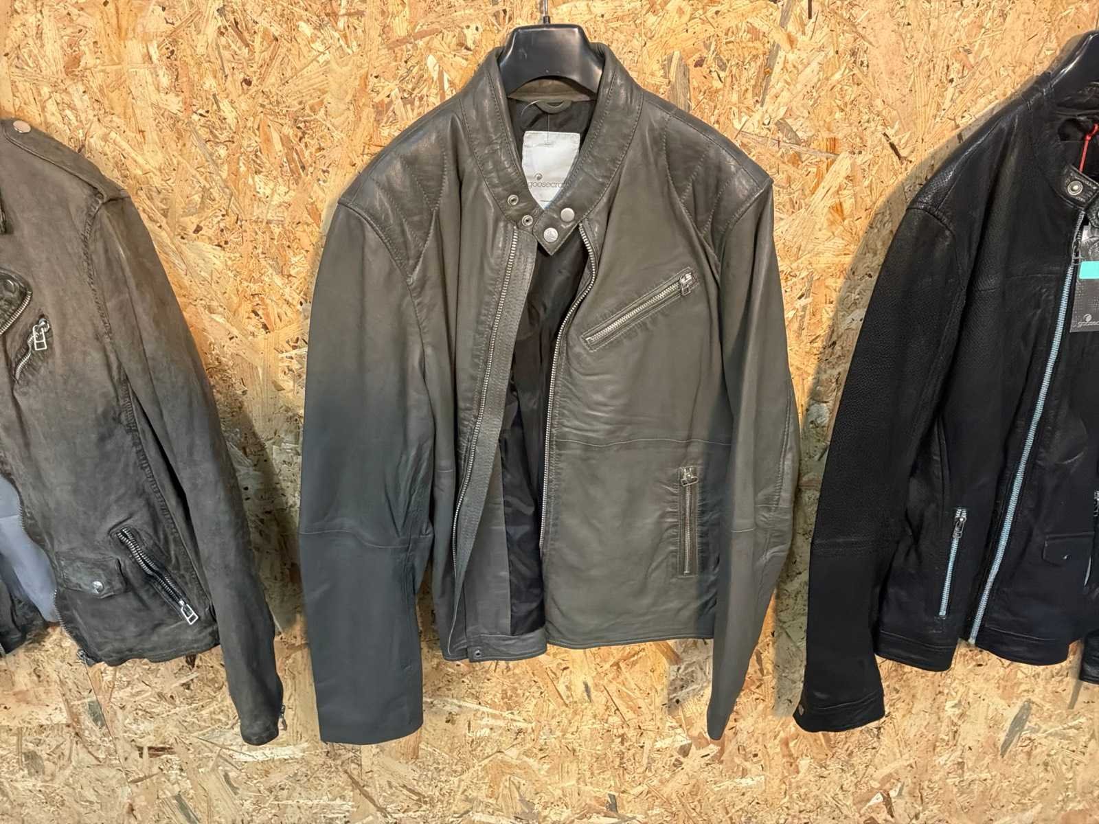 Diverse heren leren jassen en vesten in verschillende modellen, kleuren en maten. Inclusief kledinghangers. Mochten erop de items beveiligingstags zitten worden deze nog verwijderd voor de uitleverdag. Merk: Goose-craft