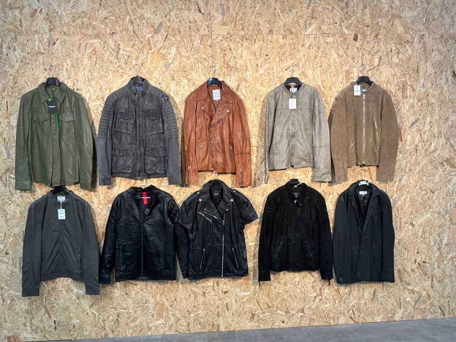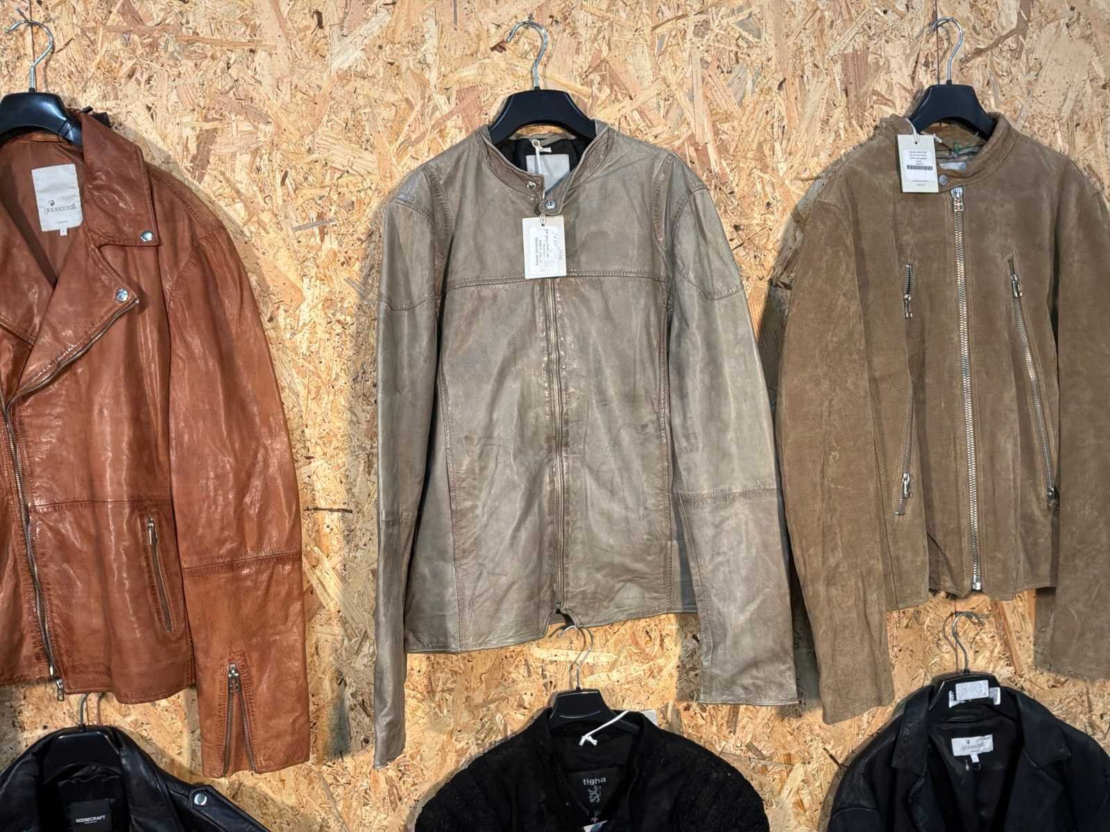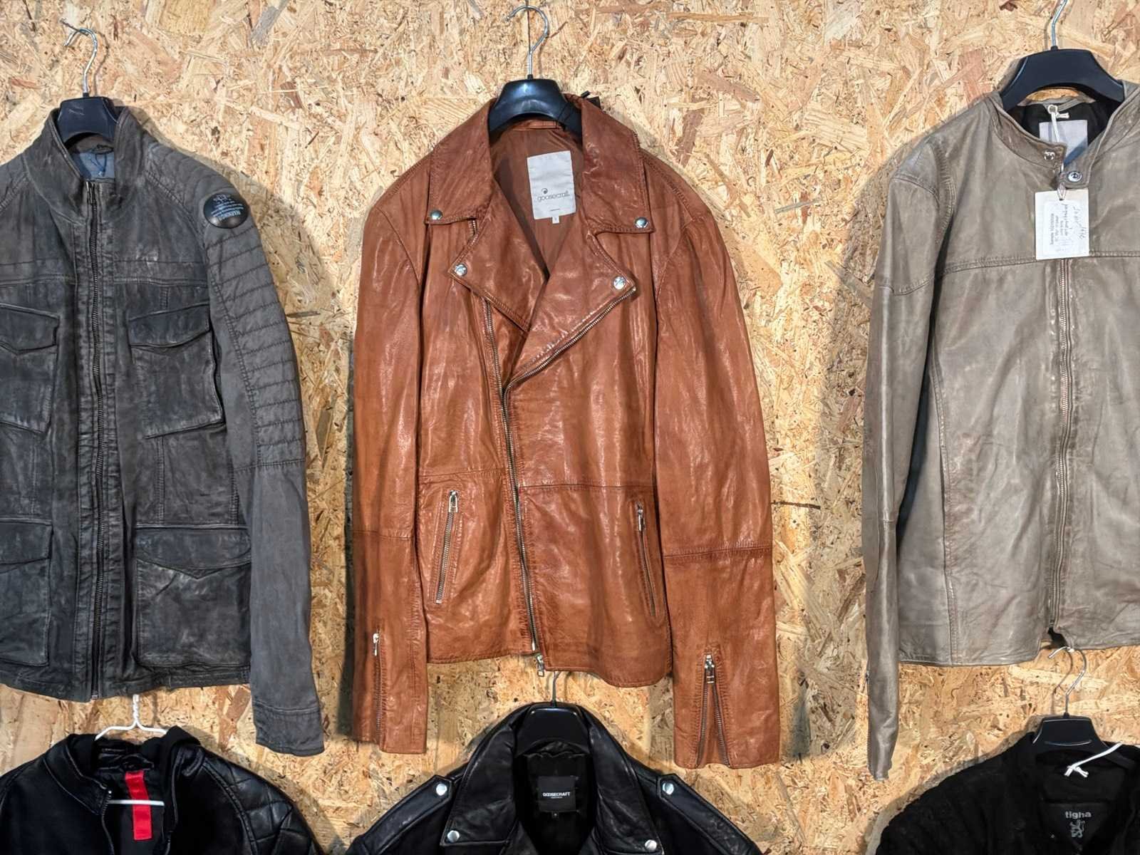 Diverse dames en heren leren jassen en vesten in verschillende modellen, kleuren en maten. Inclusief kledinghangers. Mochten erop de items beveiligingstags zitten worden deze nog verwijderd voor de uitleverdag. Merk: Goose-craft