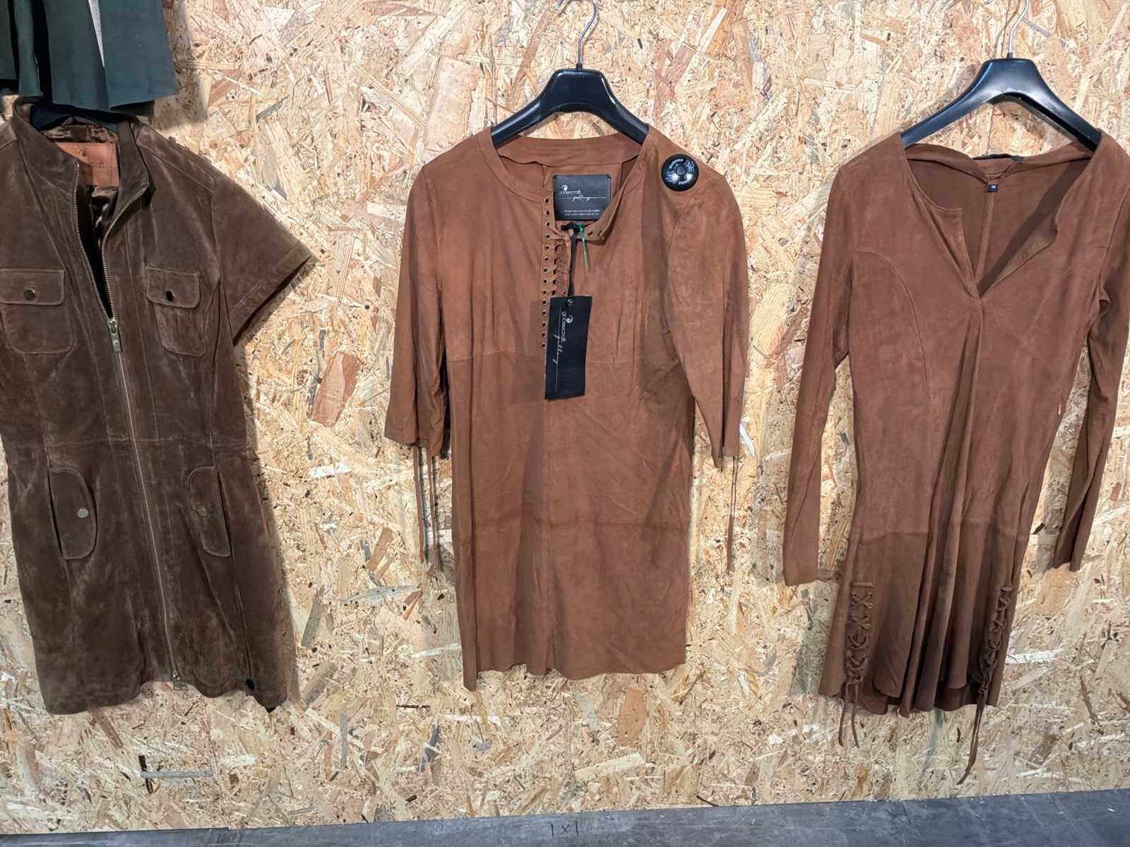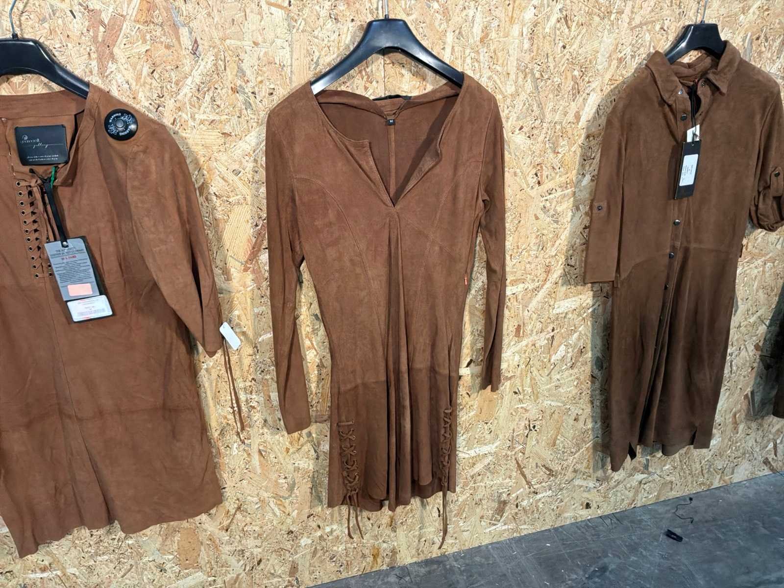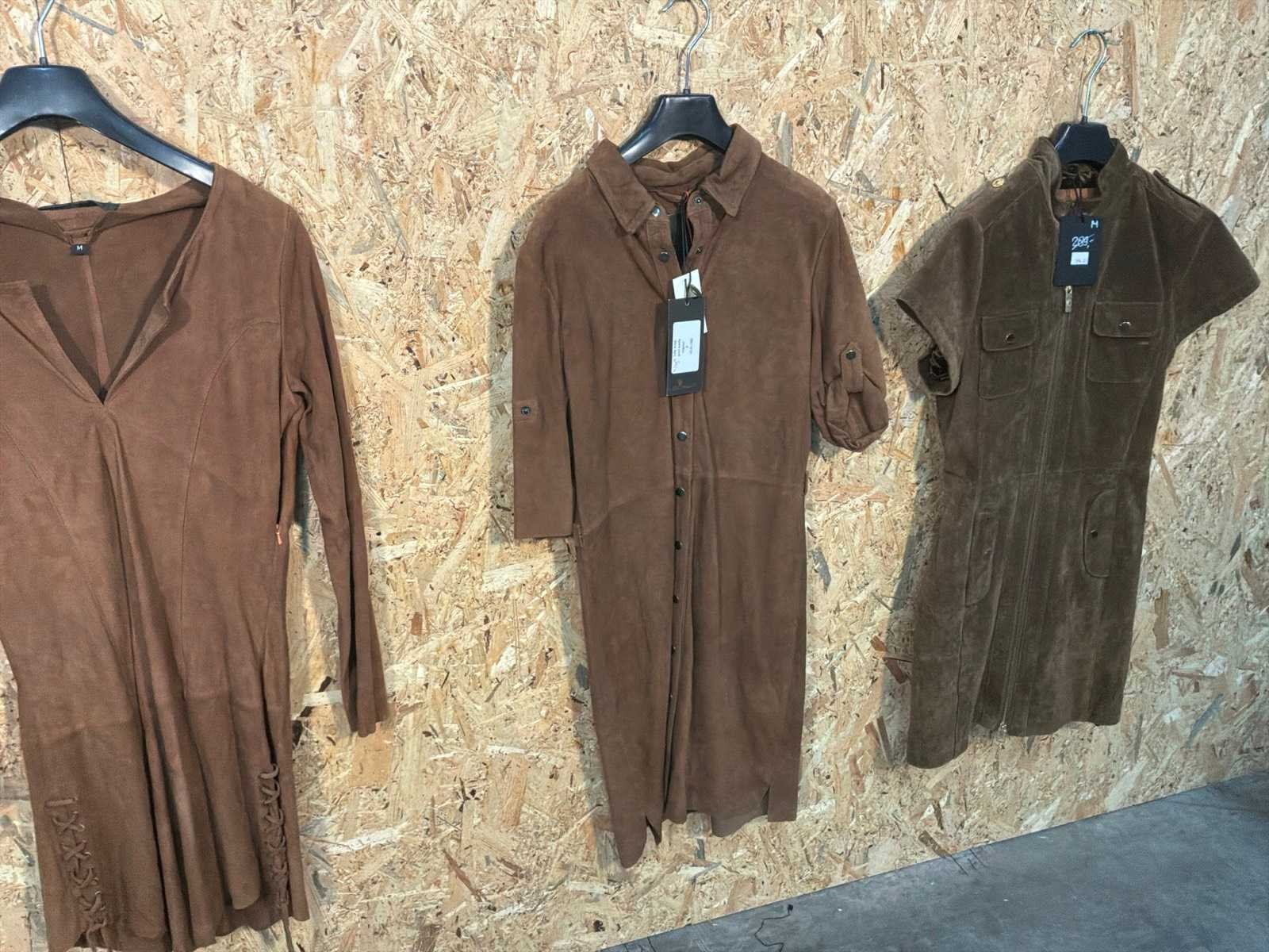 Diverse leren dames jurken in verschillende modellen, kleuren en maten. Inclusief kledinghangers. Mochten erop de items beveiligingstags zitten worden deze nog verwijderd voor de uitleverdag. Merk: Goose-craft