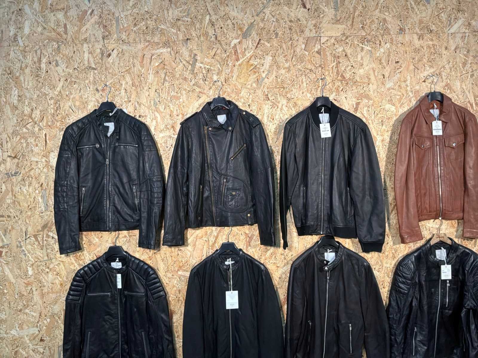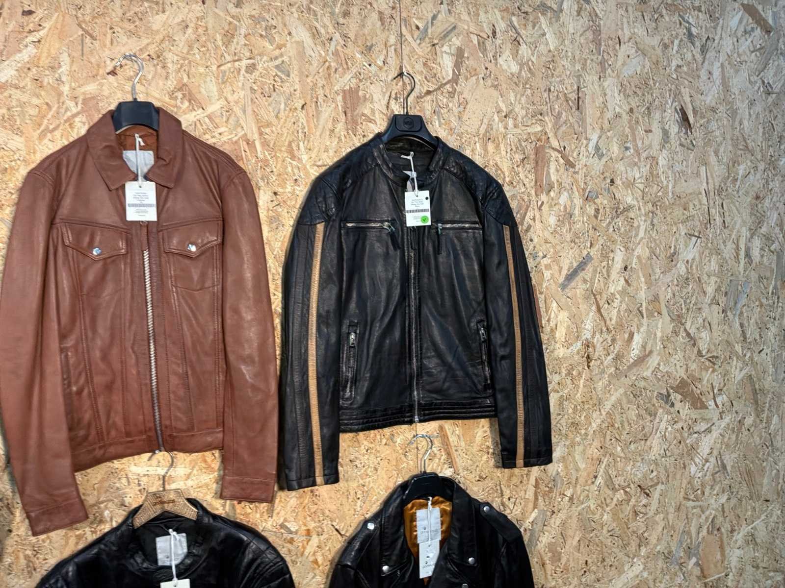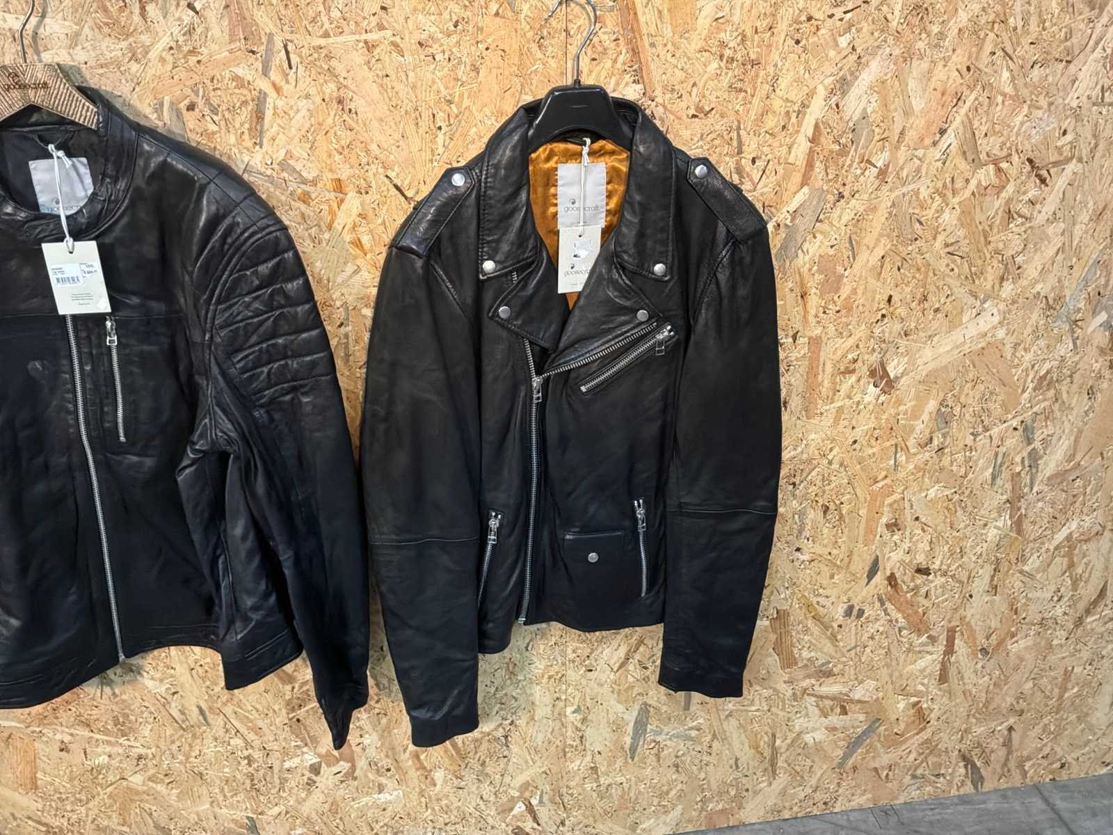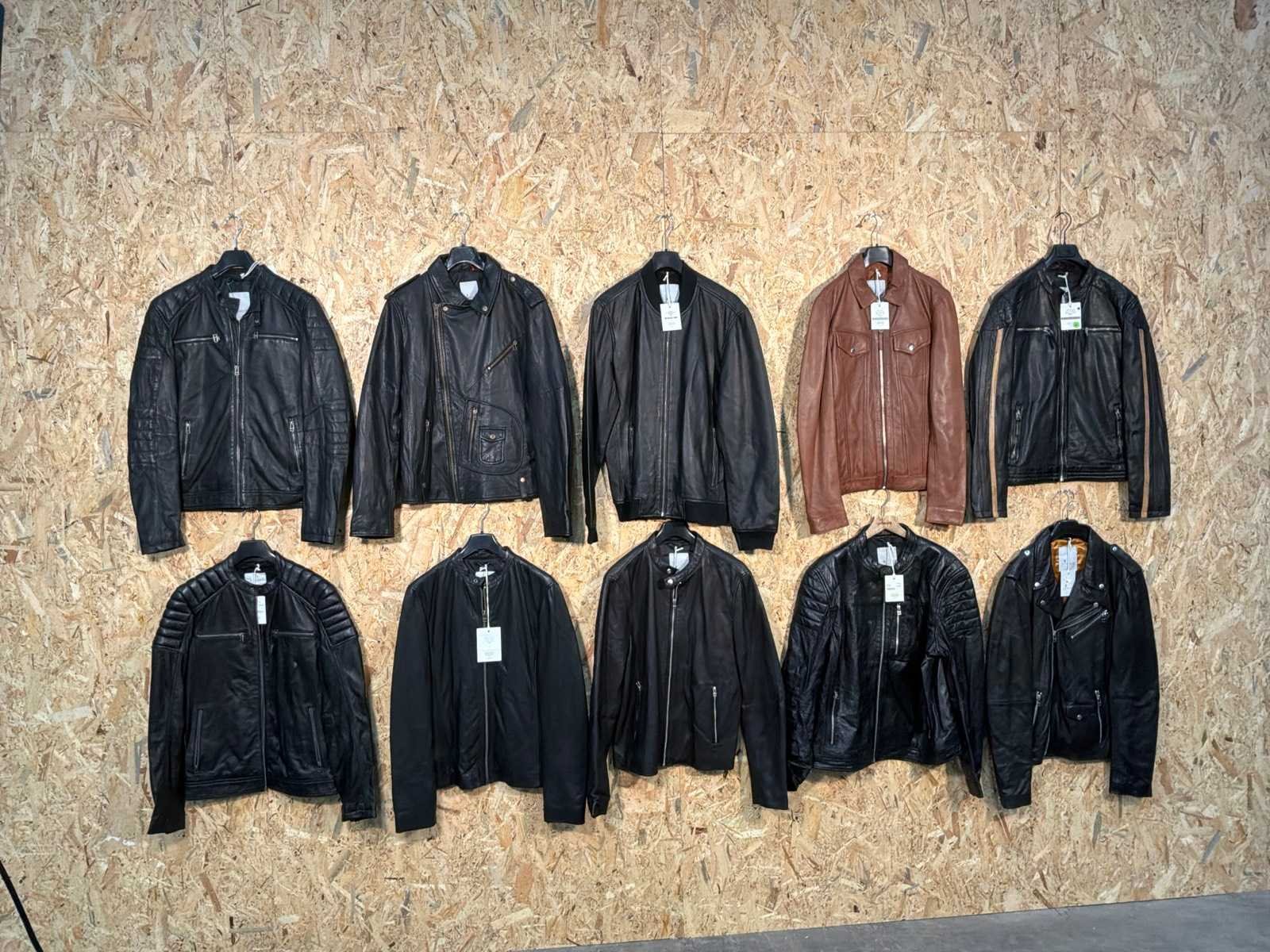 Diverse leren heren jackets in verschillende modellen, kleuren en maten. Inclusief kledinghangers. Mochten erop de items beveiligingstags zitten worden deze nog verwijderd voor de uitleverdag. Merk: Goose-craft