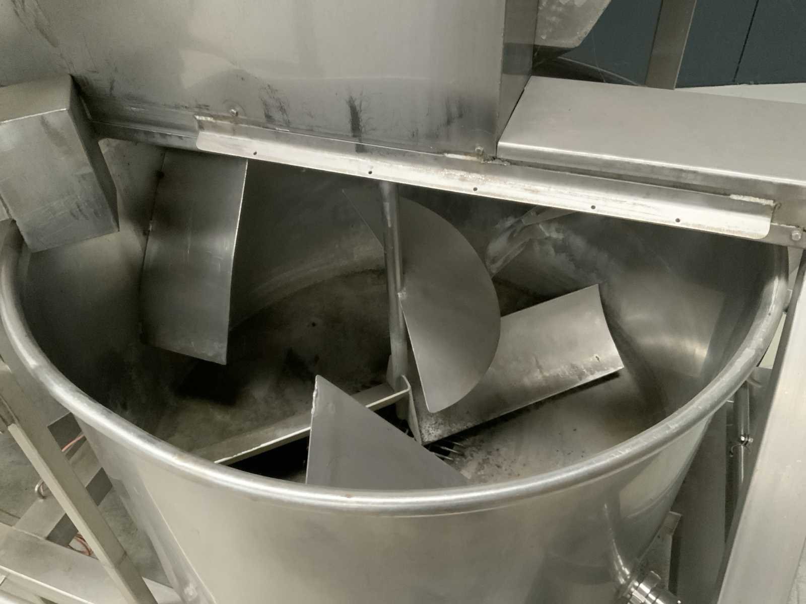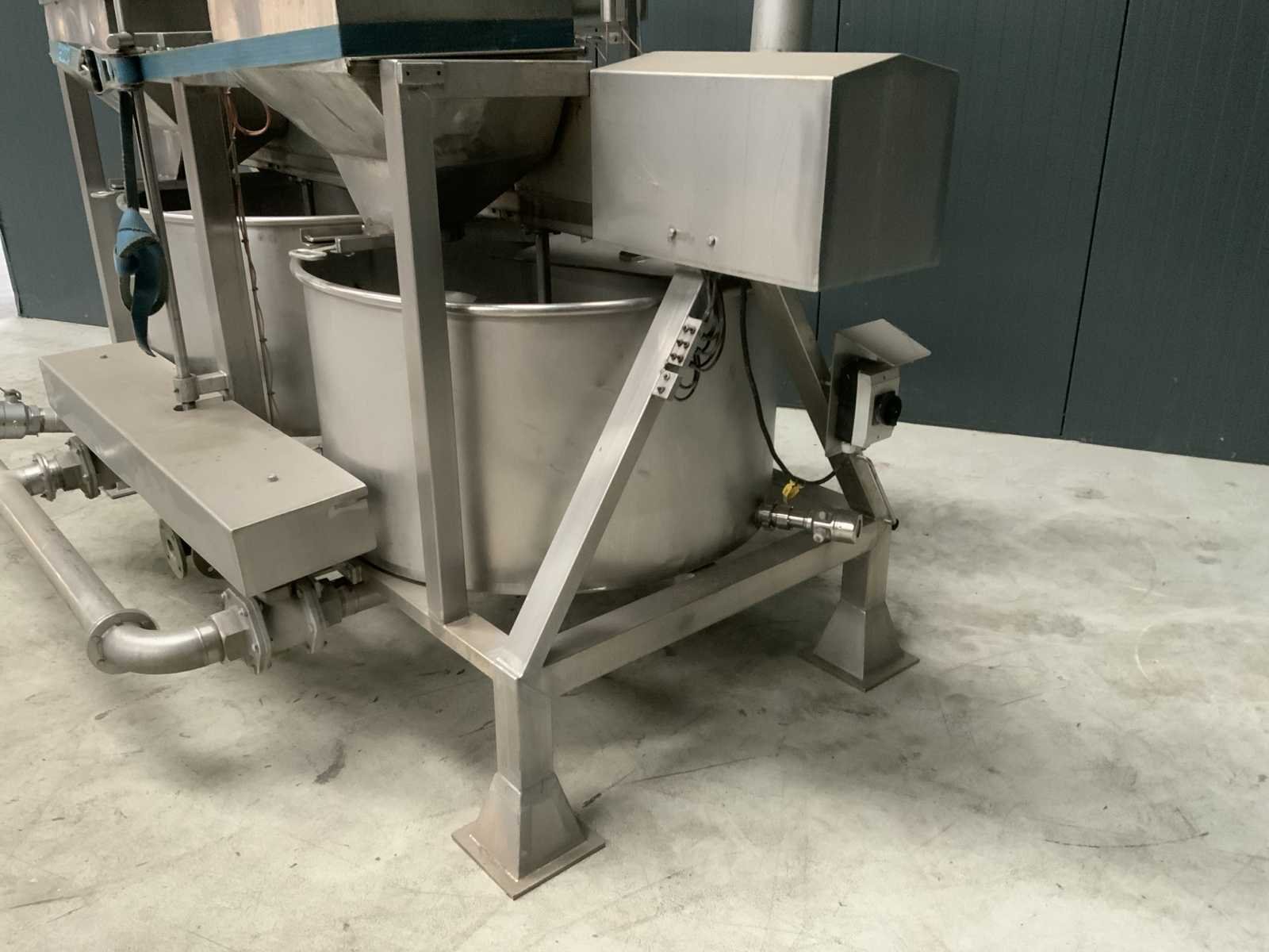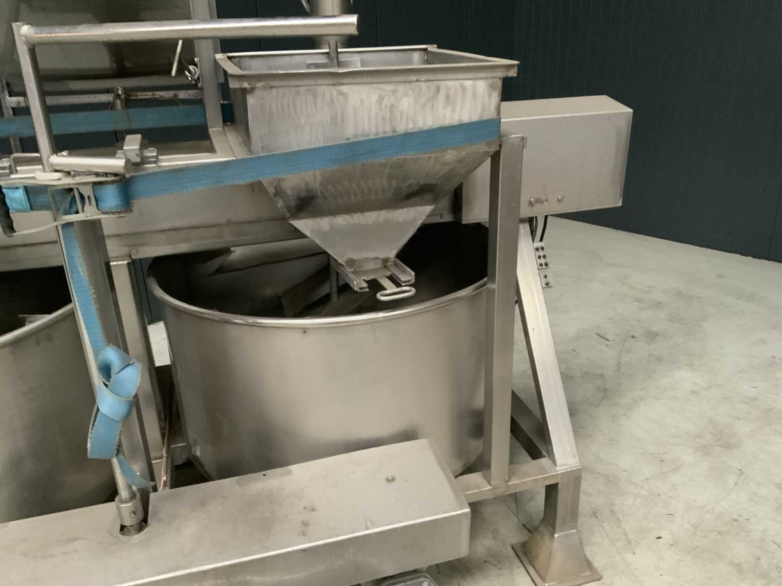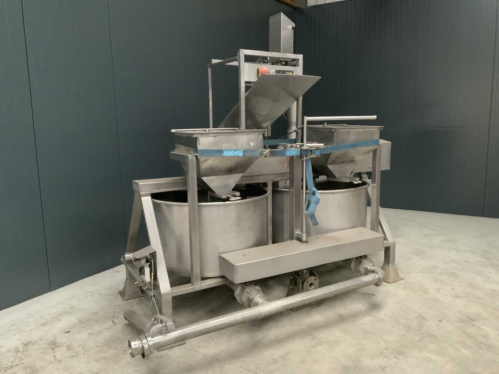 Mengtank met langzaam roterend roerwerk. Afmetingen per stuk: Mengtank diameter: 110cm, Mengtank hoogte: 60cm. Totale afmeting Breedte: 1750mm Totale afmeting L: 3500mm Rvs: true Totale afmeting Hoogte: 2750mm