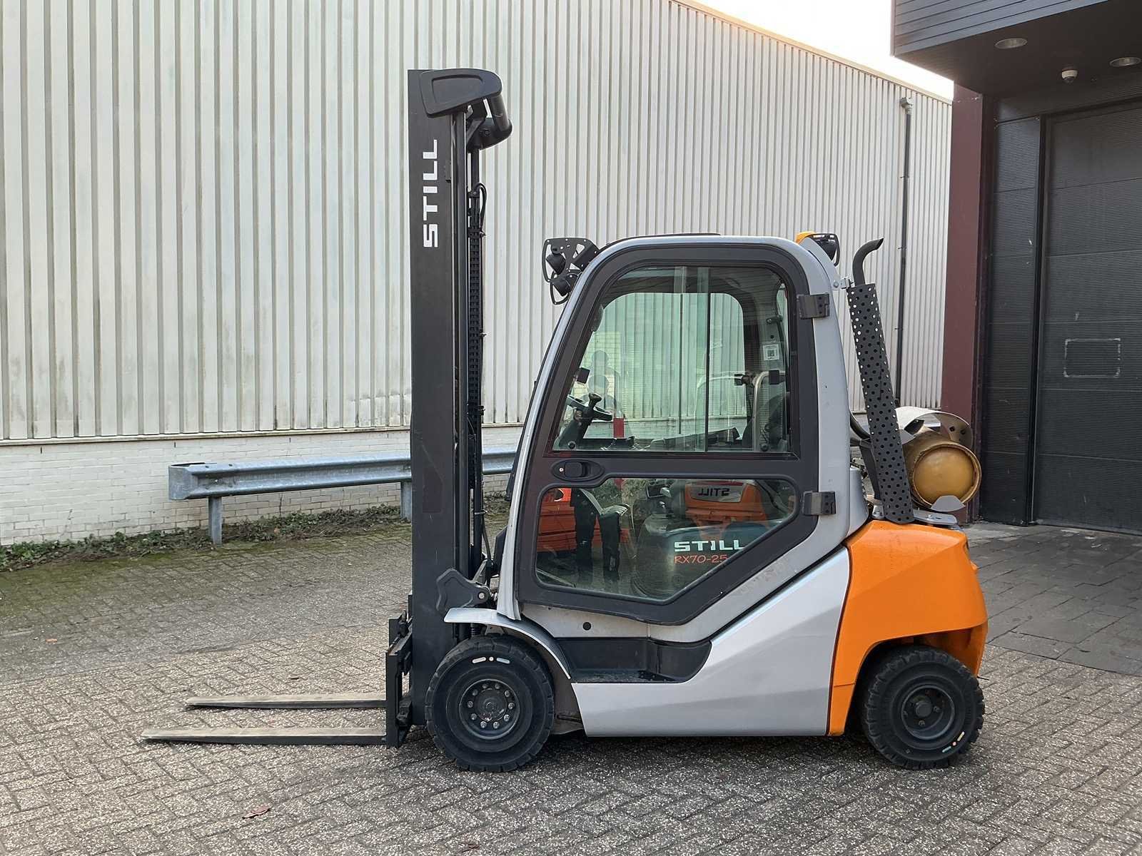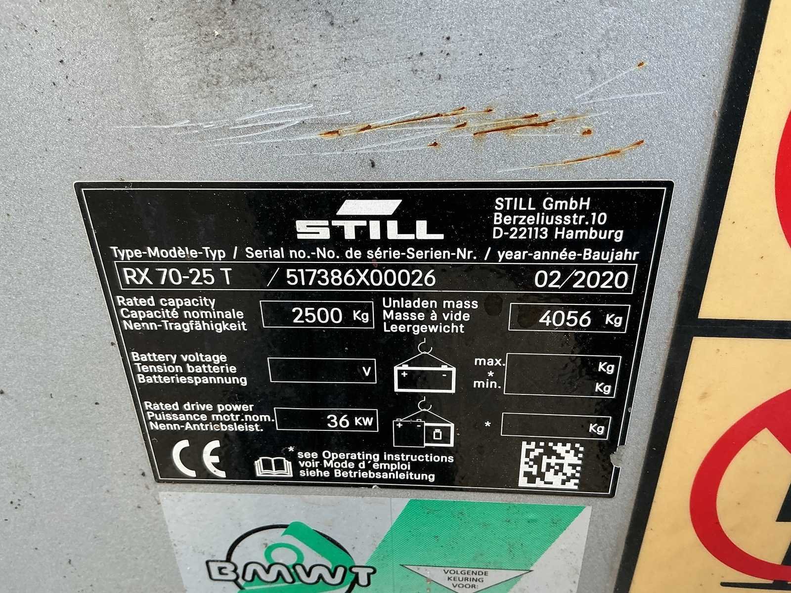Merk: STILL Type: RX70-25 Bouwjaar: 2020 Serienummer: 517386X00026 Brandstof: LPG Mast: Triplex Aantal wielen: 4 Afgelezen urenstand: 4797 Free-lift: true Side-shift: true Triple mast: true Hefvermogen: 2500kg Lepellengte: 1100mm Minimale doorrijhoogte: 2900mm LPG: true