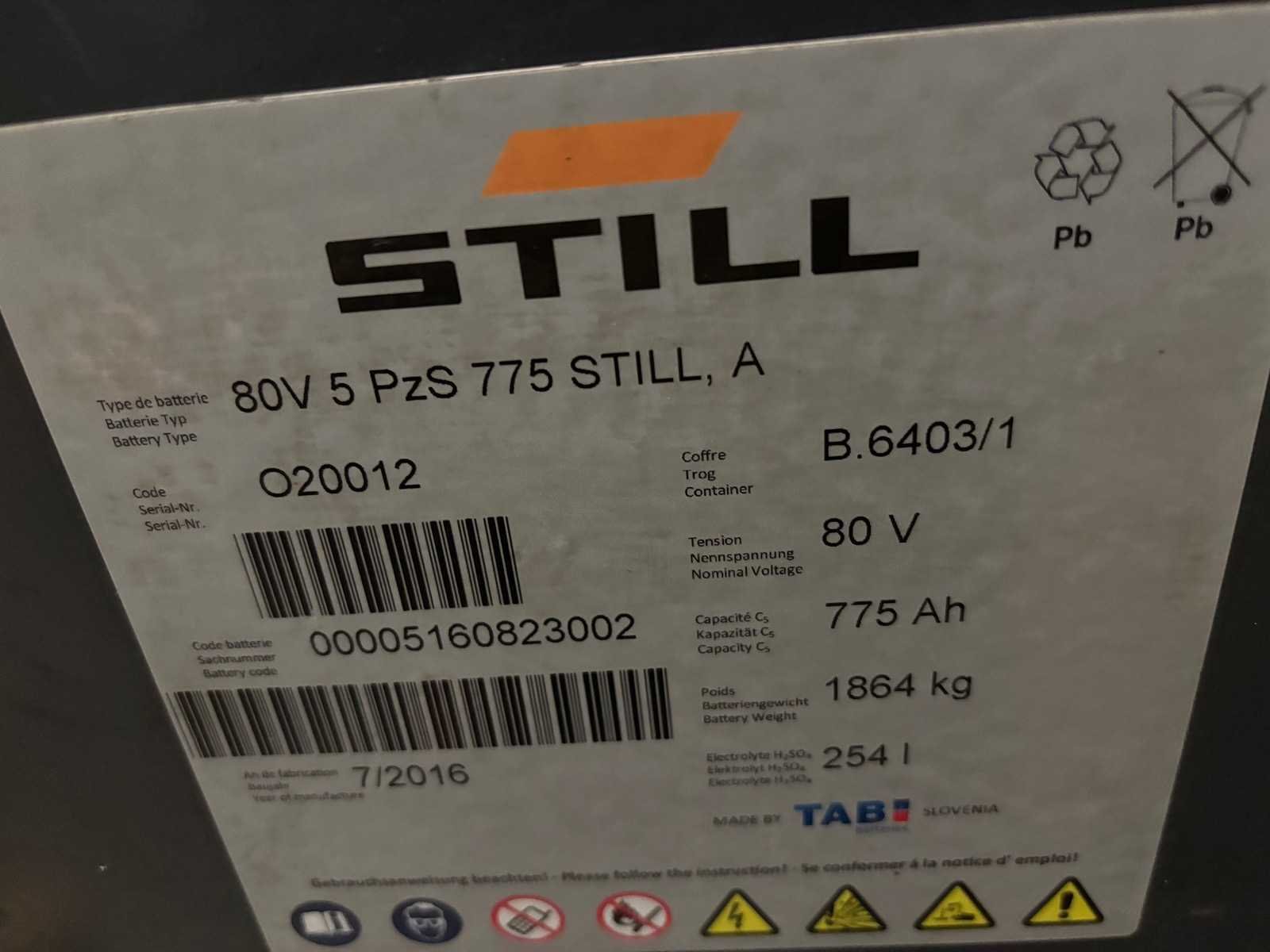 Merk: STILL Type: 80V 5 PzS 775Ah Bouwjaar: 2016 Spanning: 80V Laadstroom: 775A Eigen gewicht: 1864kg Totale afmeting L: 1250mm Totale afmeting Breedte: 850mm Totale afmeting Hoogte: 785mm