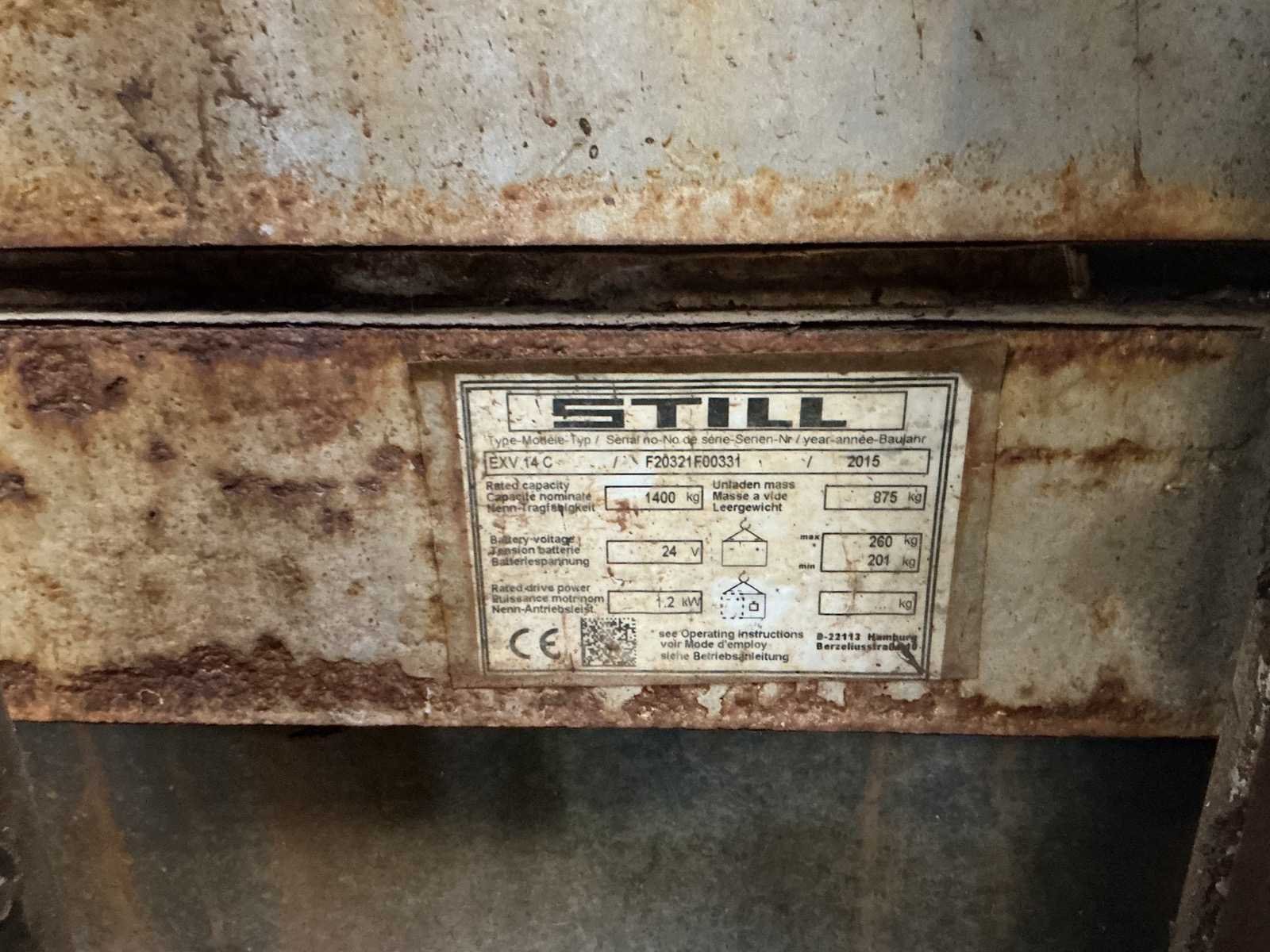 Bevat roest, functioneert wel Merk: STILL Type: EXV 14 C Bouwjaar: 2015 Serienummer: F20321F00331 Hefvermogen: 1400kg Hefhoogte: 3330mm Lepellengte: 950mm Afgelezen urenstand: 1685 Minimale doorrijhoogte: 2120mm