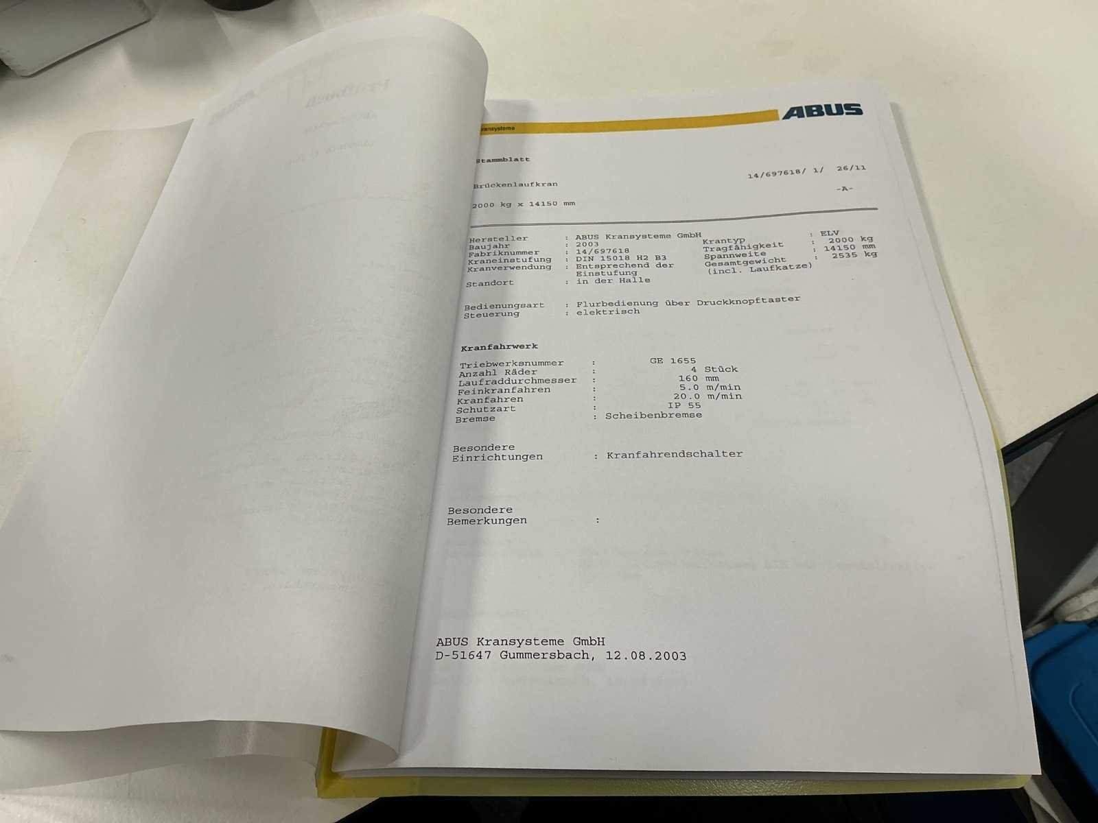 2003 abus 2.000 kg x 14,15 m bovenloopkraan