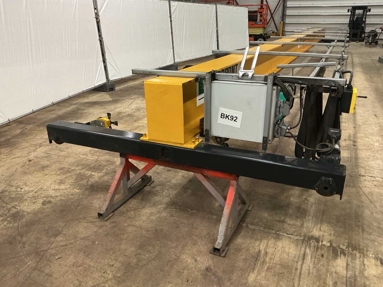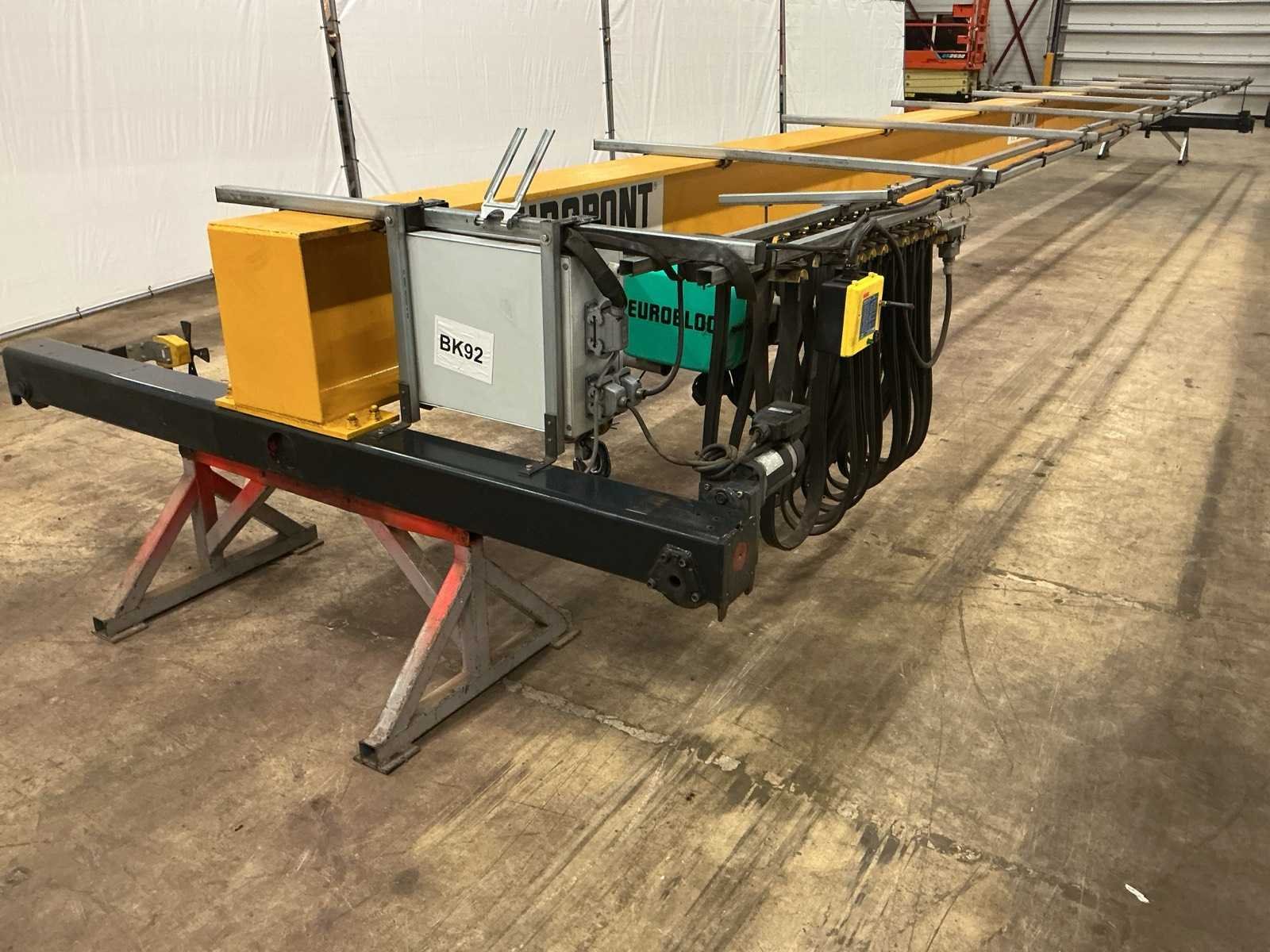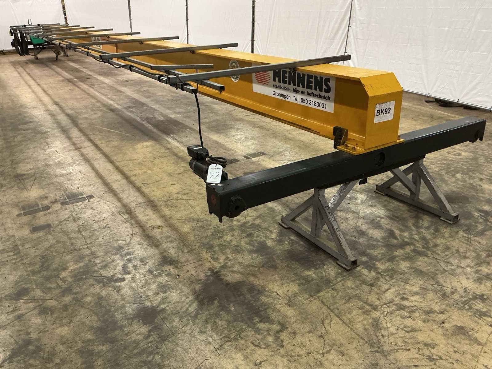 Voorzien van radiografische besturing, kraan is ooit ingekort en later weer verlengd, kraanboek en complete geschiedenis aanwezig, Merk: Verlinde Type: 3.200 KG x 14,47 m Bouwjaar: 2006 Serienummer: 1425 Overspanning: 14.47m Hijsvermogen: 3200kg Max. hijshoogte: 6m Draadloze afstandsbediening: true Met kraanboek: true Totale afmeting L: 14500mm Totale afmeting Breedte: 2390mm