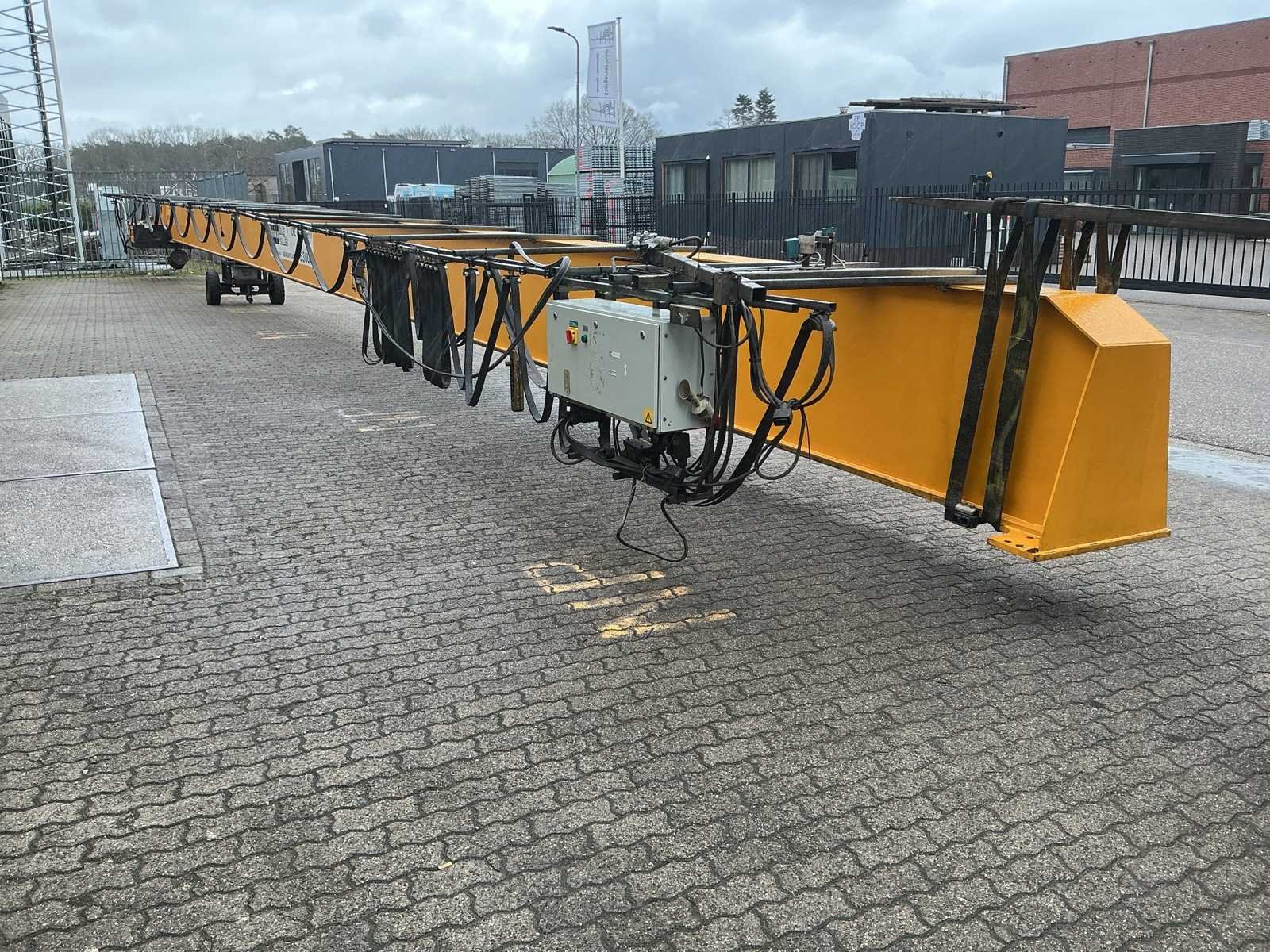 Voorzien van bedrade bediening, kraanboek aanwezig, Merk: Konecranes Type: 6.300 KG x 24,16 m Bouwjaar: 1995 Serienummer: 122104 Overspanning: 24.16m Hijsvermogen: 6300kg Max. hijshoogte: 8m Met kraanboek: true Eigen gewicht: 8000kg Totale afmeting L: 24300mm Totale afmeting Breedte: 4000mm Totale afmeting Hoogte: 1300mm