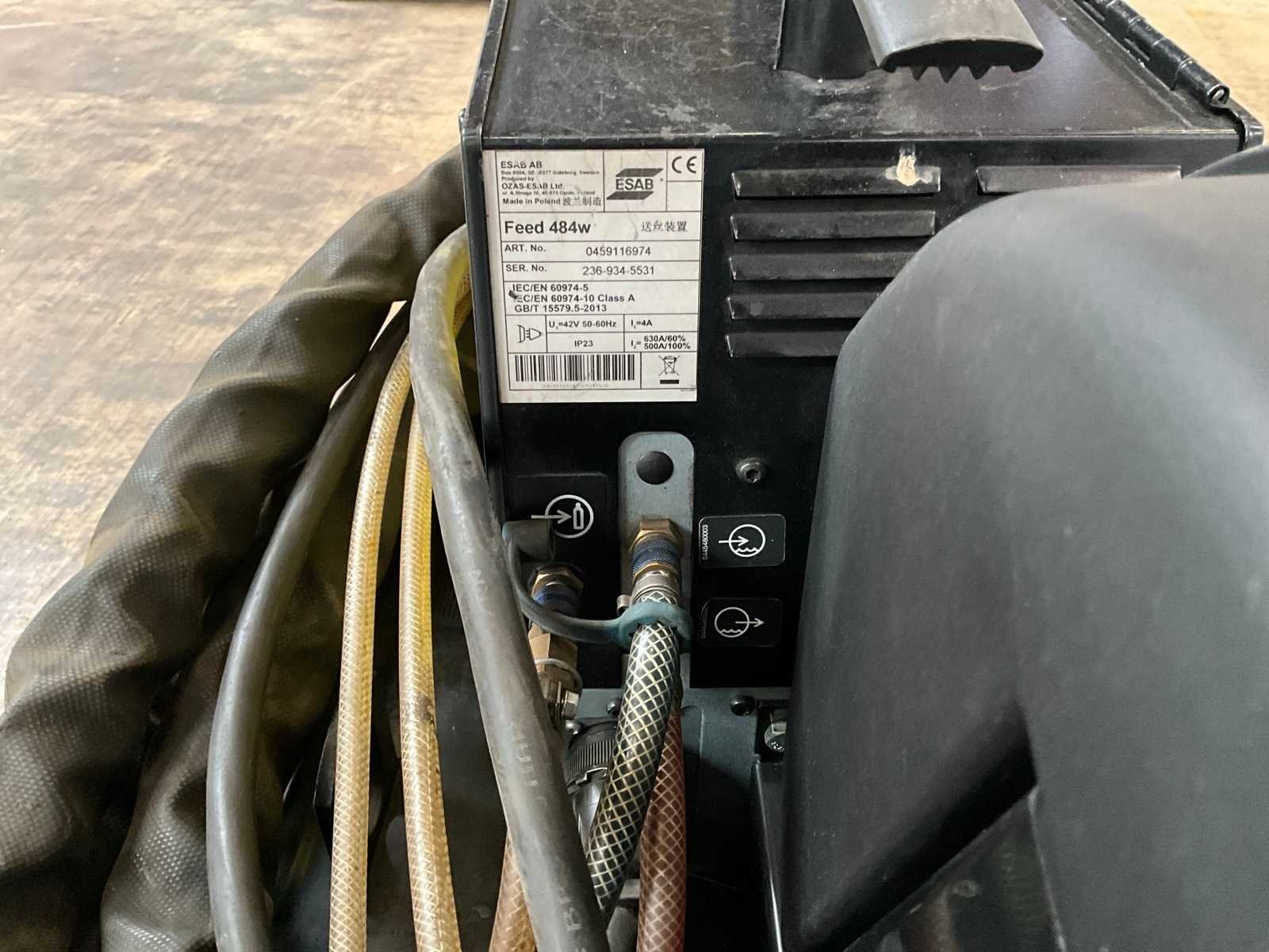 Gekoelde lastoorts, Merk: Esab Type: Origo Mig 502cw Serienummer: 715-841-0490 Inschakelduur: 60% Max. lasvermogen: 500A Aansluiting: 400V Digitale uitlezing: true Afmeting l: 900mm Afmeting b: 700mm Afmeting h: 1200mm