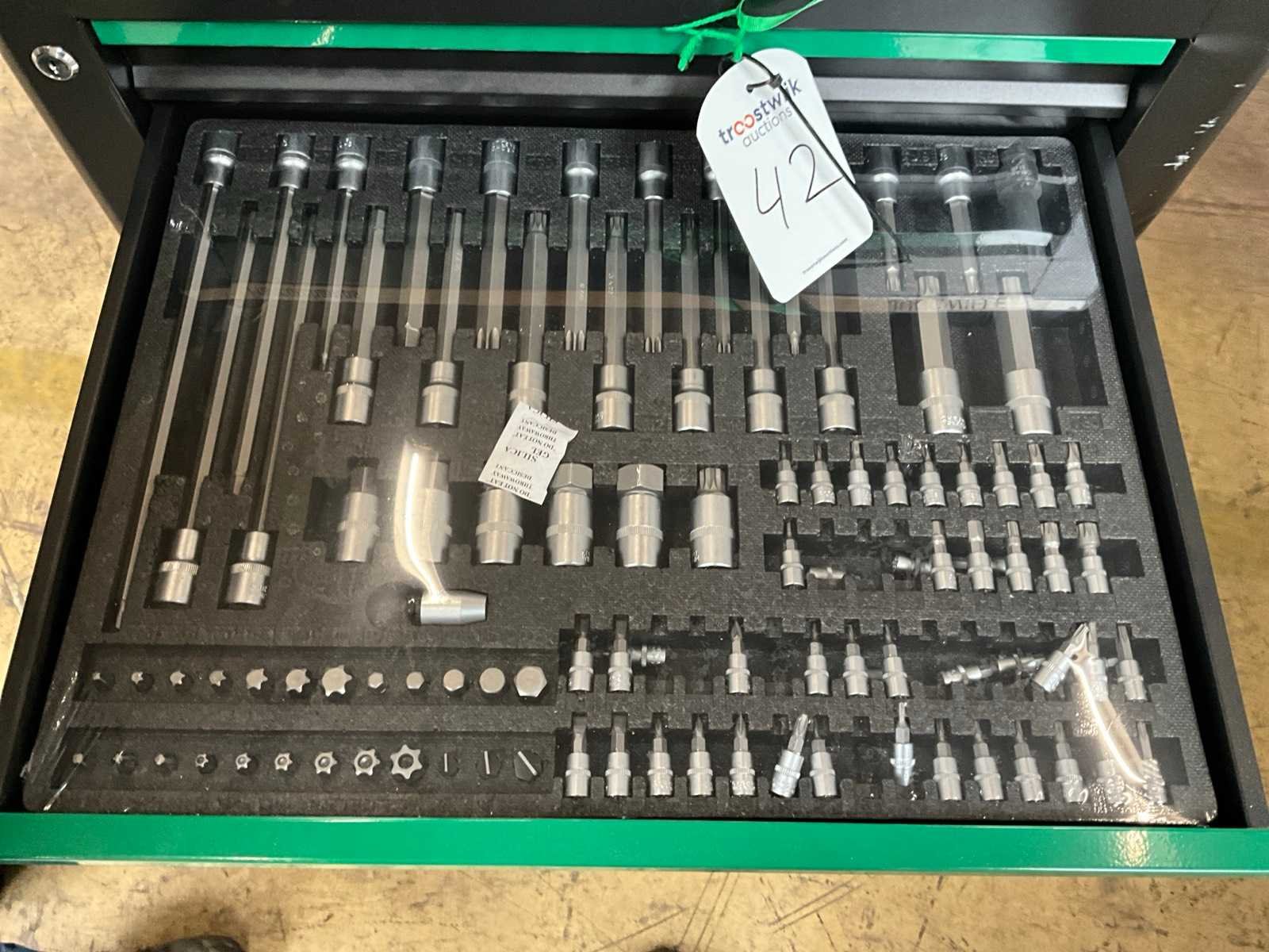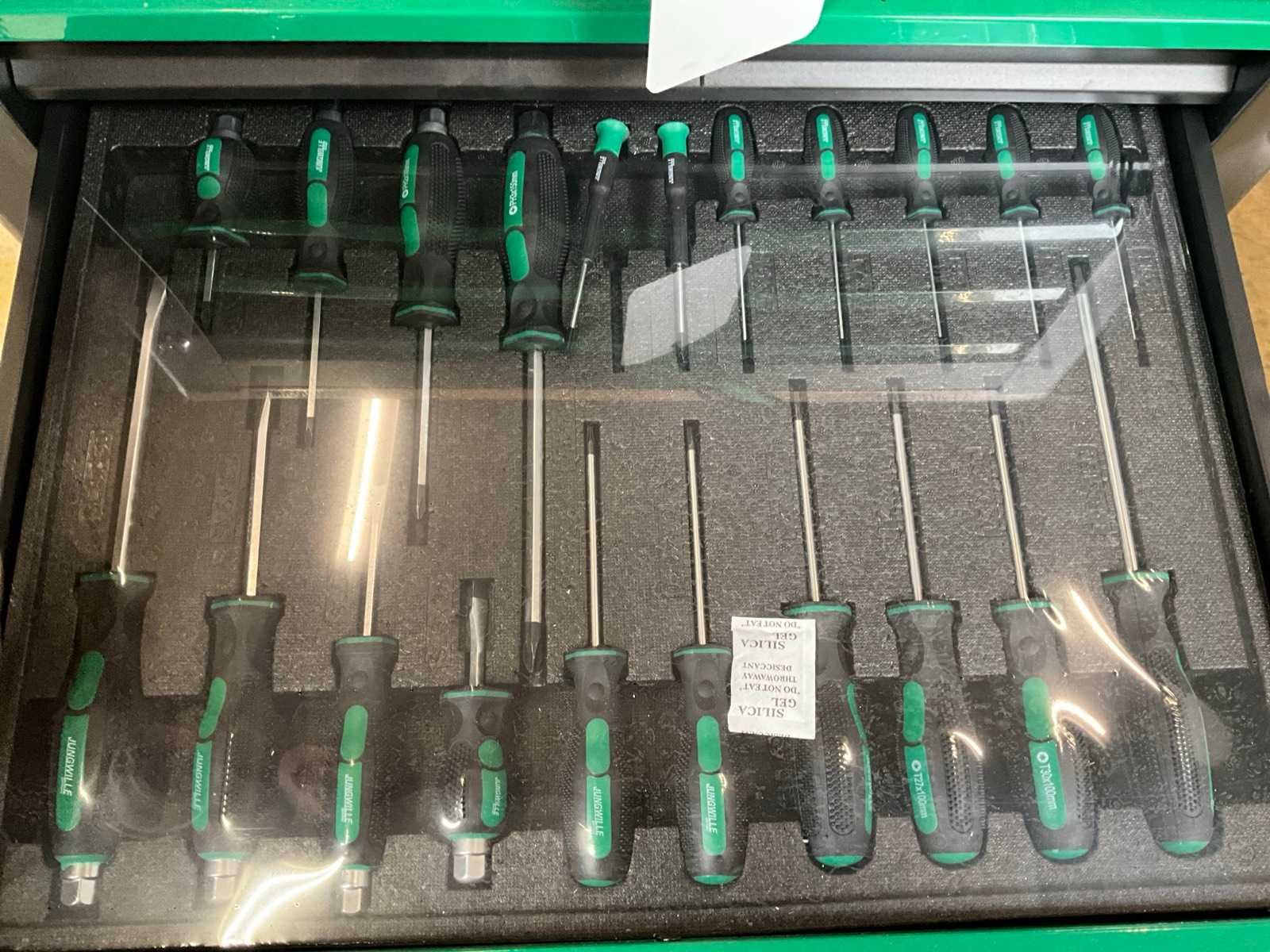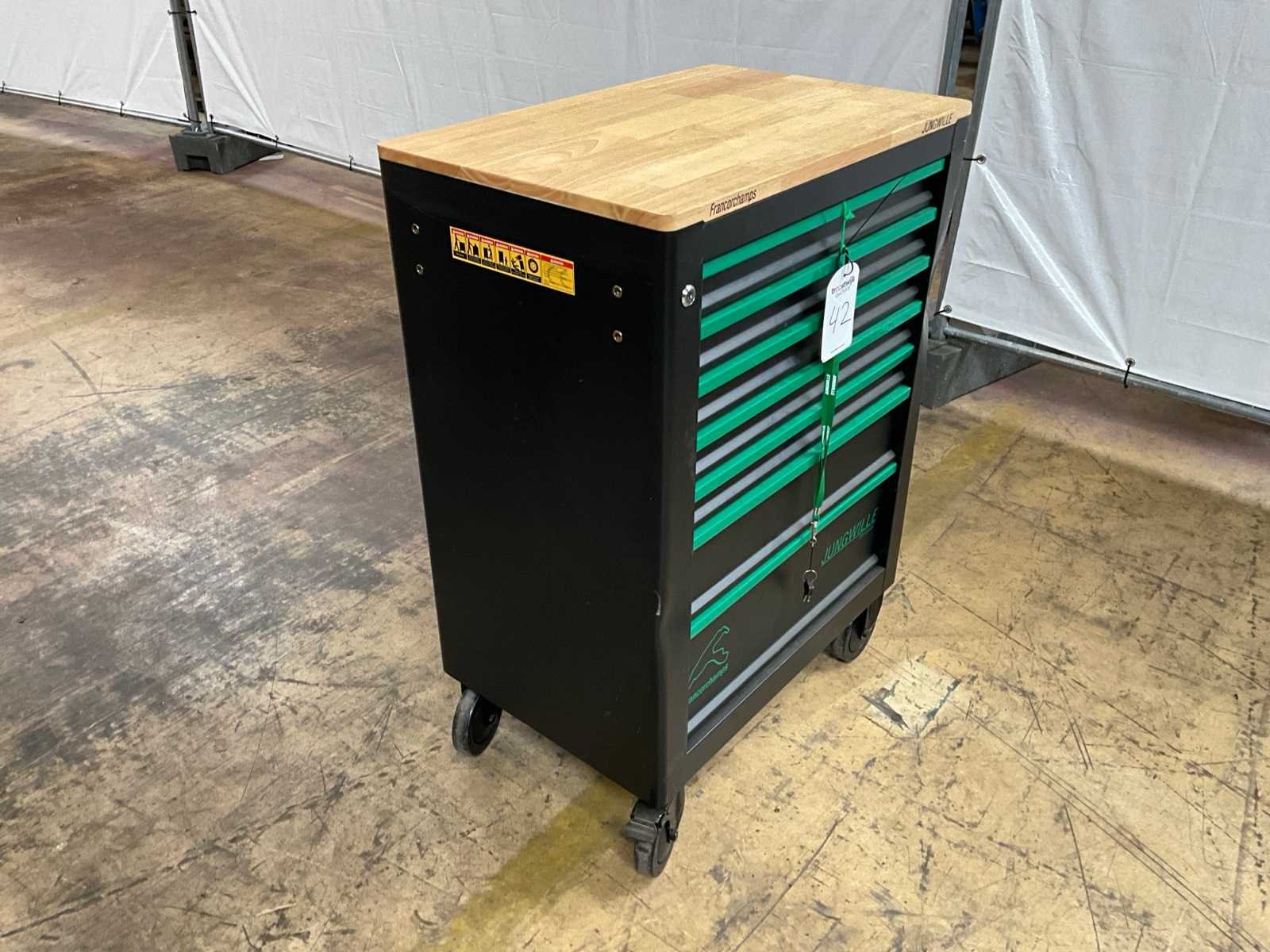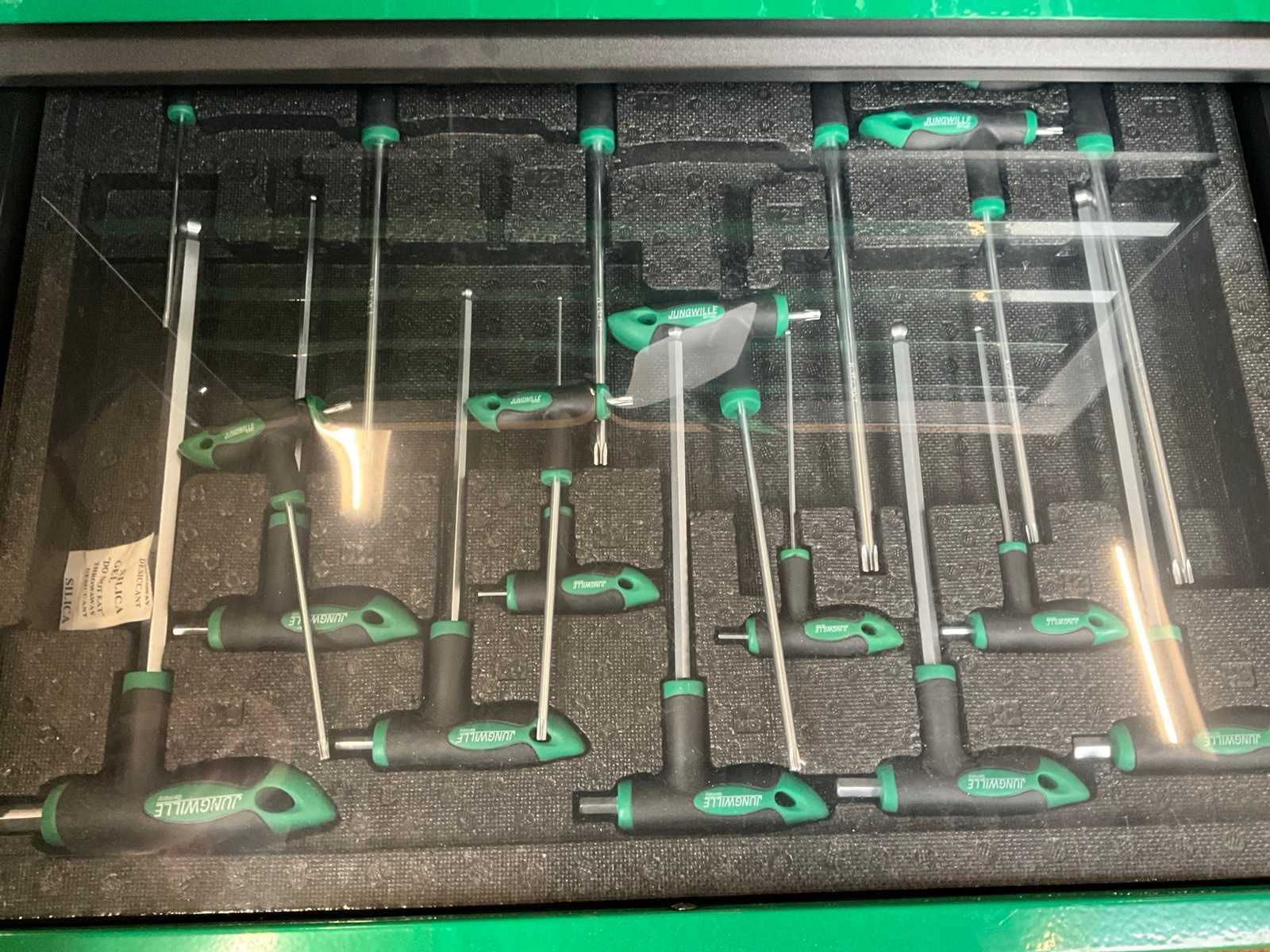 Nieuwe gereedschapswagen compleet gevuld, lades gelagerd, kleine schade aan buitenwand Merk: Jungwille Type: Francorchamps Aantal laden: 7 Met inhoud: true Totale afmeting L: 700mm Totale afmeting Breedte: 450mm Totale afmeting Hoogte: 970mm