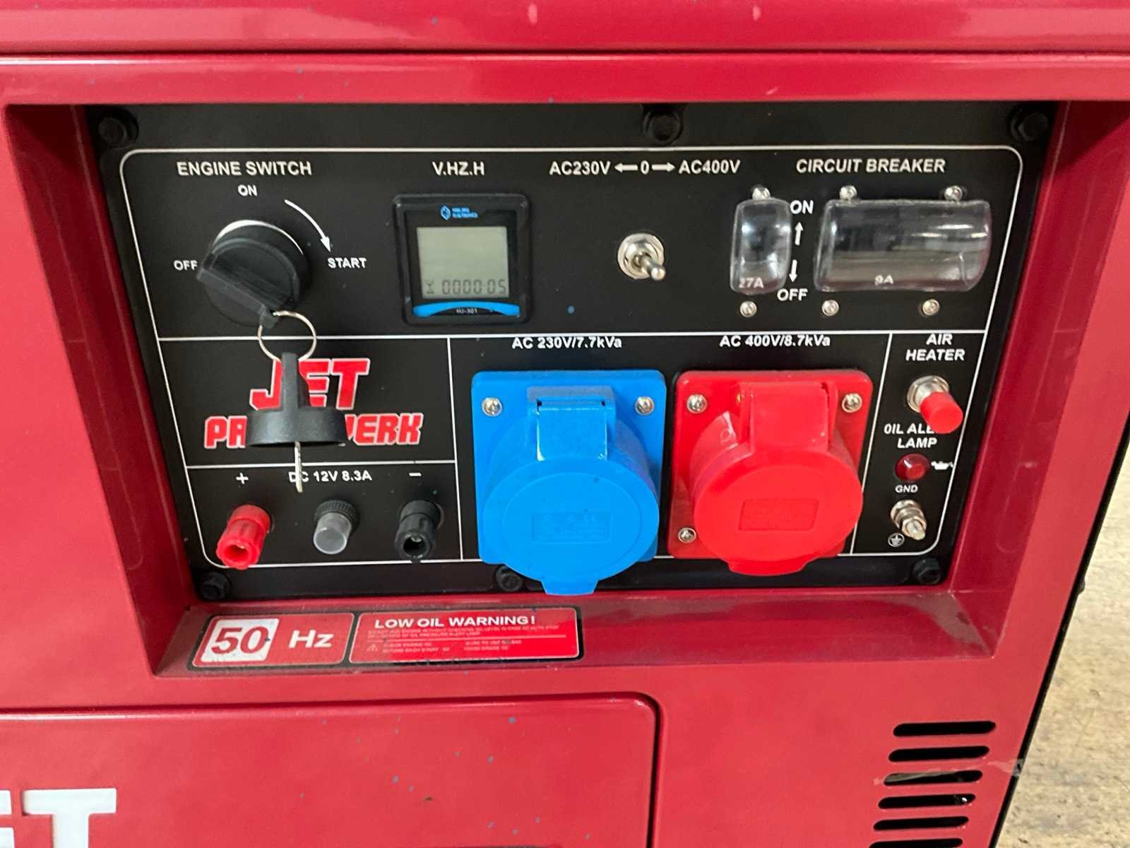 Betreft een nieuw en ongebruikt product, 230/400V schakeling, voorzien van 12V aansluiting, diverse stekkers en toebehoren, elektrische startmotor, Merk: JET Profi-Werk Type: JPW-747 Capaciteit.: 8.7kVA Diesel: true Aantal cilinders: 1 Motorvermogen (kW): 6.5kW Luchtgekoeld: true Mobiel: true Afgelezen urenstand: 0 Machinegewicht: 165kg Totale afmeting L: 965mm Totale afmeting Breedte: 570mm Totale afmeting Hoogte: 810mm