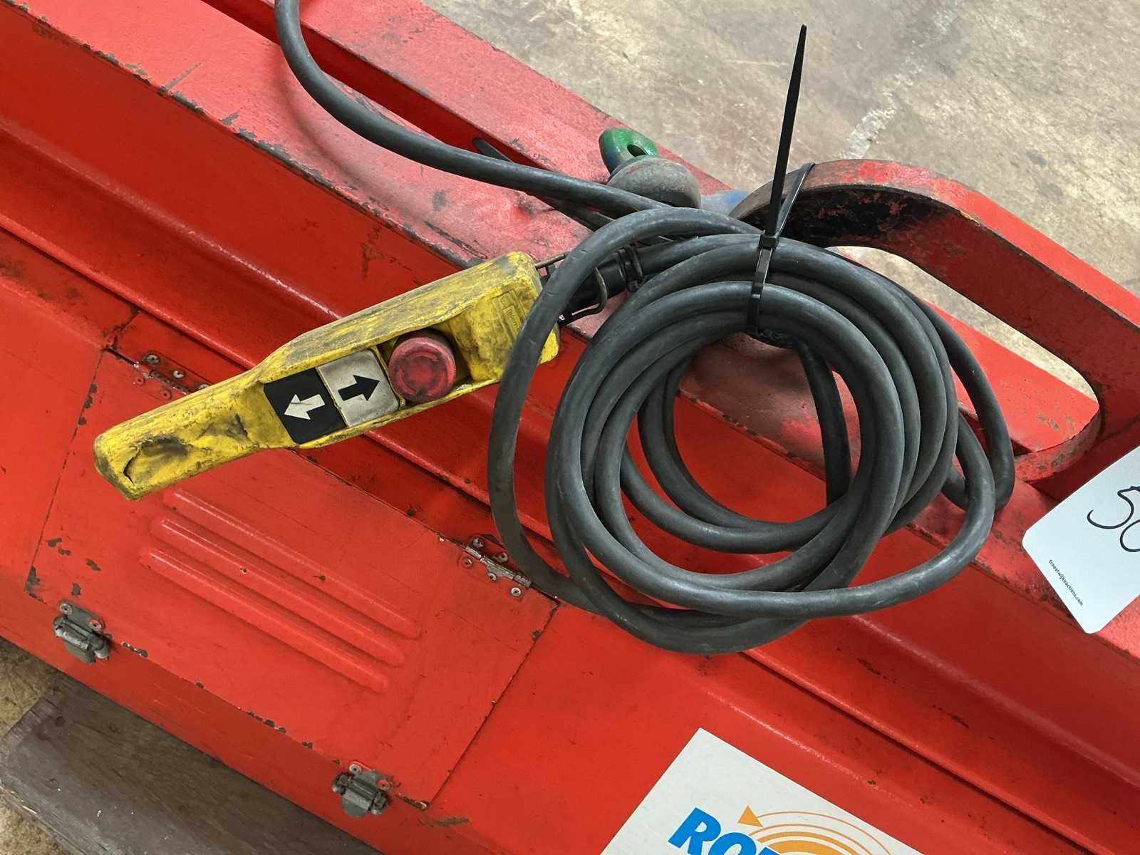 Voorzien van bedrade bediening, hijsoog, Merk: Rotomax Type: R1000/2,0 1.000KG Bouwjaar: 2002 Serienummer: 203170 Hijsvermogen: 1000kg Afmeting l: 2110mm Afmeting b: 450mm Afmeting h: 920mm Aansluiting: 400V Eigen gewicht: 420kg Totale afmeting L: 2110mm Totale afmeting Breedte: 450mm Totale afmeting Hoogte: 900mm
