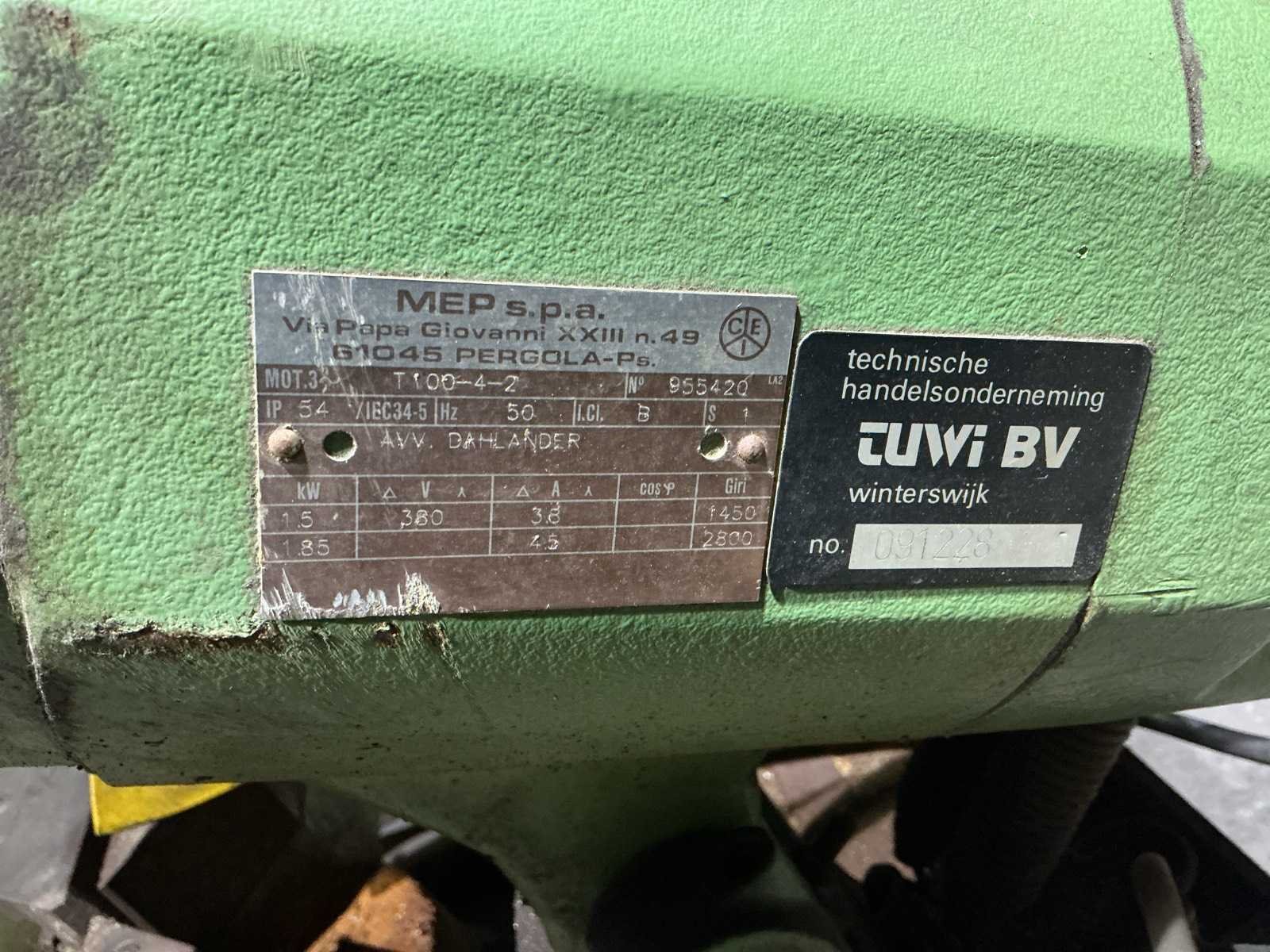 Staat op locatie in Ledeacker, bezichtigen alleen op afspraak mogelijk, Merk: MEP Type: 61045 Serienummer: T100-4-2 Koelmiddelpomp: true Motorvermogen (kW): 1.5kW Aansluiting: 400V Afmeting l: 1300mm Afmeting b: 1000mm Afmeting h: 1530mm