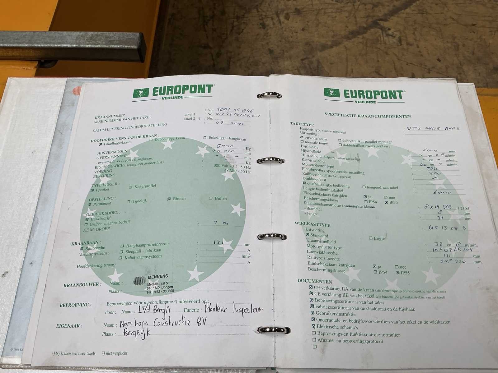 2001 verlinde 5.000 kg x 20,00m bovenloopkraan