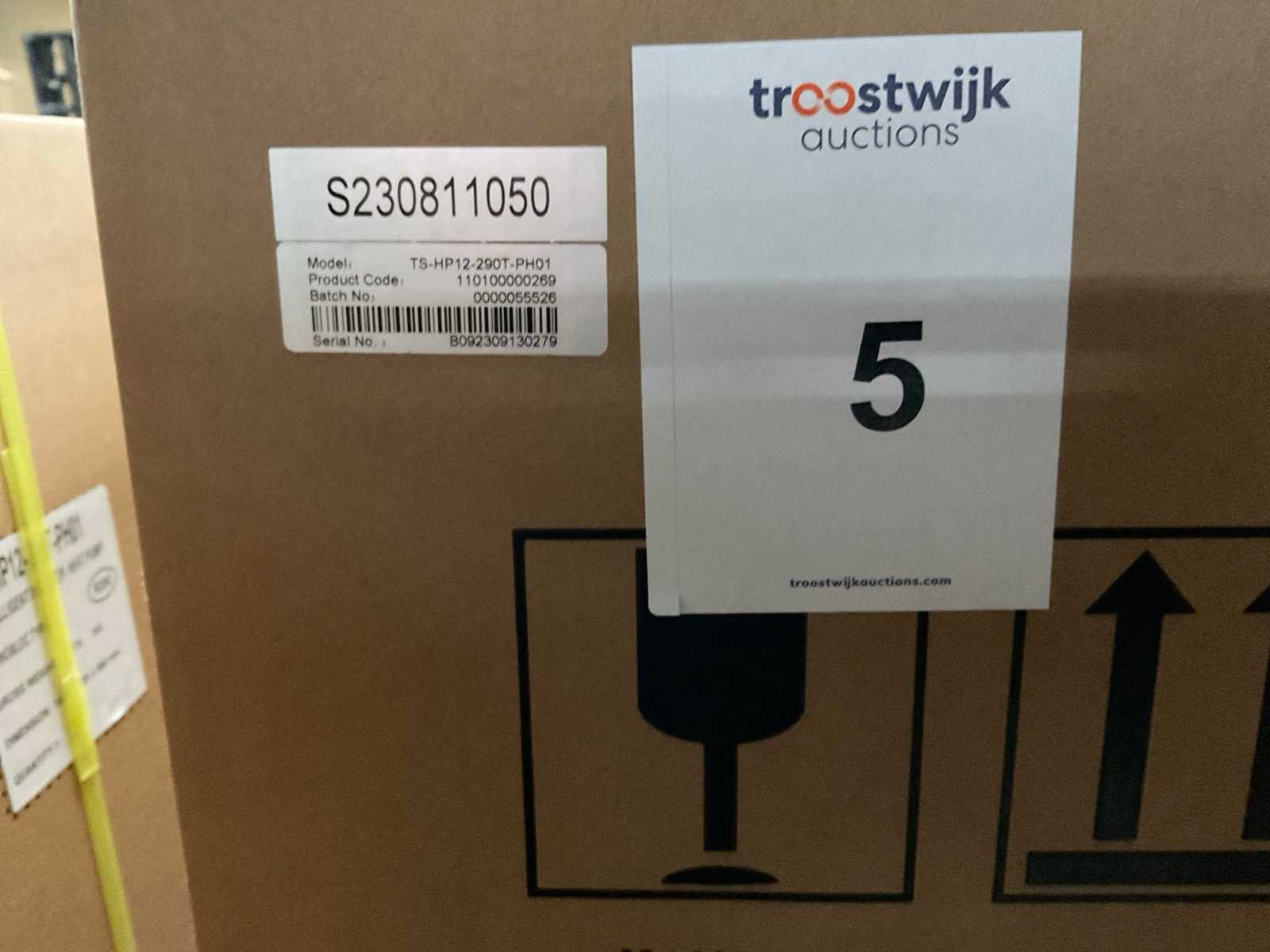 Serienummer: B092309130279. Dit betreft een verpakte unit. R290 refrigerant gas Energy Class: A++++ Heating + Cooling + Hot Water Full DC inverter compressor and fan motor Max outlet temperature: 70 O Wifi smart control Inverter water pump inside Modbus RS485 Full DC Inverter Technology Merk: Thuisstroom Model: TS-HP12-290T-PH01 Kleur: Zwart Gewicht: 175kg Lengte: 141cm Breedte: 52cm Hoogte: 96cm Materiaal: Metaal