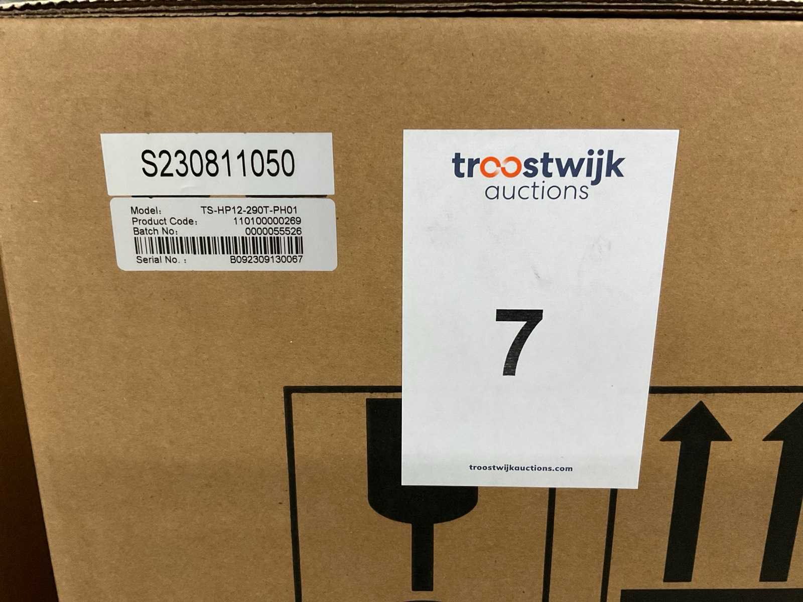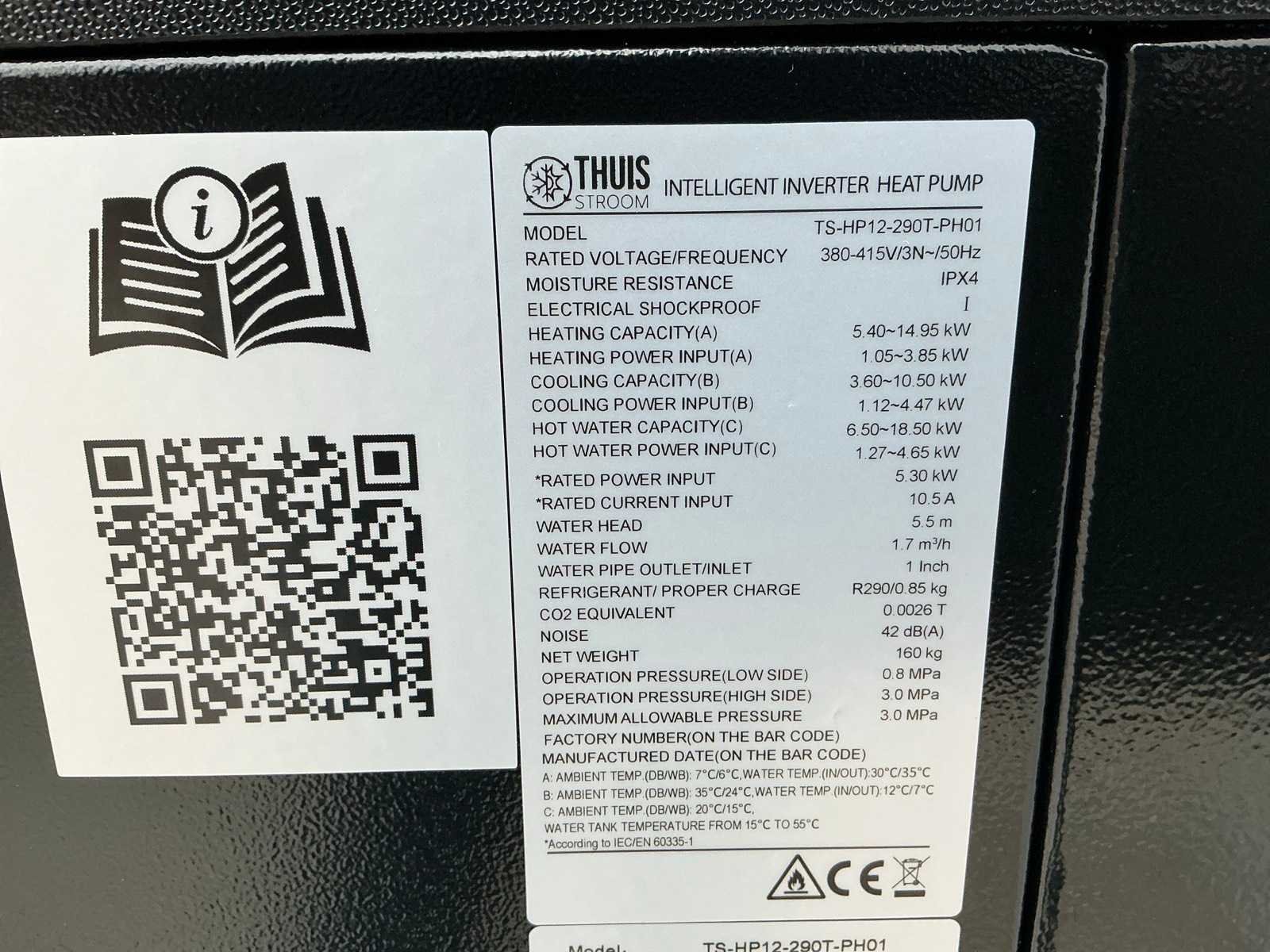 Serienummer: B092309130067. Dit betreft een verpakte unit. R290 refrigerant gas Energy Class: A++++ Heating + Cooling + Hot Water Full DC inverter compressor and fan motor Max outlet temperature: 70 O Wifi smart control Inverter water pump inside Modbus RS485 Full DC Inverter Technology Merk: Thuisstroom Model: TS-HP12-290T-PH01 Kleur: Zwart Gewicht: 175kg Lengte: 141cm Breedte: 52cm Hoogte: 96cm Materiaal: Metaal