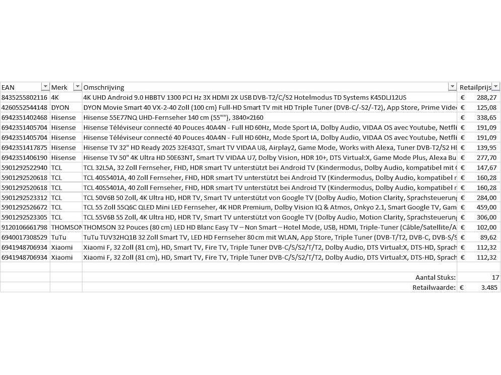 Dit betreft een partij televisies retourgoederen van een grote online retailer. De partij bestaat uit diverse diverse maten televisies. Aantal stuks: 17. Retailwaarde: €3485,- De televisies zijn niet werkend en zijn te gebruiken voor onderdelen. Kom op de kijkdag om te om zo een goed beeld te krijgen van de reden van retour. Zie foto's voor lijst met inhoud. Bezorgtermijn 14 dagen Merk: Pallet Retourgoederen - Televisies