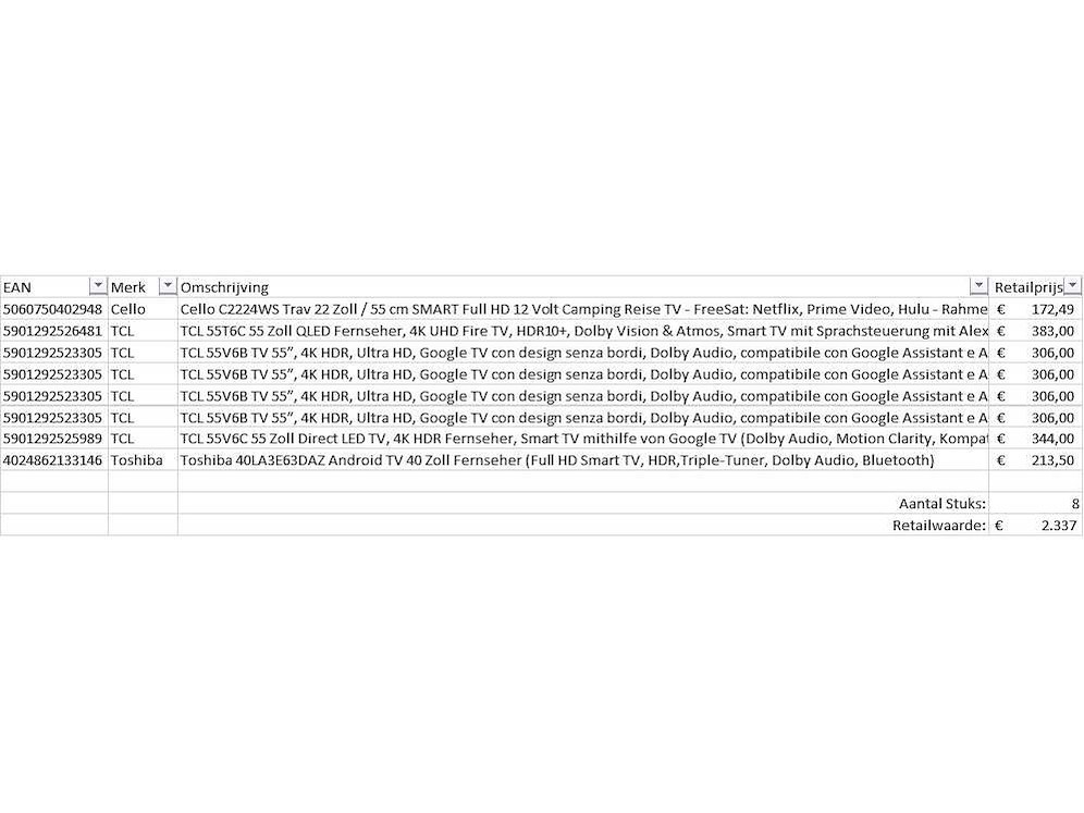 Dit betreft een partij televisies retourgoederen van een grote online retailer. De partij bestaat uit diverse diverse maten televisies. Aantal stuks: 8. Retailwaarde: €2337,- De televisies zijn niet werkend en zijn te gebruiken voor onderdelen. Kom op de kijkdag om te om zo een goed beeld te krijgen van de reden van retour. Zie foto's voor lijst met inhoud. Bezorgtermijn 14 dagen Merk: Pallet Retourgoederen - Televisies