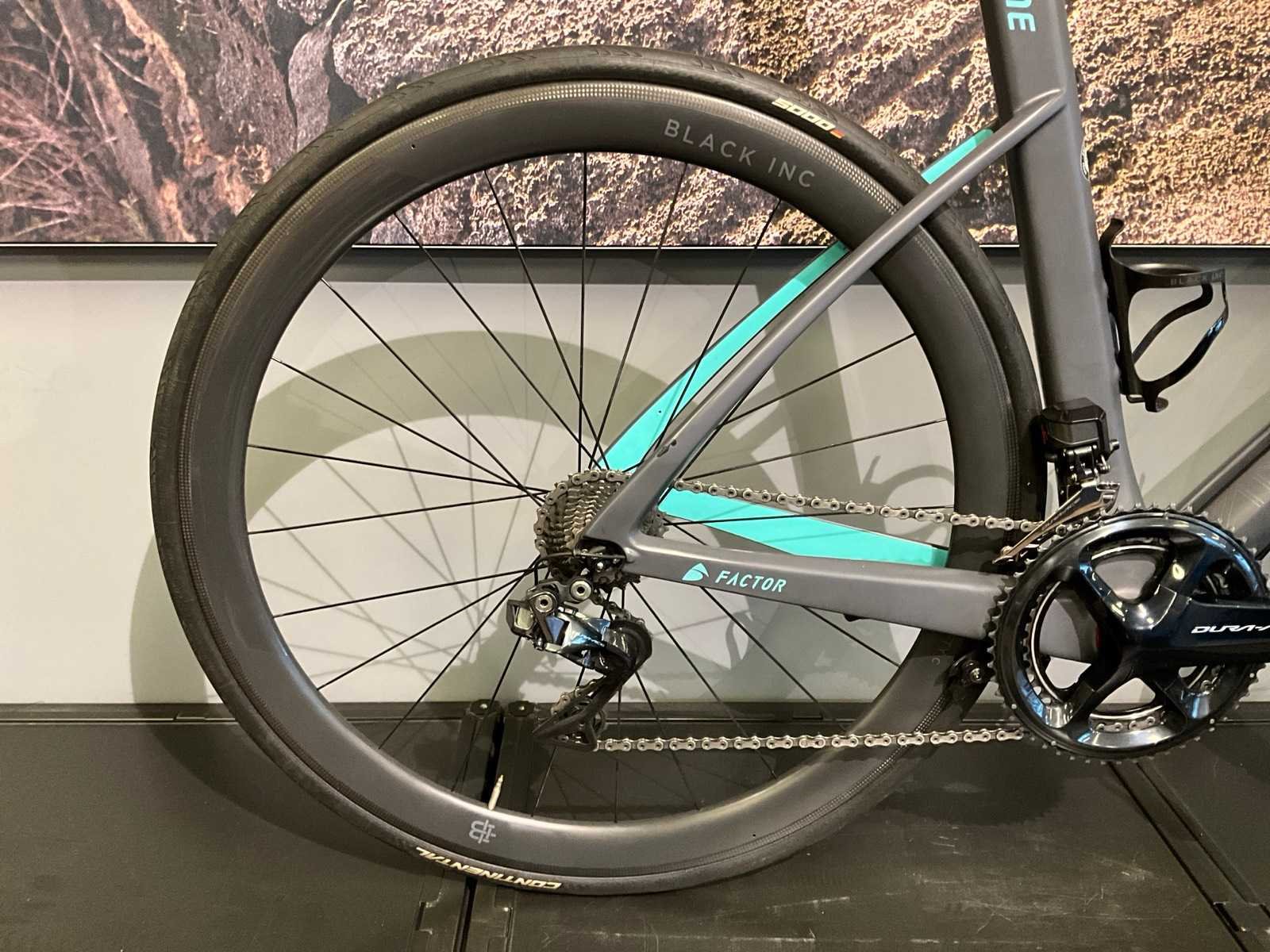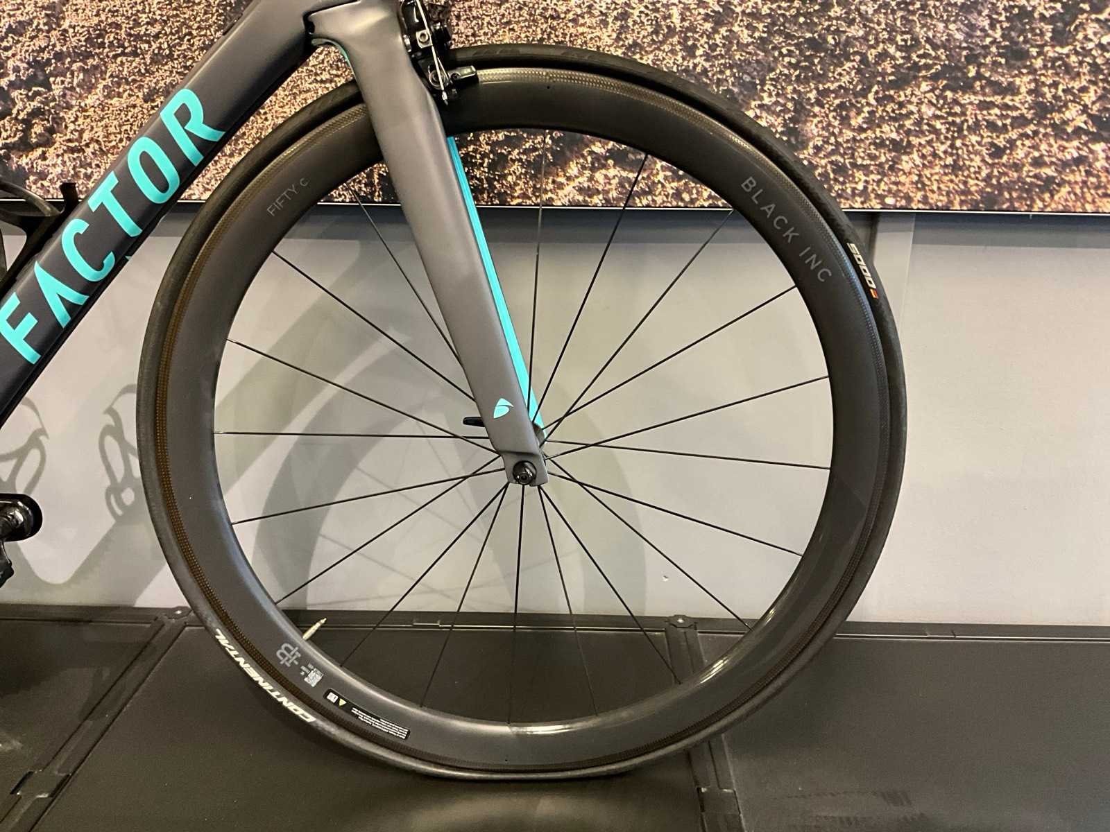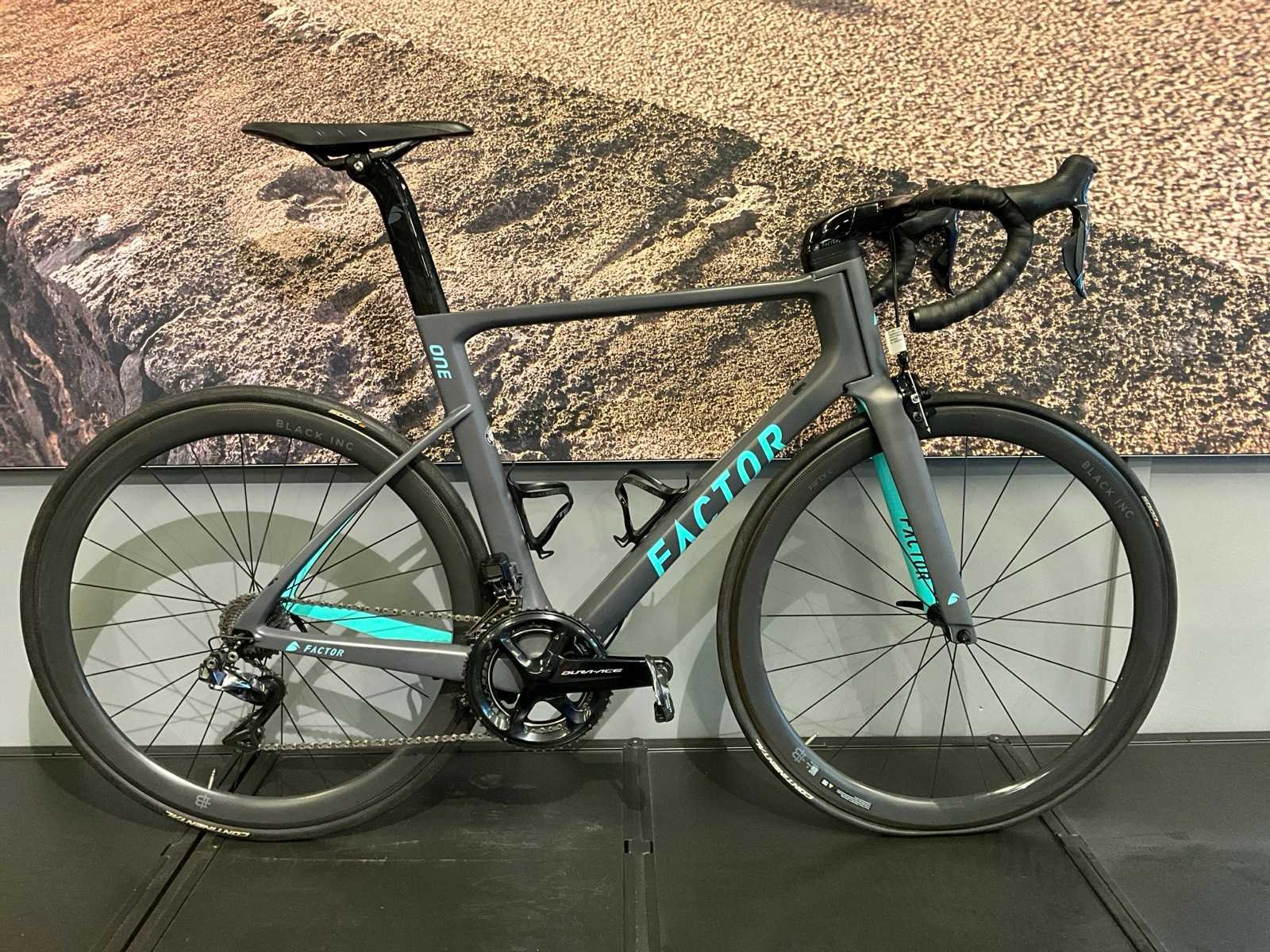 2x11 versnellingen; Dura-Ace groepset; Black Inc Fifty C wielset Merk: Factor Model: One Remsysteem: Schijfrem Versnellingen: 22 Framemaat: 56cm Materiaal: Carbon