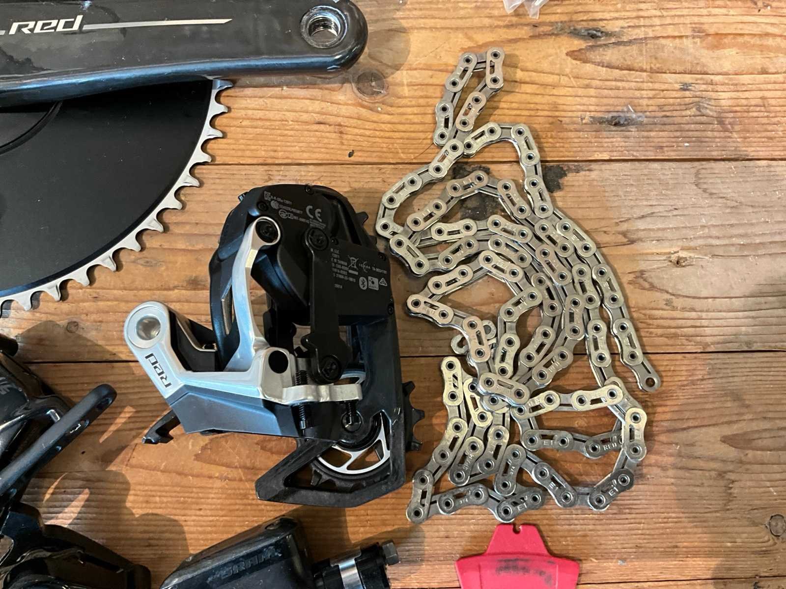 Bestaande uit onder andere: kettingblad, achterderailleur, ketting, shifters, etc; incompleet Merk: Sram Model: Red