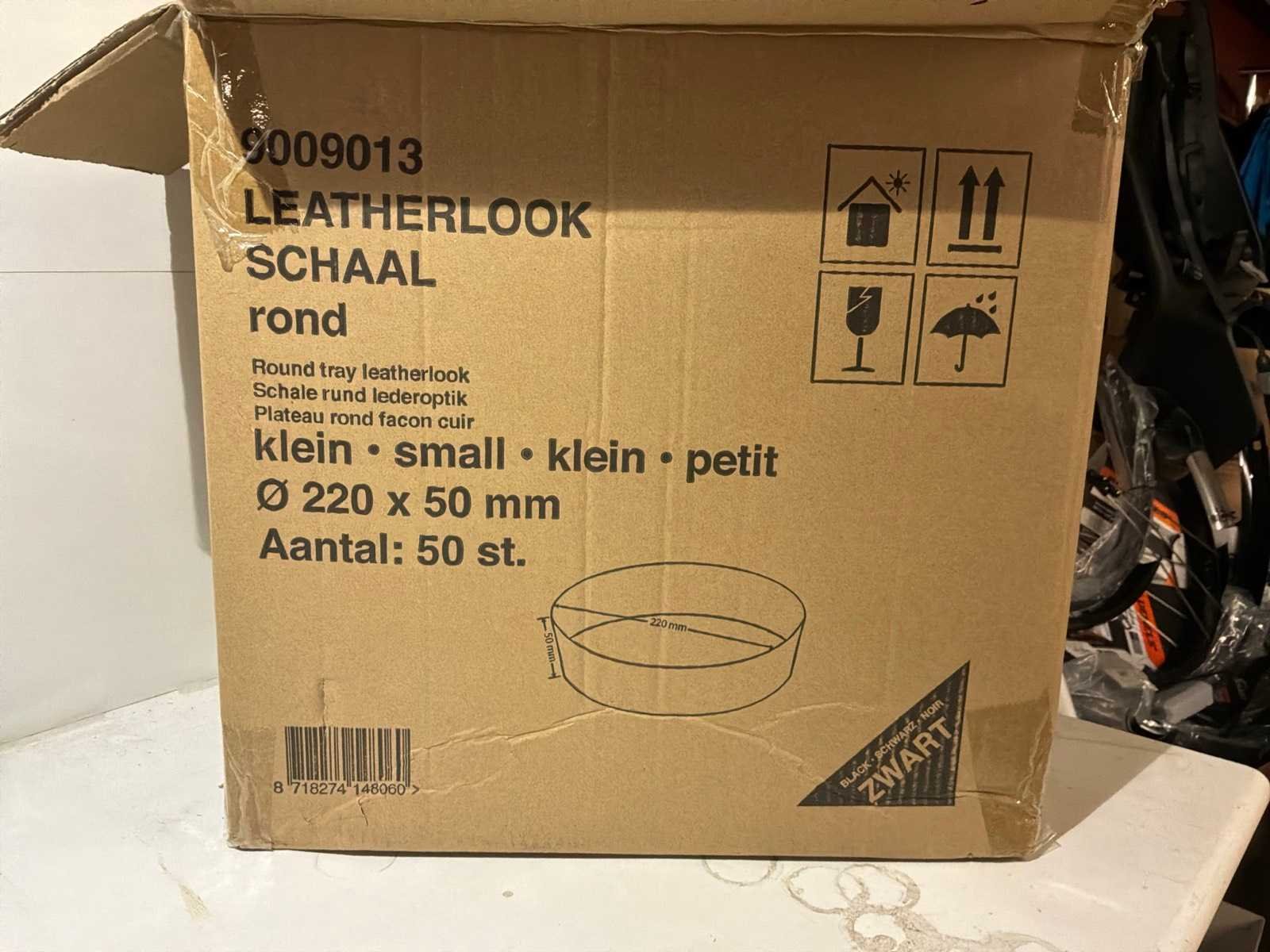 Ongebruikt in doos. Bestaande uit: Schaaltjes leder look