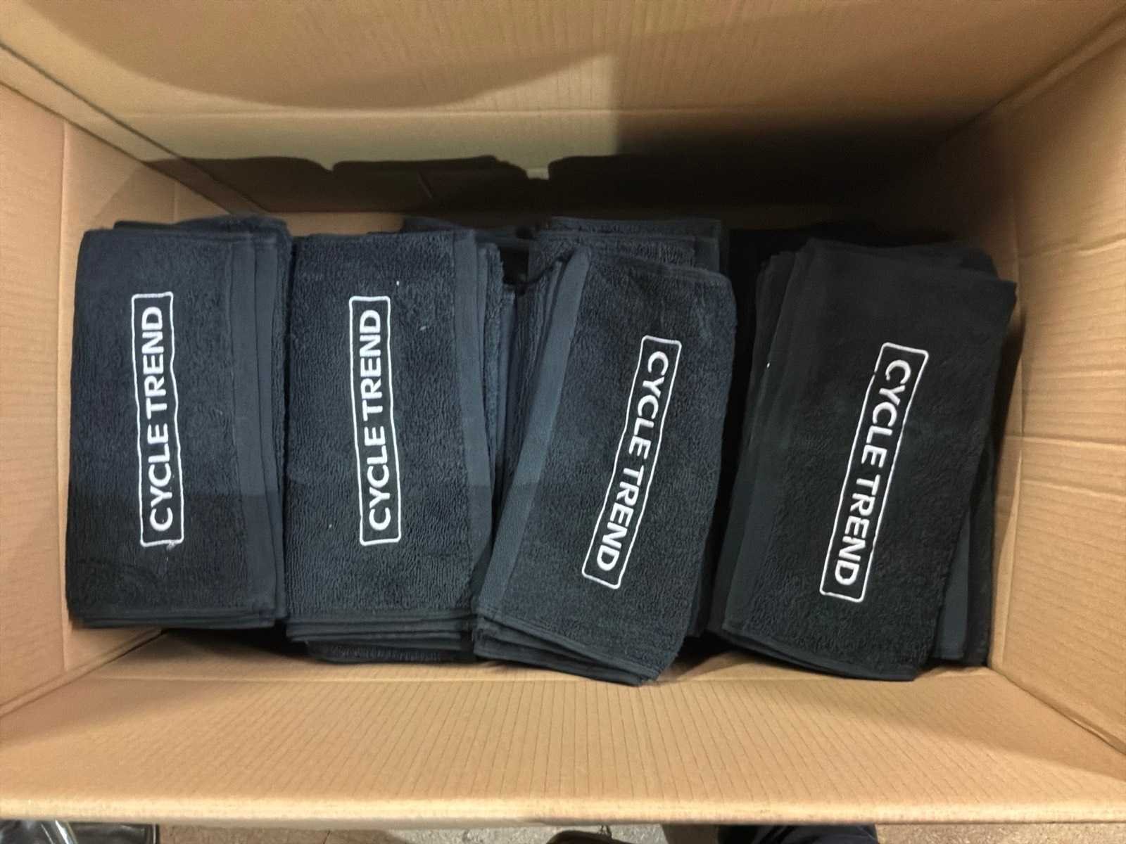 18x zweetband nieuw wahoo, 9x rugzak cycle trend, circa 80x handdoeken circle trend. Merk: Cycle trend / wahoo