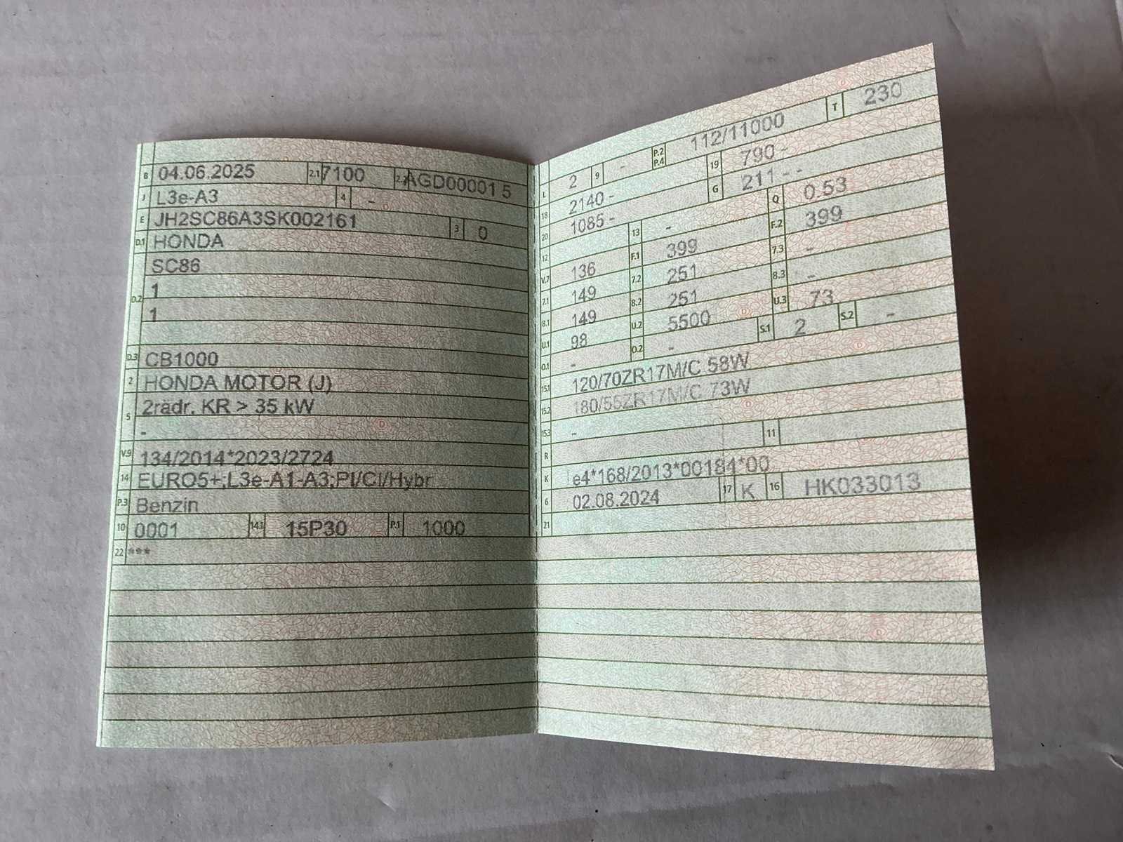 Euro5 Merk: Honda Model: CB1000 Hornet Brandstof: Benzine Chassisnummer: JH2SC86A3SK002161 Cilinderinhoud: 1000cc Datum eerste toelating: 04/06/2025 Vermogen (kW): 112kW Afgelezen kilometerstand: 4561km Nationaliteit documenten: Duitsland Aantal sleutels: 2 Startinformatie: Start en rijdt Bouwjaar: 2025