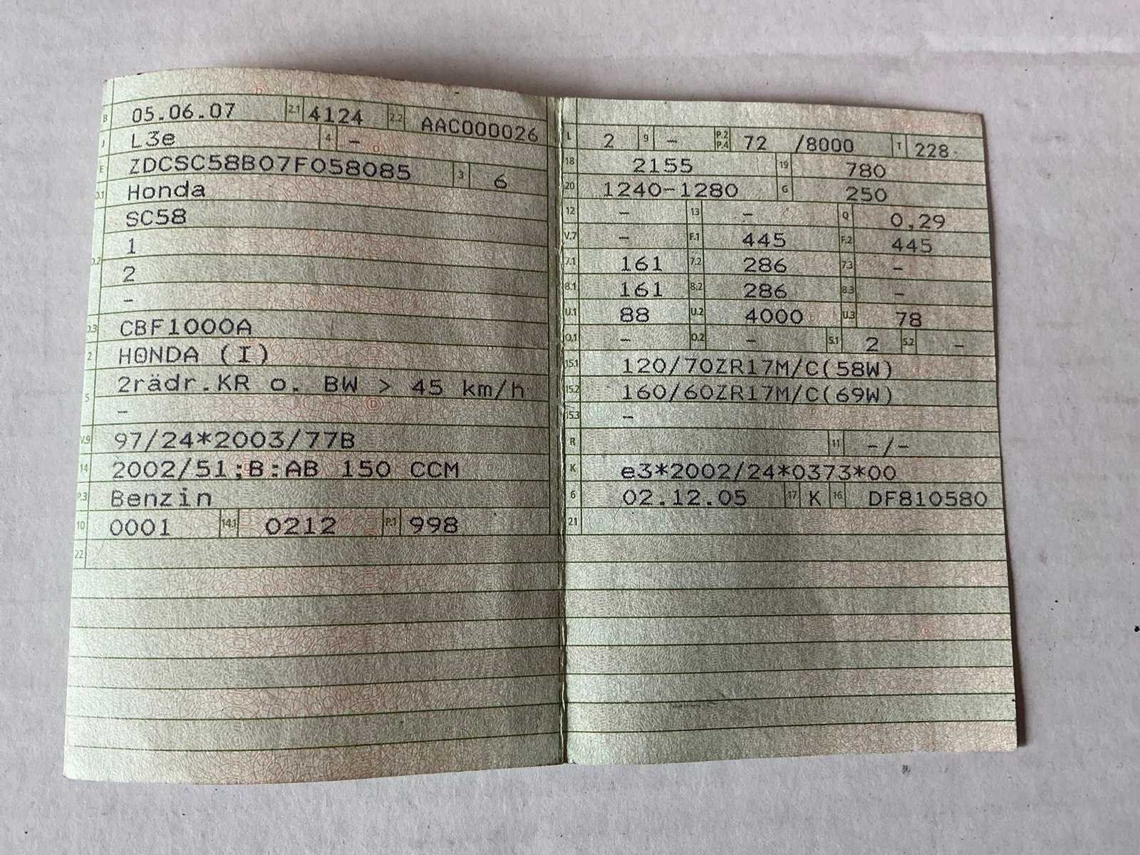 Merk: Honda Model: CBF1000A Brandstof: Benzine Chassisnummer: ZDCSC58B07F058085 Cilinderinhoud: 998cc Datum eerste toelating: 05/06/2007 Vermogen (kW): 95kW Afgelezen kilometerstand: 49370km Nationaliteit documenten: Duitsland Aantal sleutels: 2 Startinformatie: Start en rijdt Bouwjaar: 2007