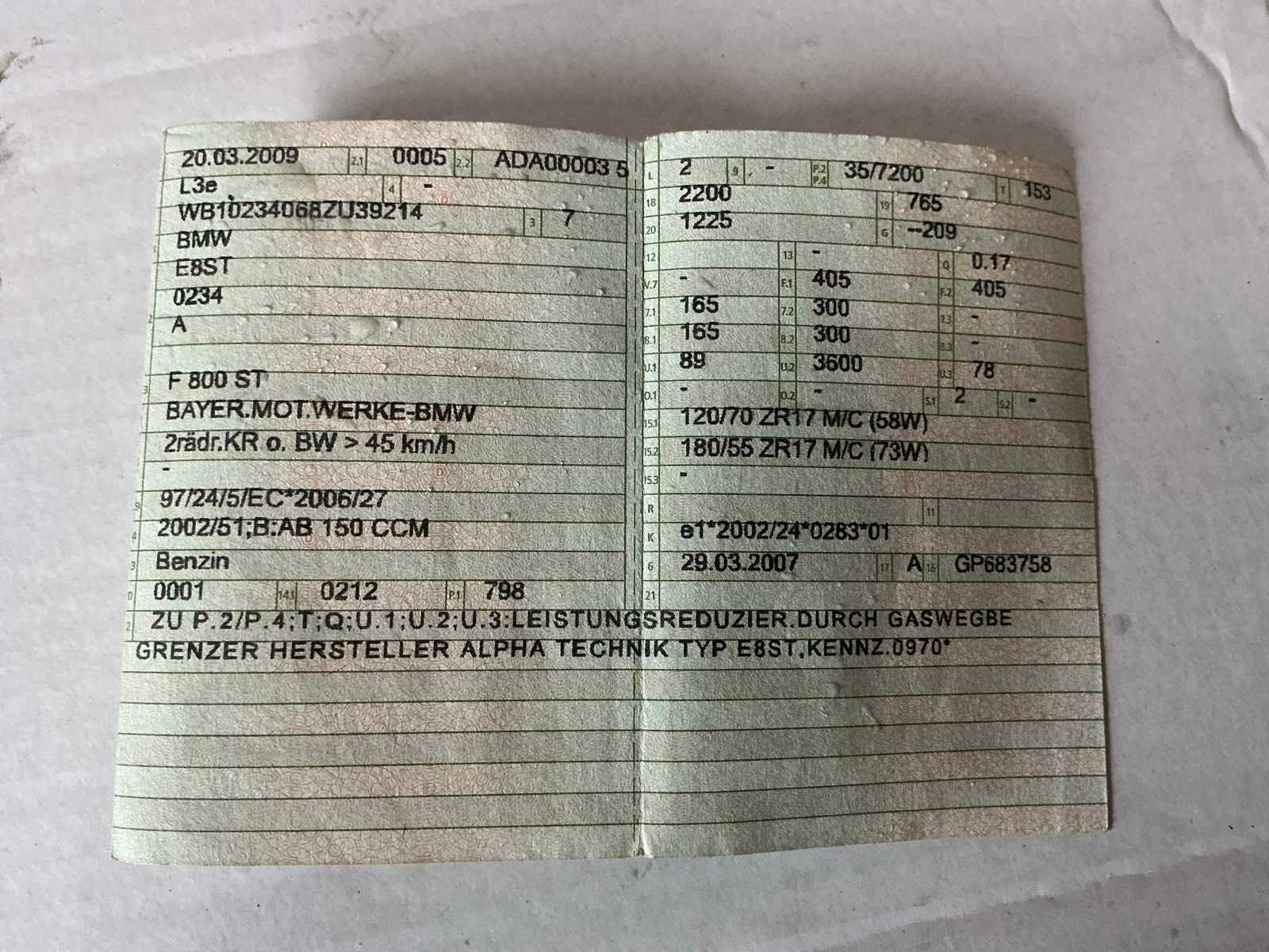 Merk: BMW Model: F800ST Brandstof: Benzine Chassisnummer: WB10234068ZU39214 Cilinderinhoud: 798cc Datum eerste toelating: 20/03/2009 Vermogen (kW): 63kW Nationaliteit documenten: Duitsland Aantal sleutels: 2 Startinformatie: Start en rijdt Bouwjaar: 2009