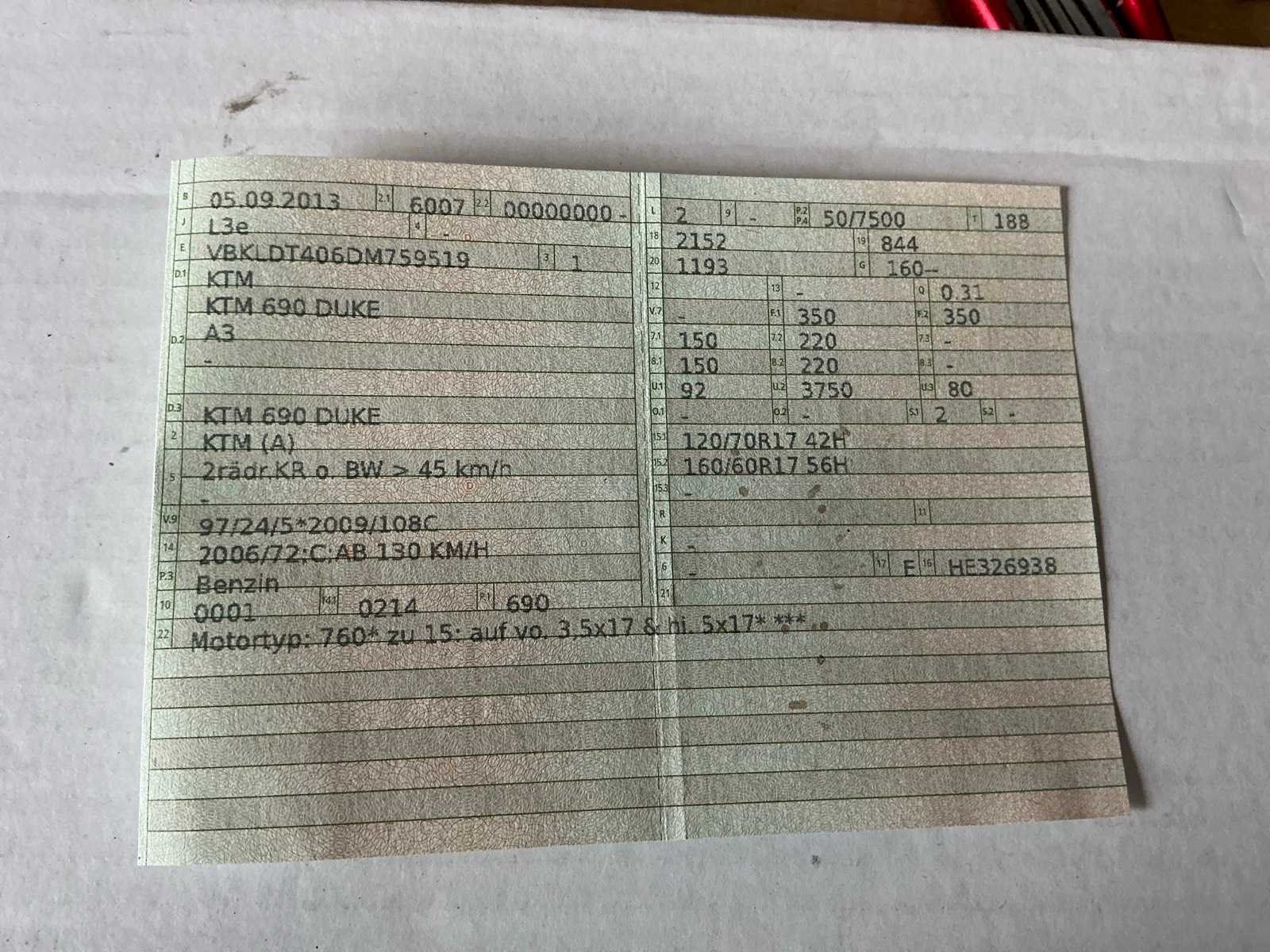 Merk: KTM Model: 690 Duke Brandstof: Benzine Chassisnummer: VBKLDT406DM759519 Cilinderinhoud: 690cc Datum eerste toelating: 05/09/2013 Vermogen (kW): 50kW Afgelezen kilometerstand: 39702km Nationaliteit documenten: Duitsland Aantal sleutels: 1 Startinformatie: Start en rijdt Bouwjaar: 2013