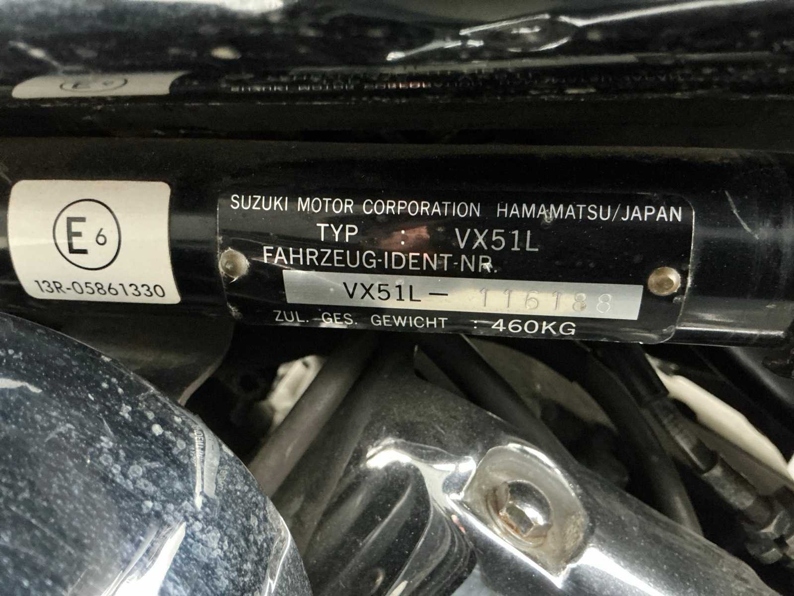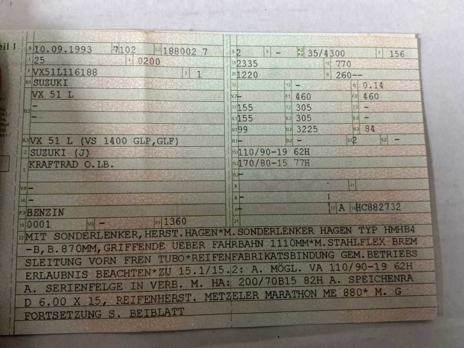 Merk: Suzuki Model: VS1400GLP intruder Brandstof: Benzine Chassisnummer: VX51L116188 Cilinderinhoud: 1360cc Datum eerste toelating: 10/09/1993 Vermogen (kW): 35kW Afgelezen kilometerstand: 78382km Nationaliteit documenten: Duitsland Aantal sleutels: 1 Startinformatie: Start en rijdt Bouwjaar: 1993