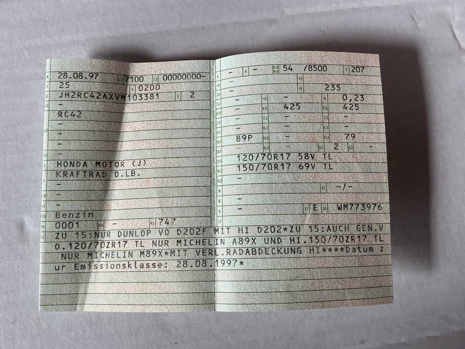 Merk: Honda Model: CB750 Brandstof: Benzine Chassisnummer: JH2RC42AVXM103381 Cilinderinhoud: 747cc Vermogen (kW): 54kW Afgelezen kilometerstand: 54382km Nationaliteit documenten: Duits Aantal sleutels: 1 Startinformatie: Start en rijdt Bouwjaar: 1997