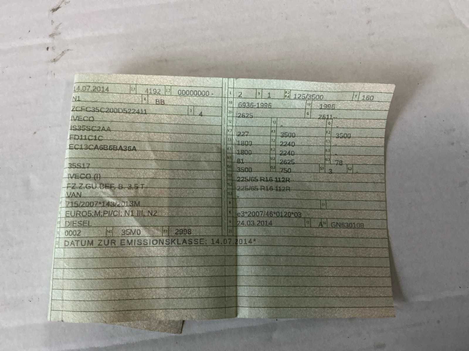 EDC error Merk: Iveco Type: Daily R 3.0 Bouwjaar: 2014 Chassisnummer: ZCFC35C200D522411 Afgelezen kilometerstand: 550960km Cilinderinhoud: 2998cc Vermogen (kW): 125kW Brandstof: diesel Datum eerste inschrijving: 14/03/2014 Aandrijving: Achterwielen Transmissie: Handgeschakeld Aantal zitplaatsen: 3 Nationaliteit documenten: Duitsland Stuurwiel: Links Aantal deuren: 5 Aantal sleutels: 1 Boorddocumenten aanwezig?: true Startinformatie: start No self drive export!: true