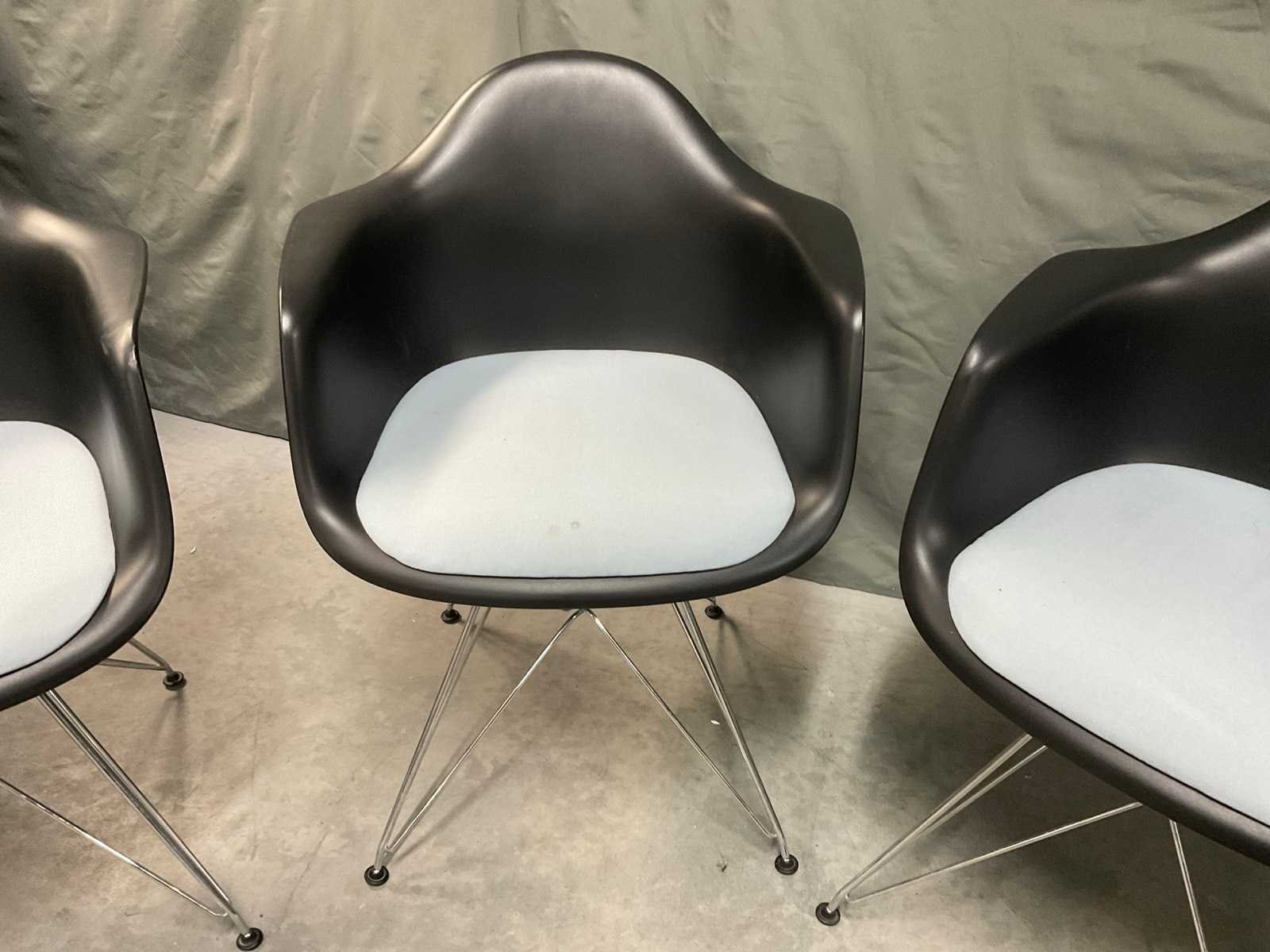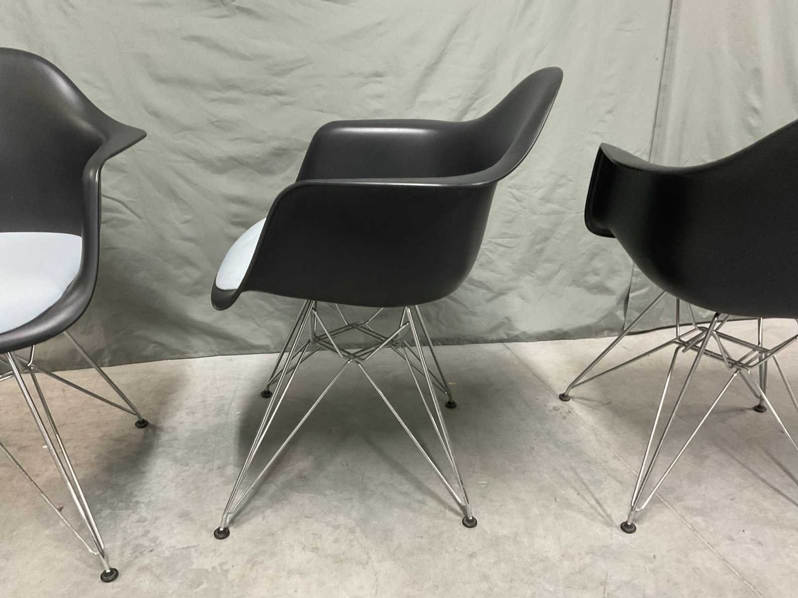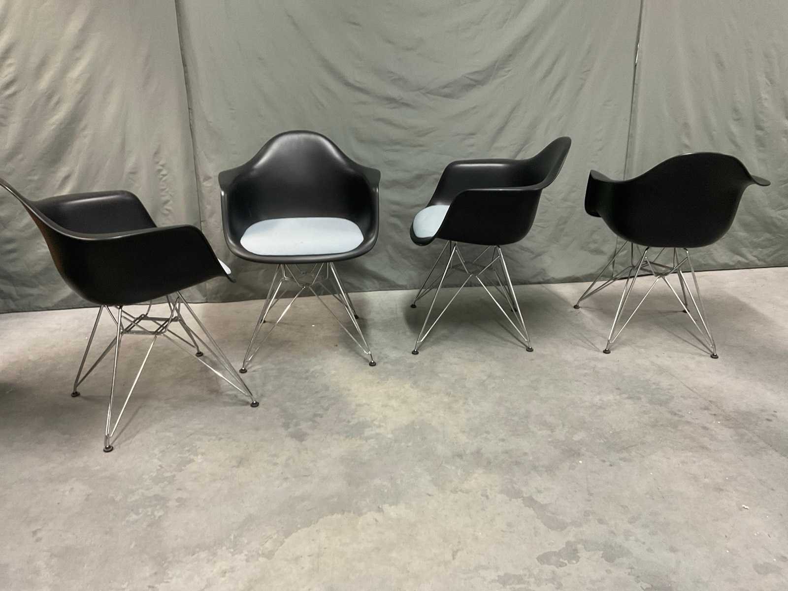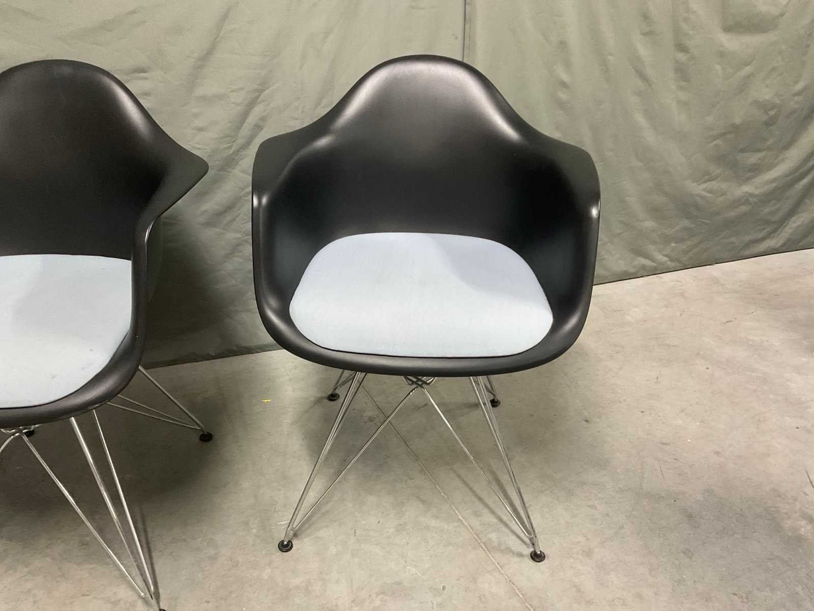 Plastic armchair voorzien van zitkussen en chroom onderstel Zithoogte ca. 43 cm Tafel niet inbegrepen Kunstenaar: Charles en Ray Eames Fabrikant: Vitra Model: DAR Handtekening/stempel: true Lengte: 63cm Breedte: 59cm Hoogte: 83cm