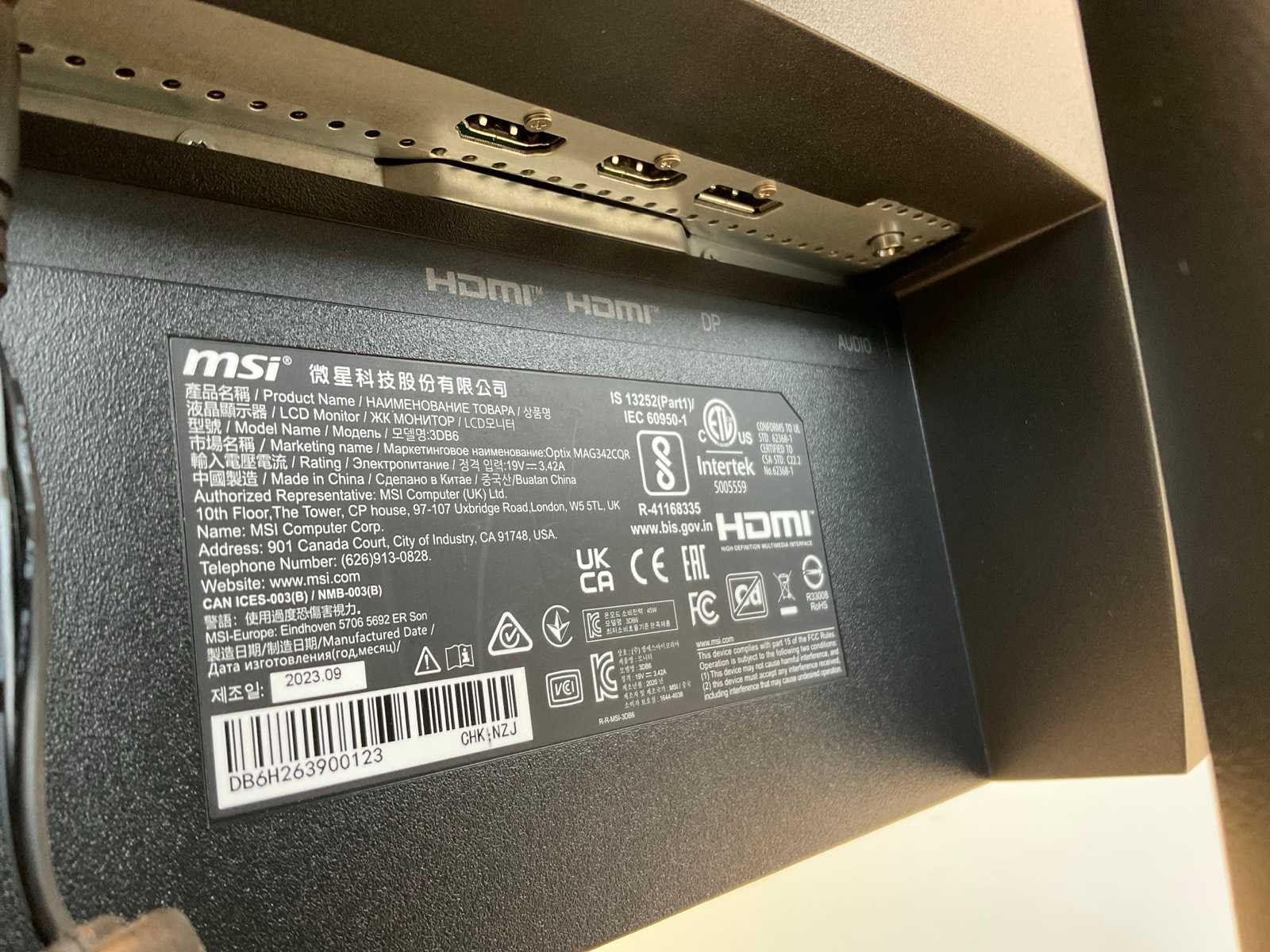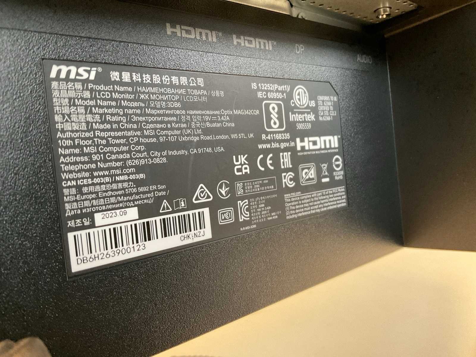 Voorzien van 2 hdmi en displayport Incl. Voedingskabel Merk: MSI Model: Optix MAG342CQR Product type: Curved Lengte: 81cm Breedte: 35cm Hoogte: 51cm