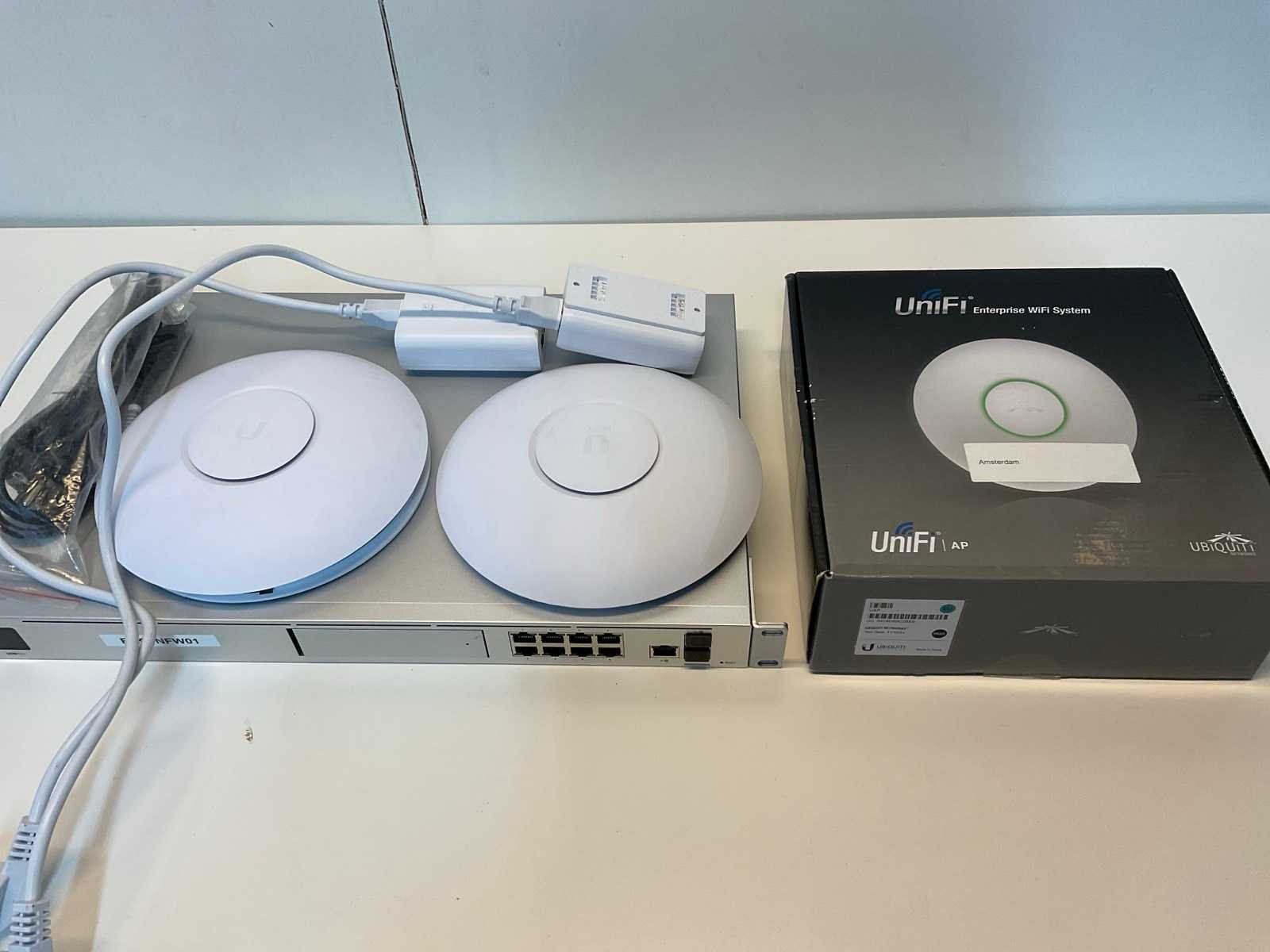Bestaande uit 8 poorts switch 2 stuks U6 pro access points UniFi AP acces point 2 stuks uPoe adapters Merk: Ubiquiti Model: Unifi Dream machine pro