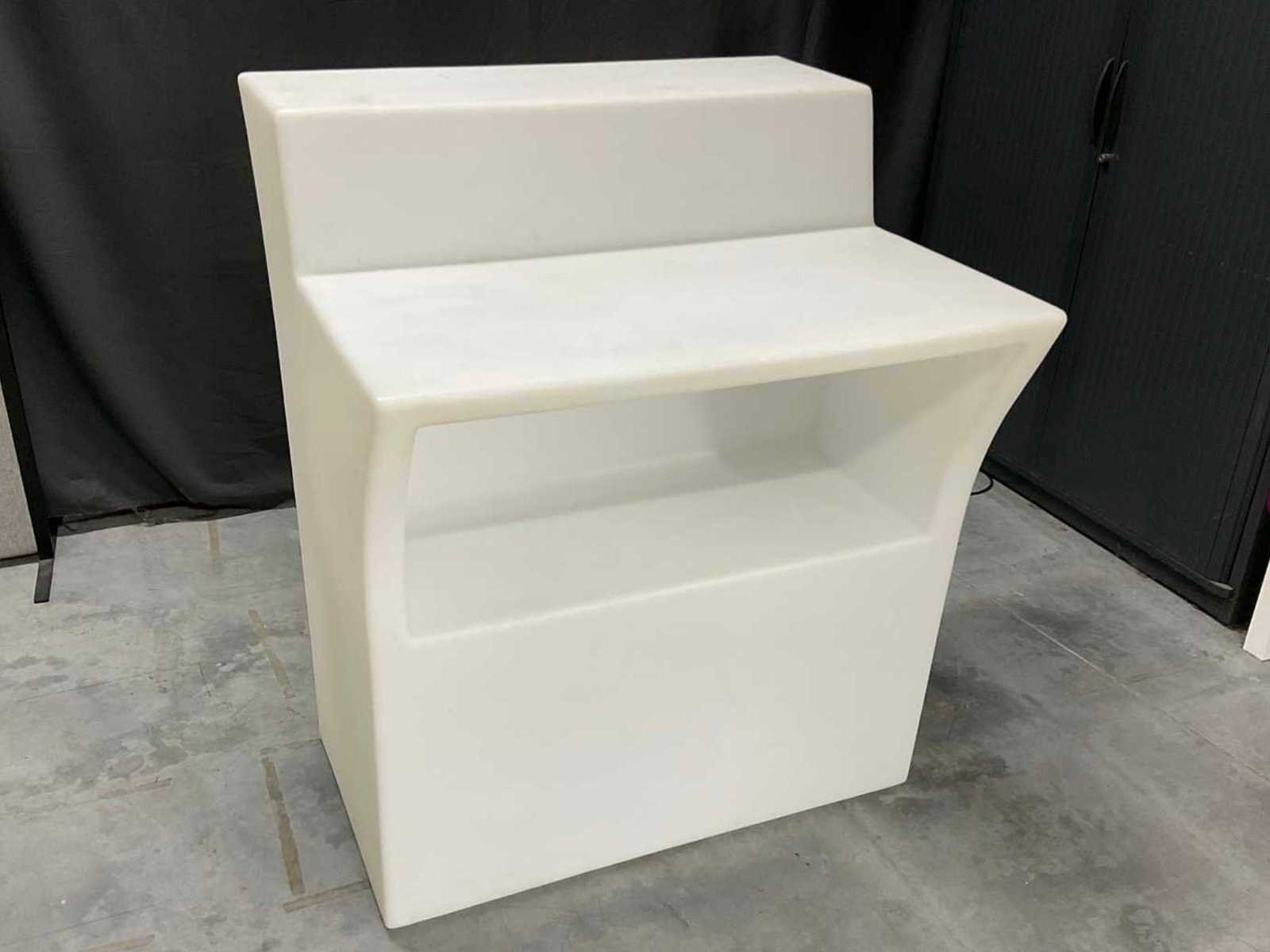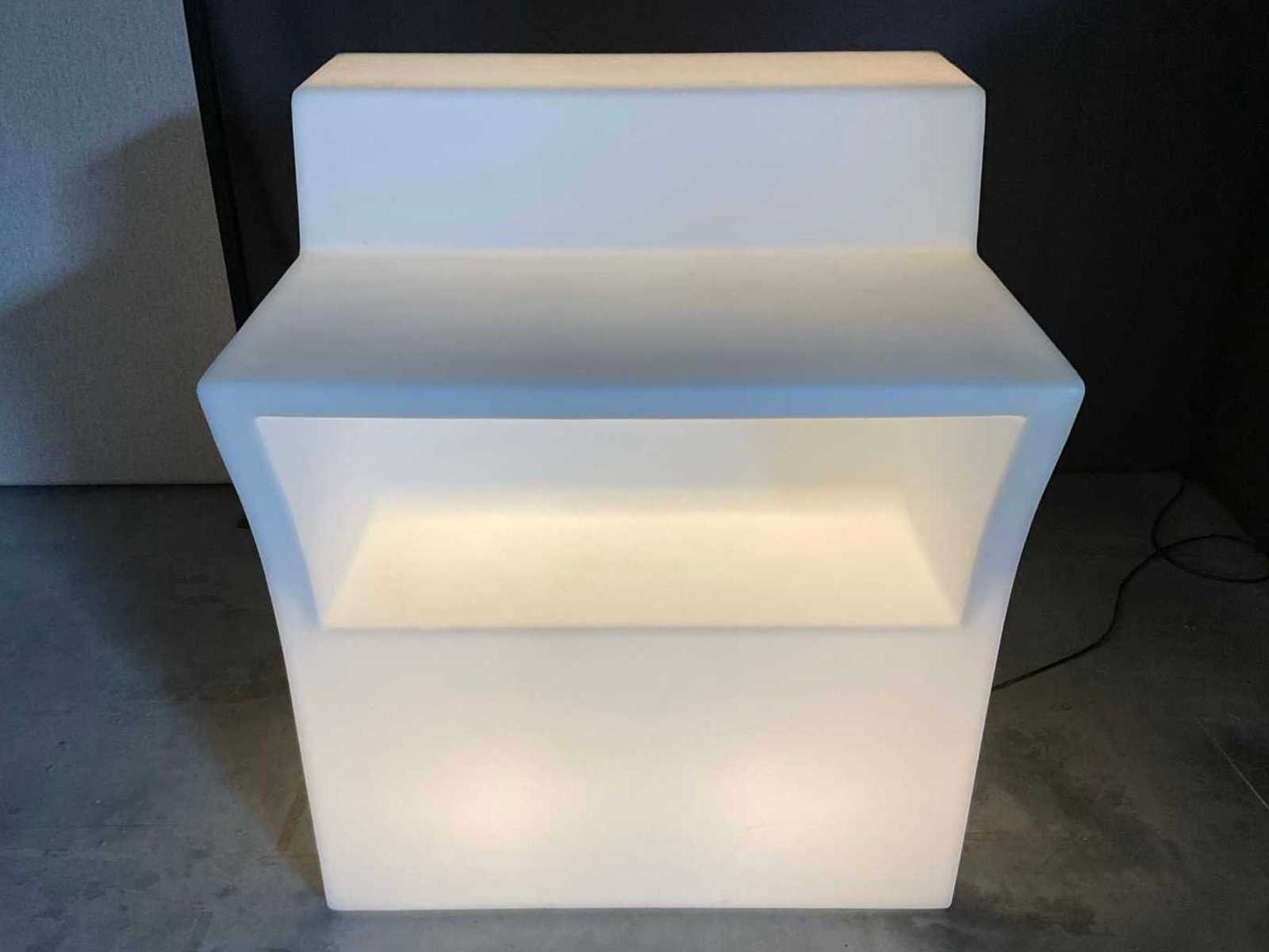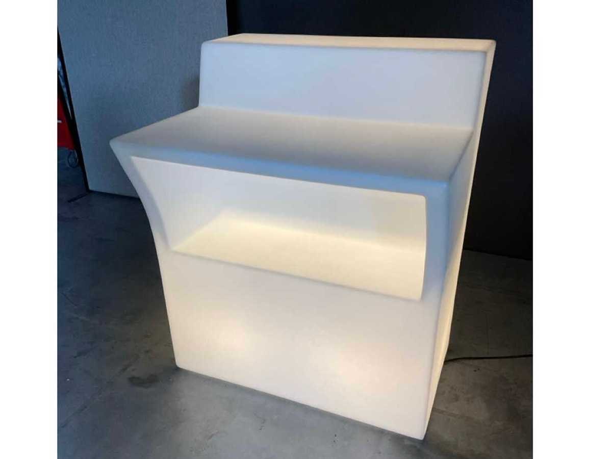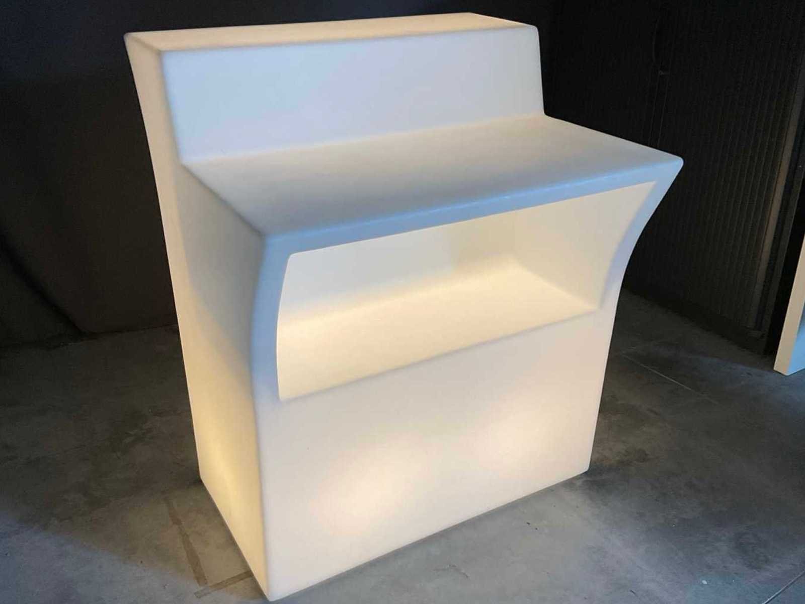 Design by Jorge Nàjera, polyethyleen balie geschikt voor indoor en outdoor Voorzien van ledverlichting 2x 15 Watt Als losse bar of als tussendeel te gebruiken Dj Booth Merk: Slide studio Type: Jumbo Totale afmeting L: 89cm Totale afmeting Breedte: 77cm Totale afmeting Hoogte: 110cm Kunststof: true