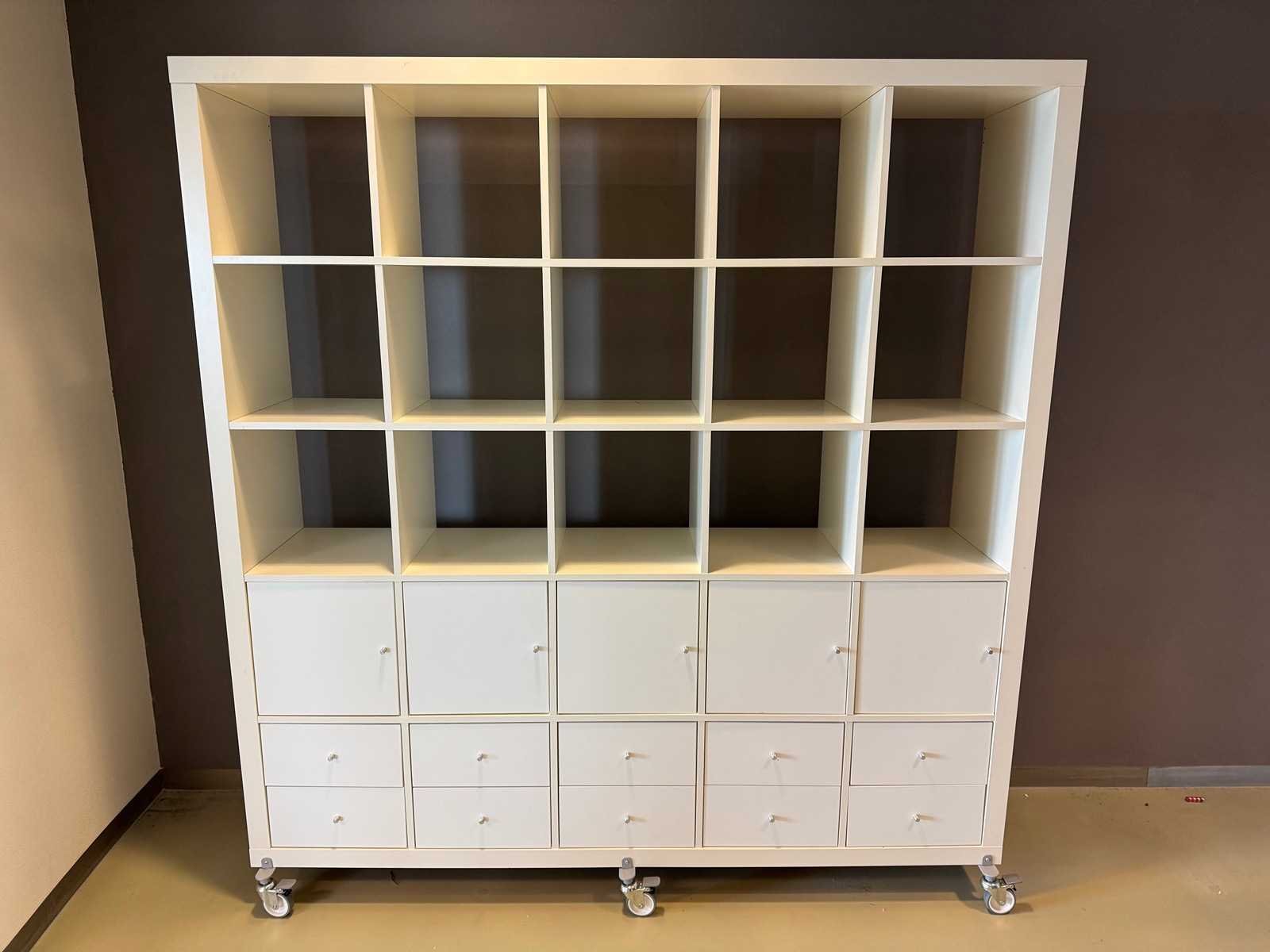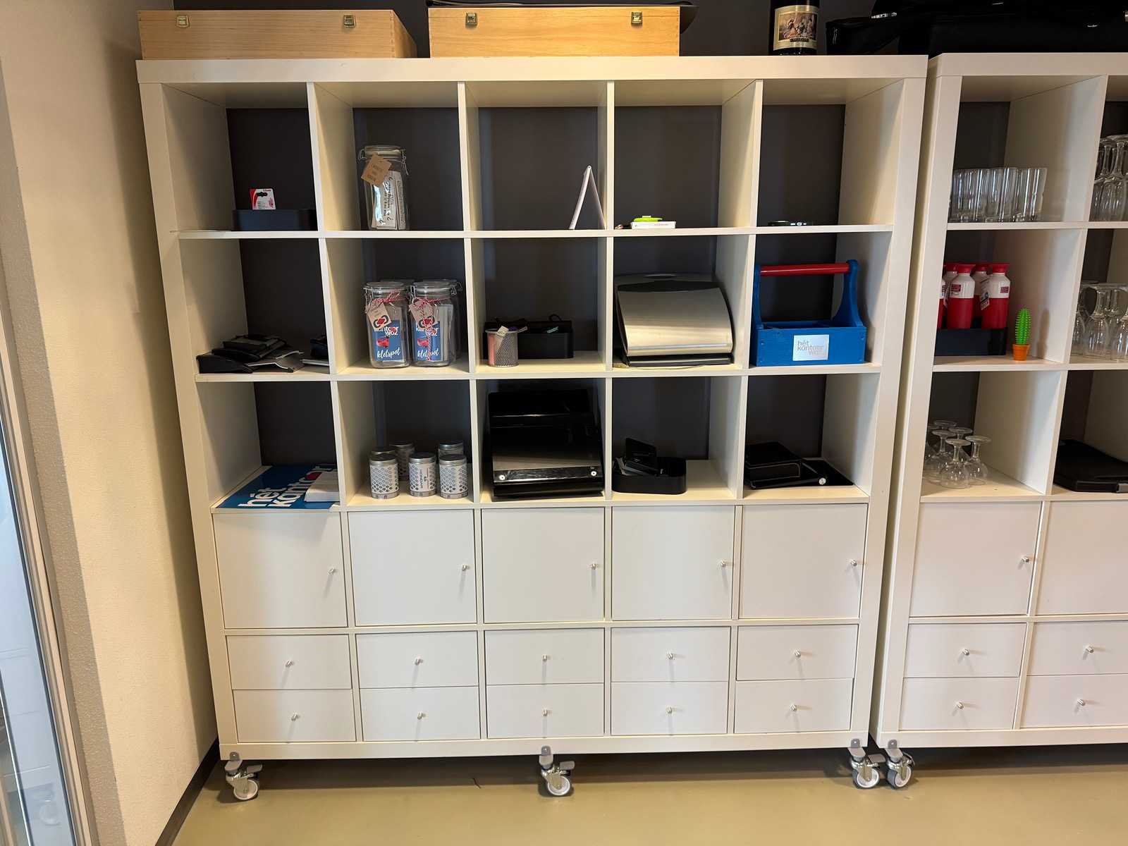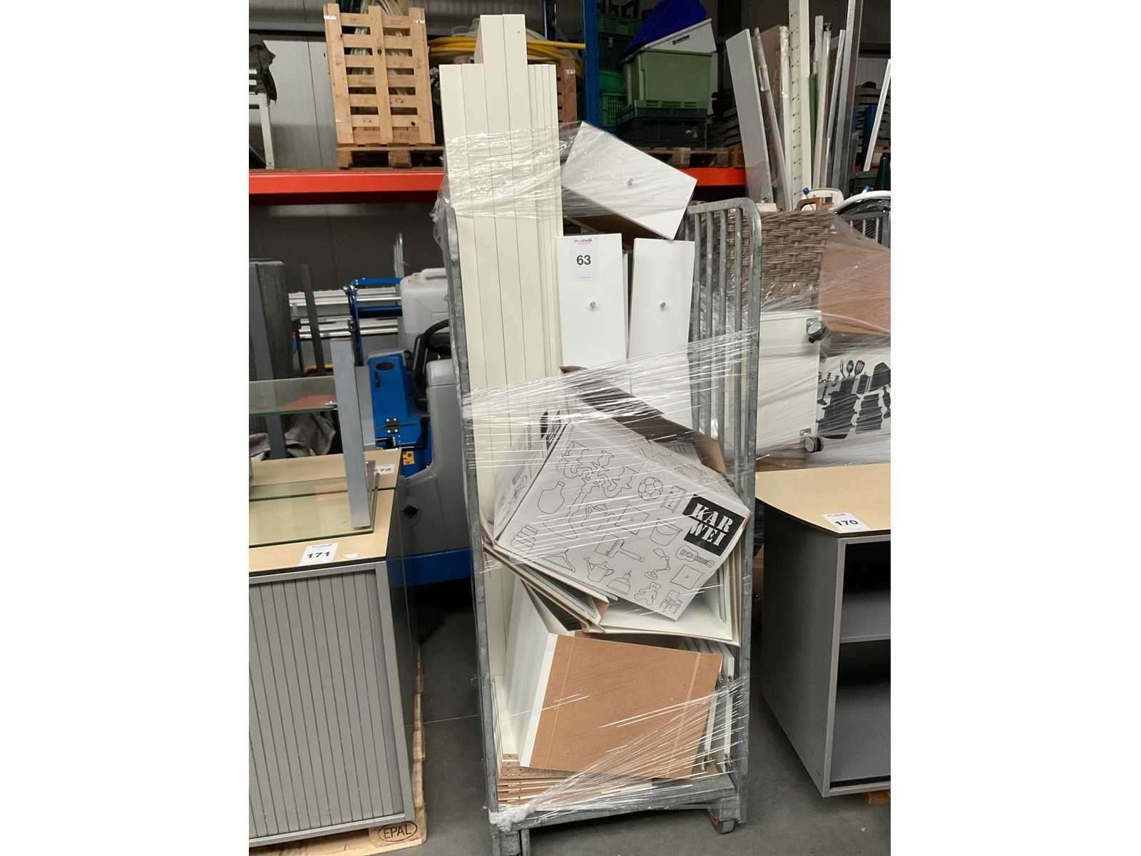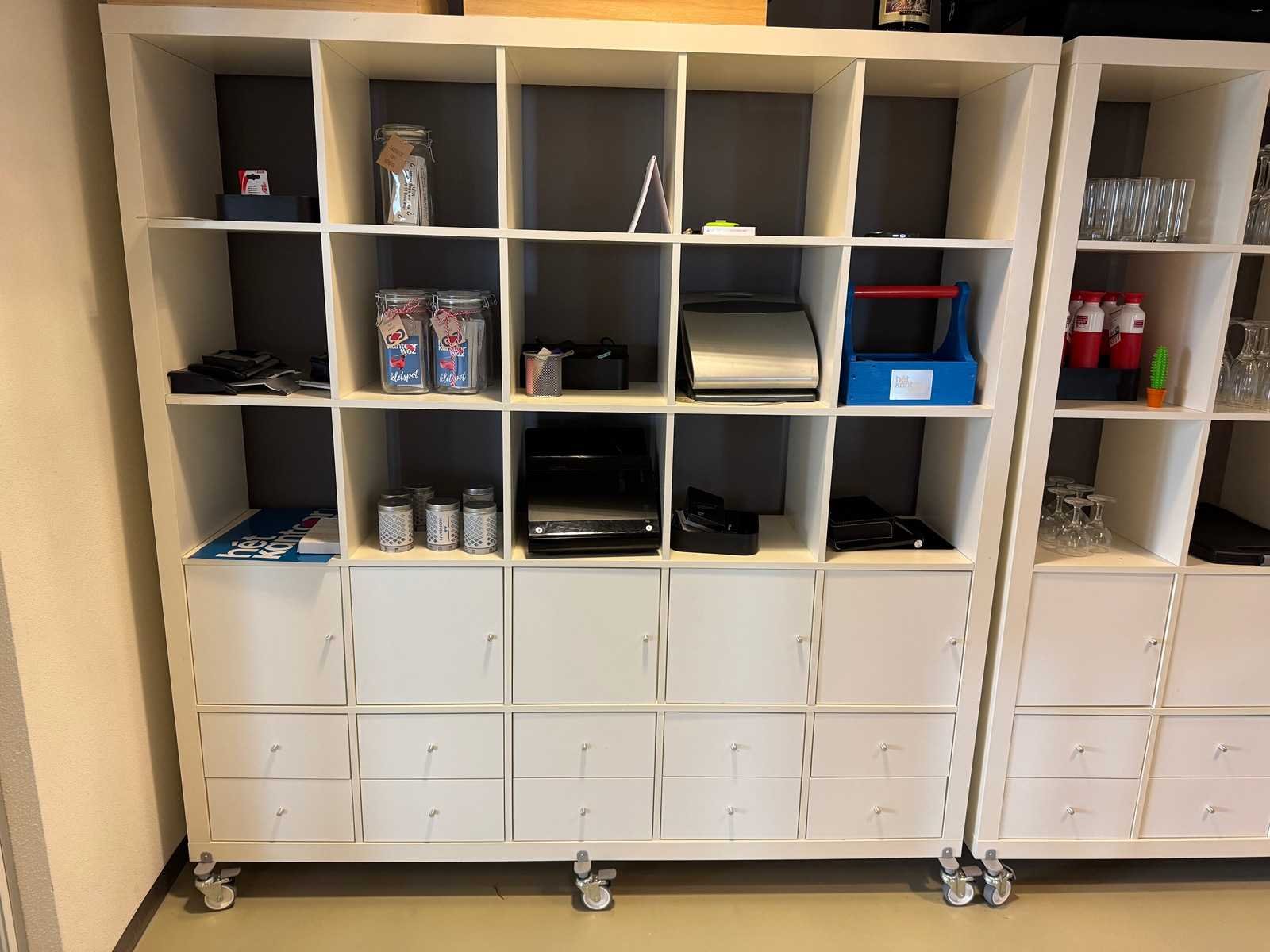 Verrijdbaar, voorzien van open vakken en vakken voorzien van deurtjes Inhoud niet inbegrepen Reeds gedemonteerd