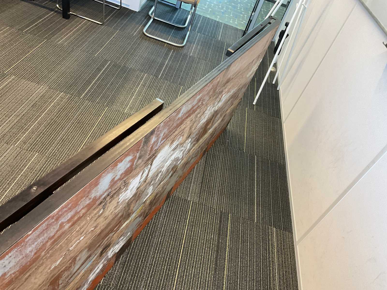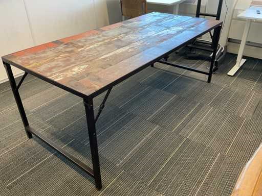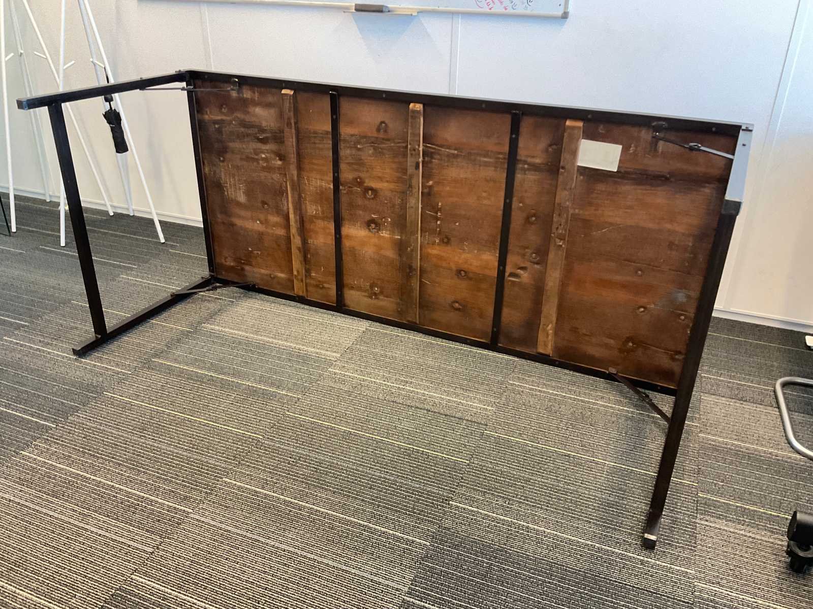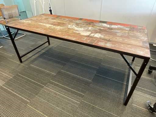 Vergadertafel opklapbaar voorzien van metalen onderstel en boothouten blad Stoelen niet inbegrepen Lengte: 200cm Breedte: 90cm Hoogte: 76cm