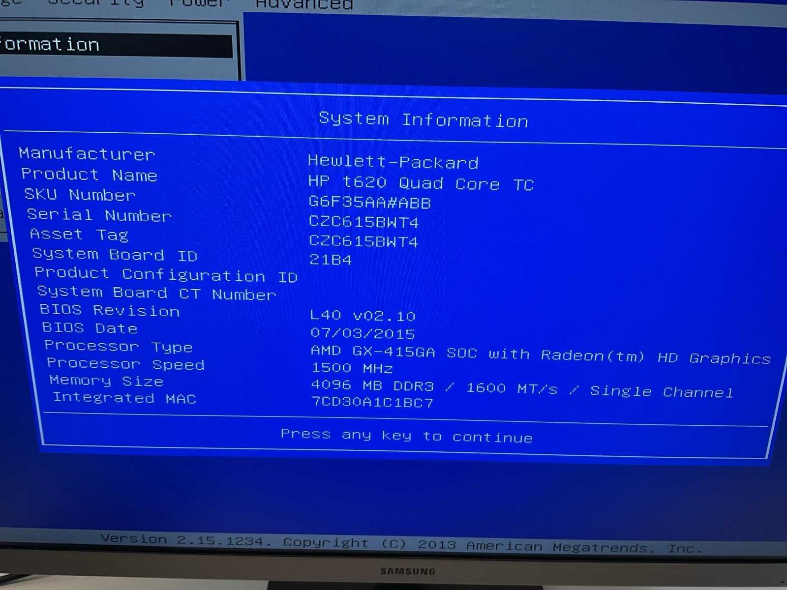 Merk: HP Type: T620 Model: Quad core Processor type: AMD GX-415 Radeon Processor snelheid: 1.5Ghz RAM Geheugen: 4GB Opslagcapaciteit: 16GB Met voedingskabel: true Met adapter: true Beeldscherm type: Samsung Beelddiagonaal: 24''