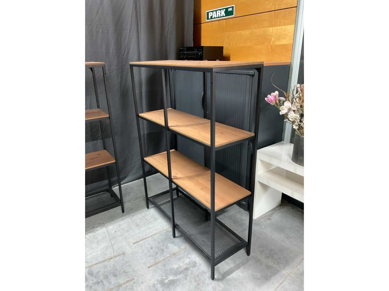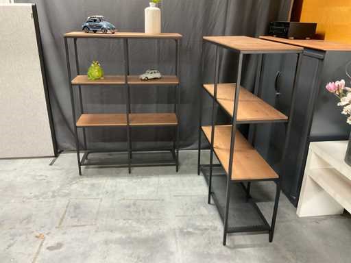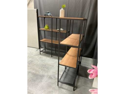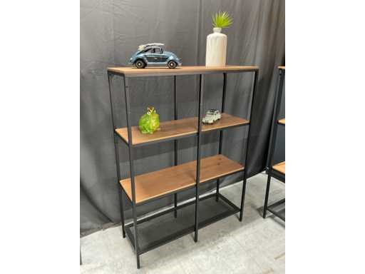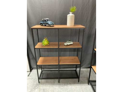 Stelling kast voorzien 4 niveaus, w.o. 3 houten legborden Decoratie niet inbegrepen Lengte: 100cm Breedte: 36cm Hoogte: 136cm