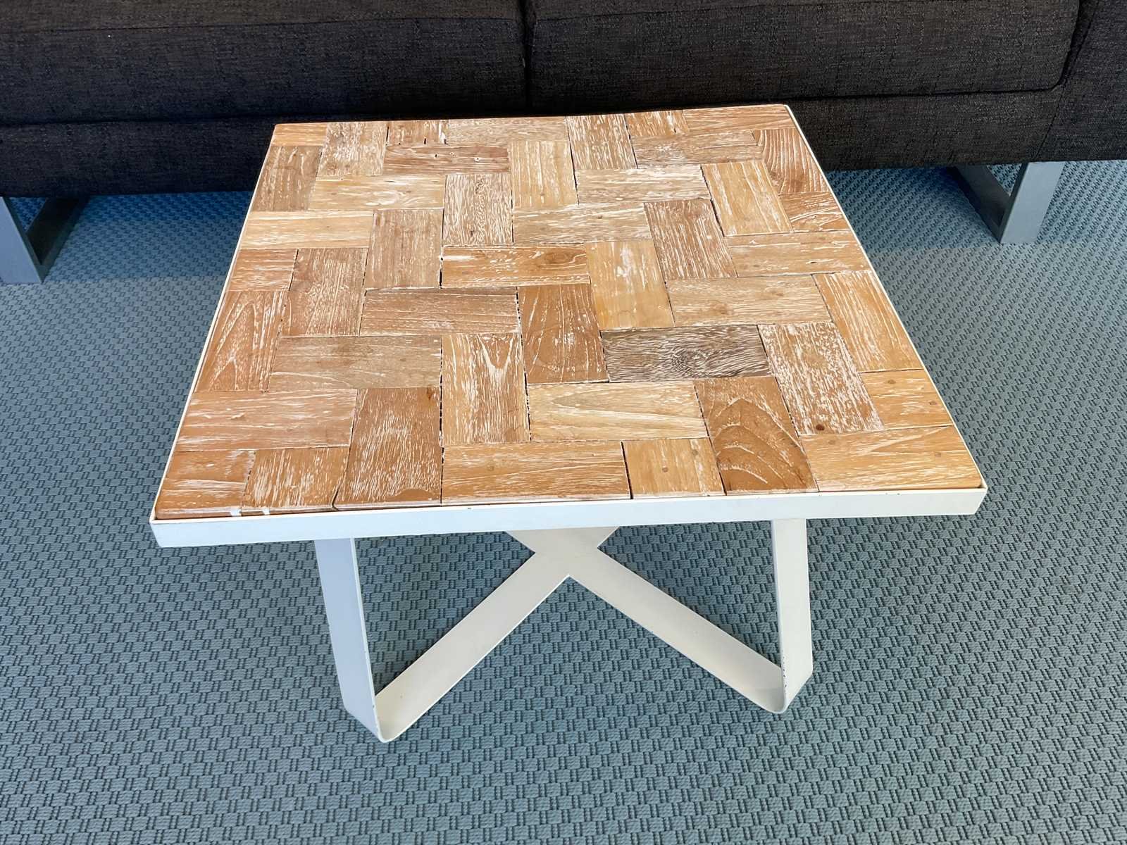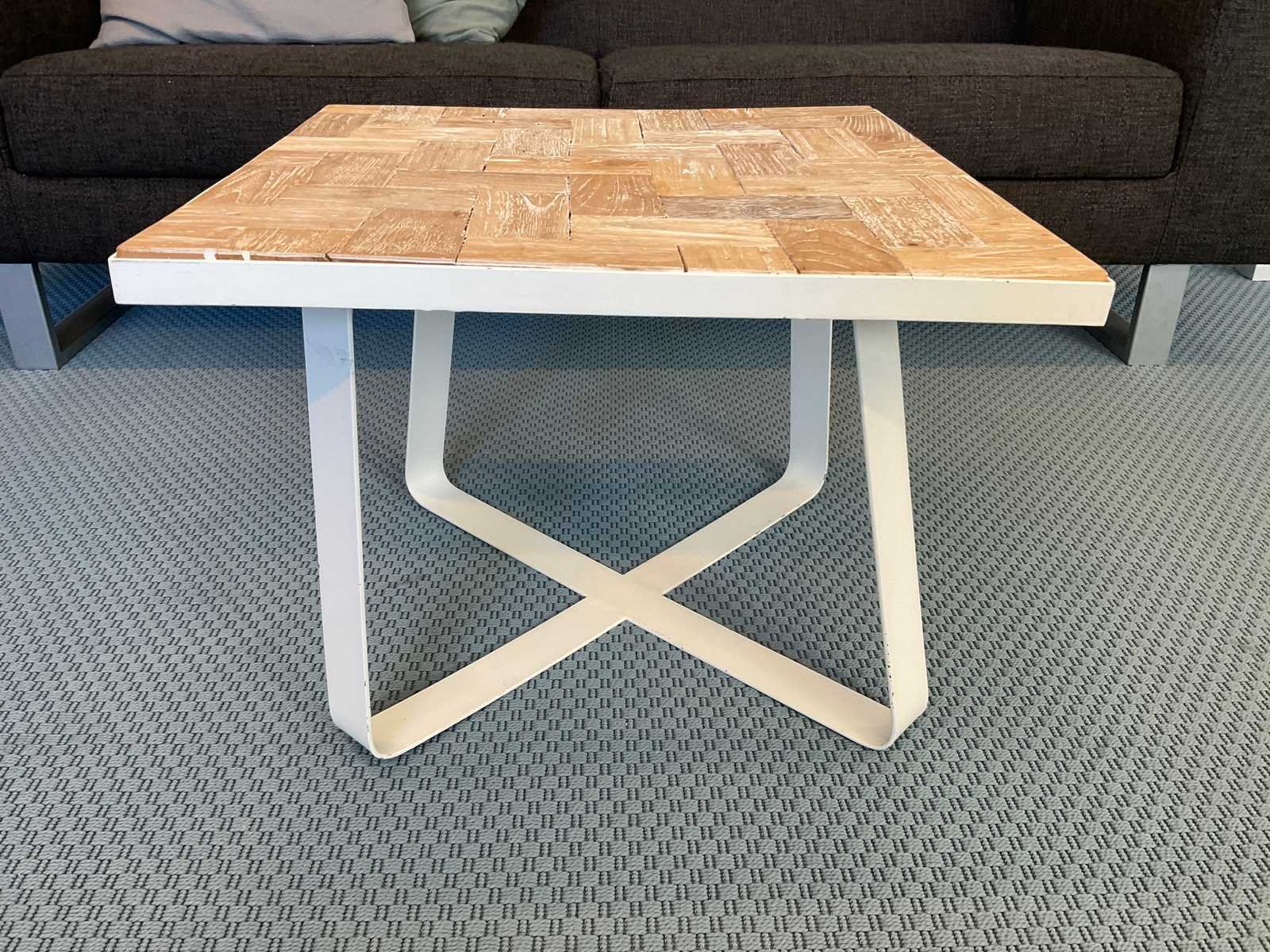 Voorzien van houteb blad en stalen onderstel Lengte: 55cm Breedte: 55cm Hoogte: 41cm