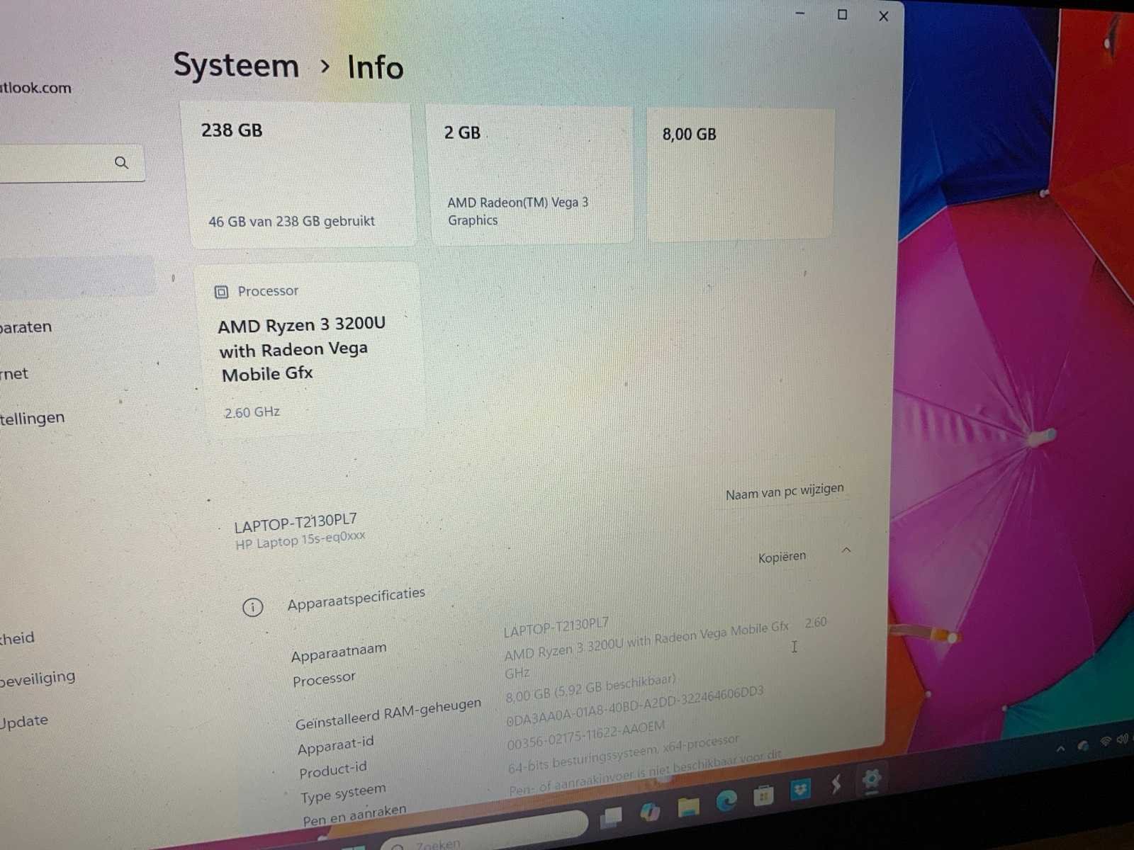 Voorzien van windows installatie Merk: HP Type: 15s Processor type: AMD ryzen 3 Processorsnelheid Ghz: 2,6 RAM Geheugen: 8GB Totale opslagcapaciteit: 238GB Met adapter: true Beelddiagonaal: 15'' Wifi: true USB-Type: A en c USB poorten: 3 Card reader: true Koptelefoon aansluiting: true Webcam: true HDMI: 1