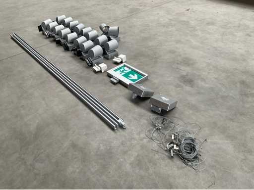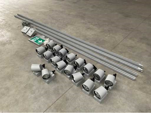 Bestaande uit 2x 3 meter rails, 2x 2 meter rails, 1x Famo star noodverlichting uitgang bord, 2x Famostar velo VS va-2 noodverlichting led spots, 2x power gear gezekerde stopcontacten, 18 stuks led spots 4000 lumen 31 watt en bevestiging kabels. Set bevat geen connectoren Merk: Oktalite Model: Kalo Met lichtbron: true