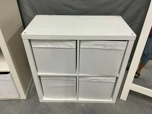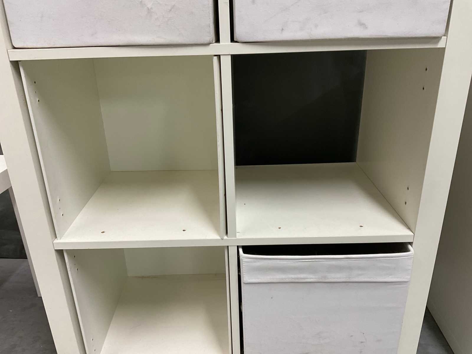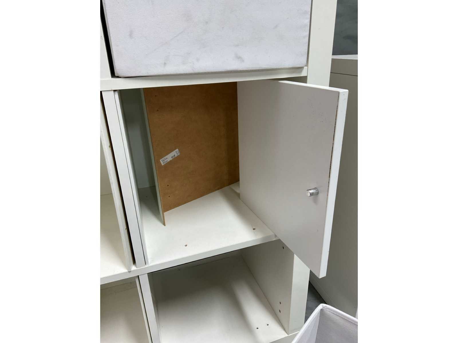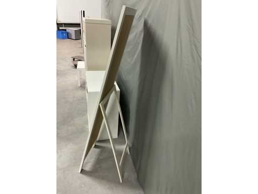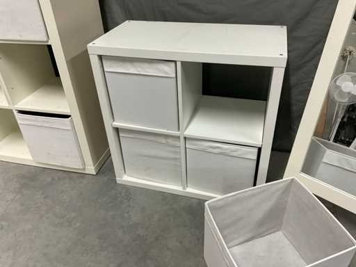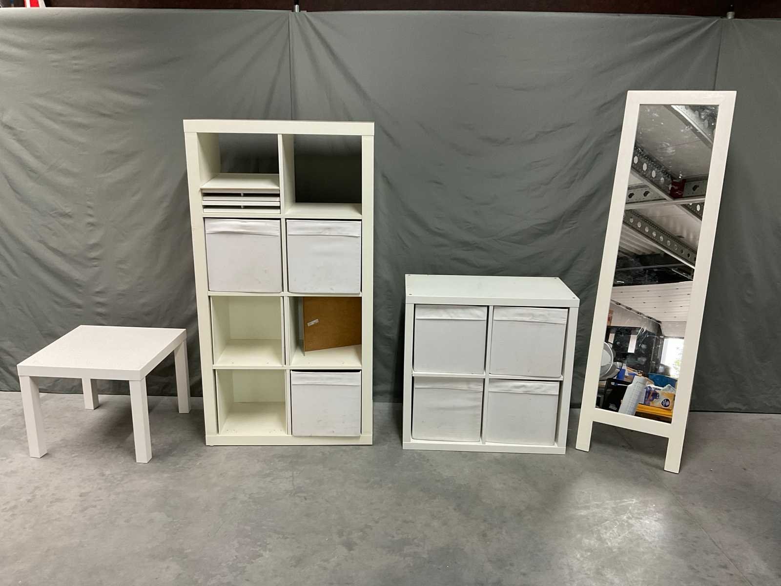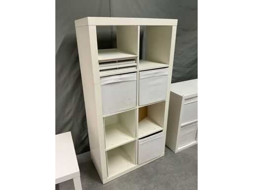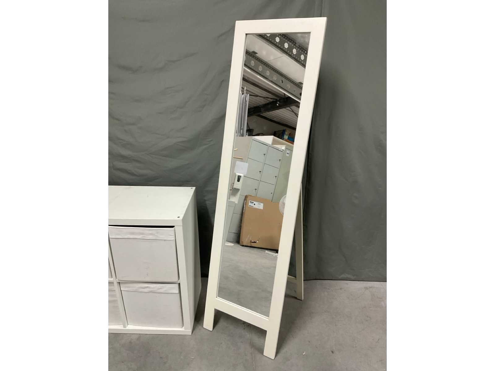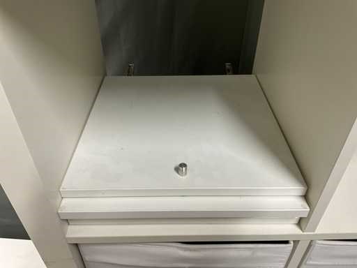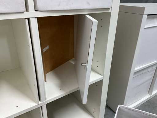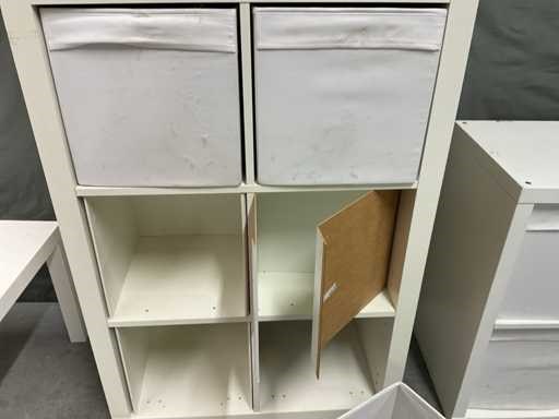 Bestaande uit spiegel in houten omlijsting open vakkenkast afm ca. 77x39x76 cm voorzien van uitneembare gestoffeerde bakken Open vakkenkast afm ca. 79x39x150 cm voorzien van 3 uitneembare gestoffeerde bakken en onderdelen om dichte delen te maken bestaande uit 3 bakken en 3 deurtjes (bevestigingsmaterialen niet aanwezig)