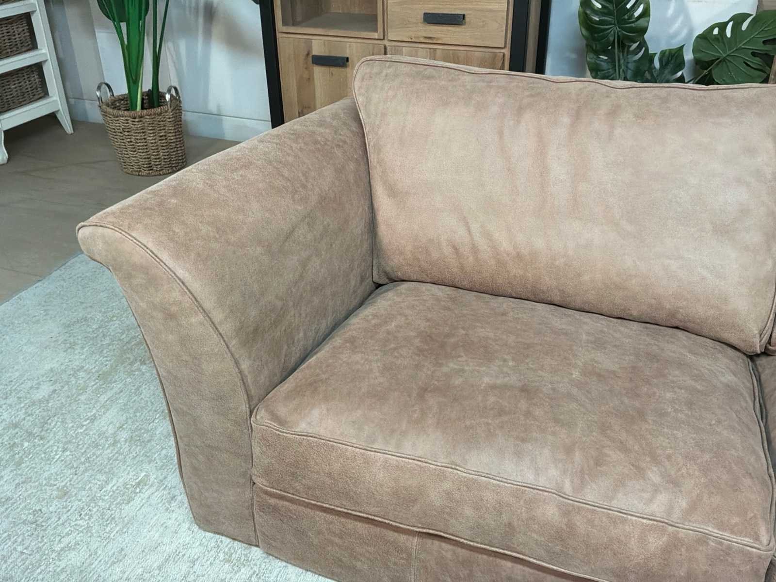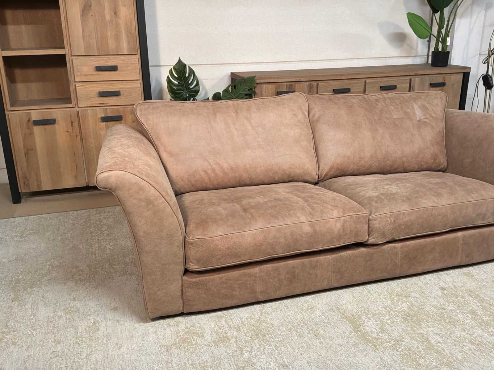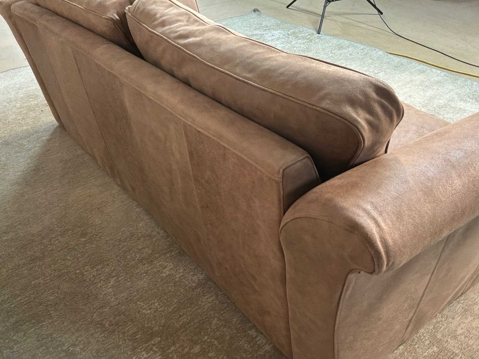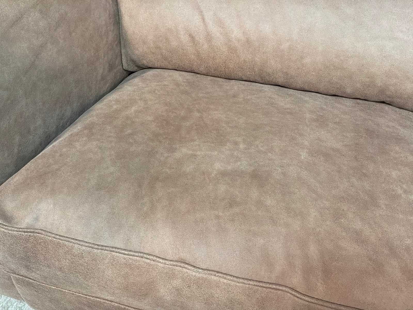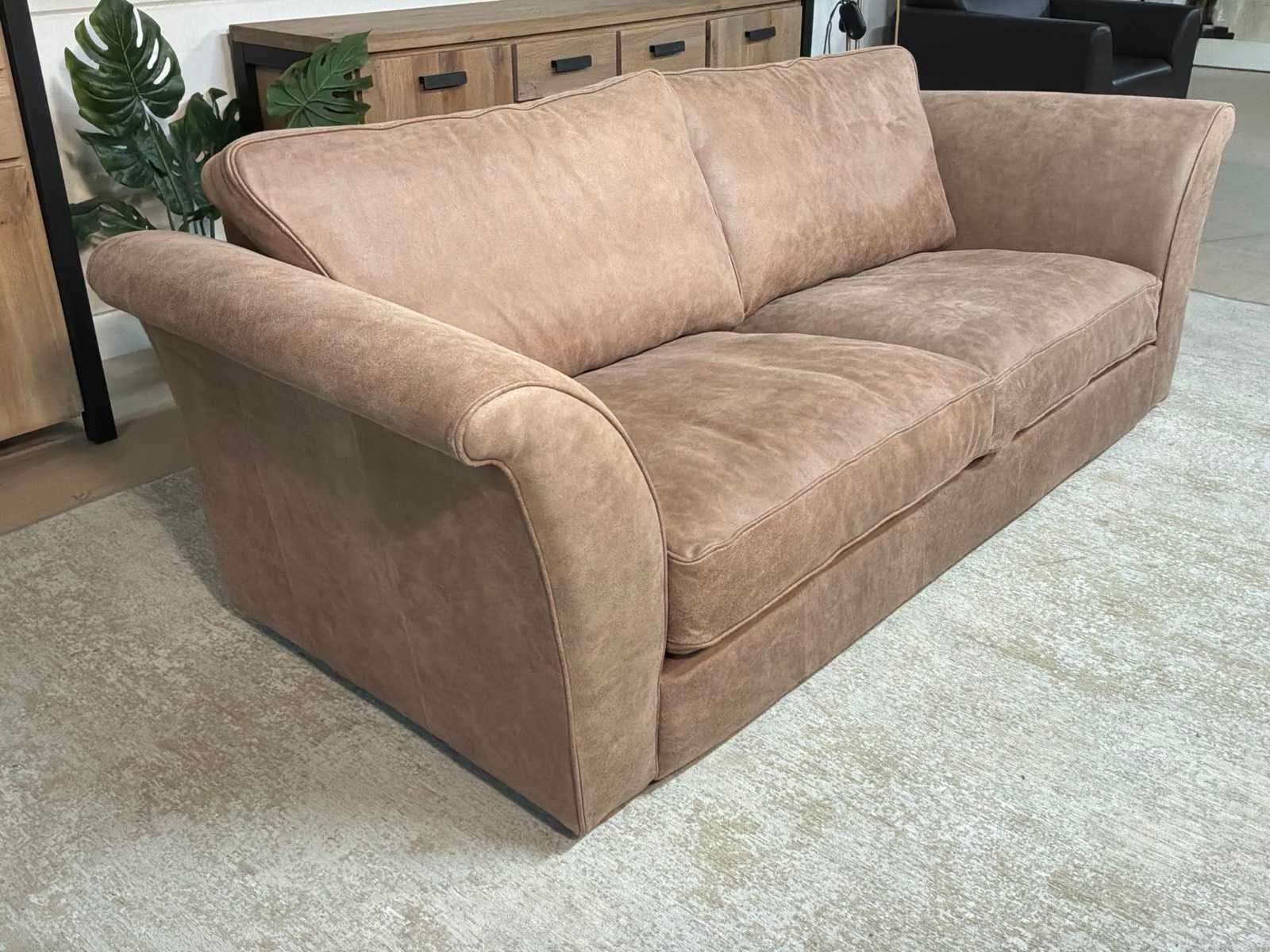 Mist 1 pootje. Model: Savannah Kleur: Bruin Lengte: 95cm Breedte: 220cm Hoogte: 75cm Materiaal: Geborsteld leer